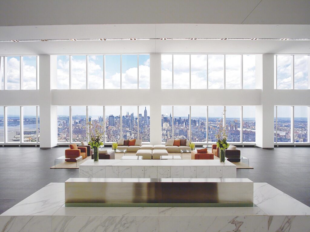 By its choice of layout the entrances to the building stand on all 4 sides, helping to integrate both staff, tenants, and visitors alike with ease without compromising on security. Visually this tower has a number of features that stand out or remain consistent. Some examples include the base of the building which is identical in size to the original Twin Towers. This is further emphasized by the choice in materials such as it’s shimmering prismatic glass that is capped by 69 stories of glass and steel which have been wrought into triangles that culminate into a grand octagon that forms the core of the system. All of which is crowned by a square glass crystalline parapet that captures the light and refracts it throughout the day to great effect.