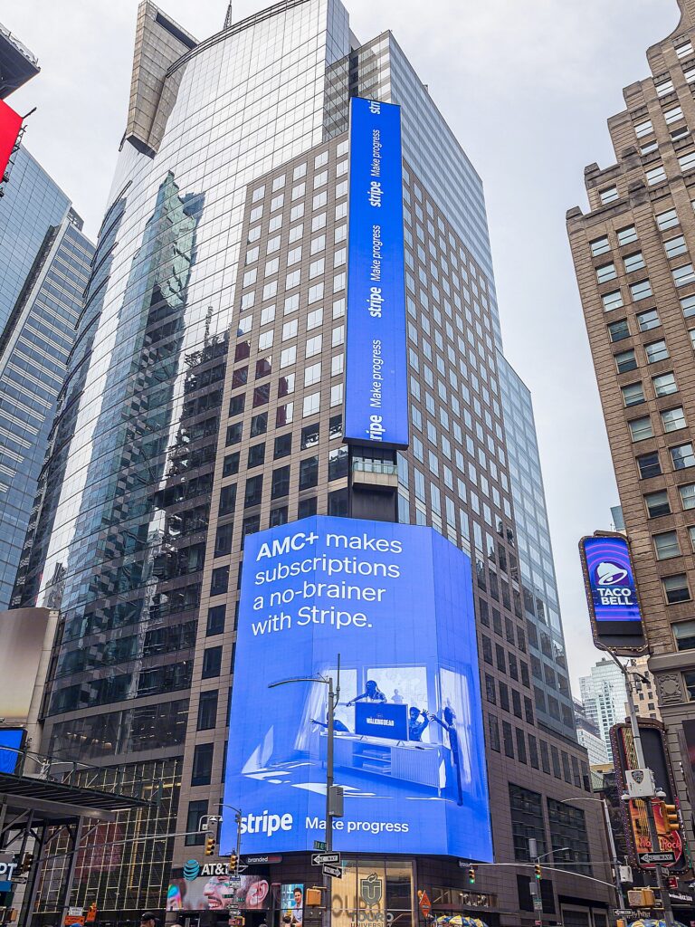 The building’s exterior presence is a defining feature within Times Square, incorporating large-scale digital signage, including a multi-story LED display and integrated broadcast screens that contribute to the surrounding commercial environment. Retail and lobby design elements activate the base of the building, aligning with the high-traffic nature of the location.