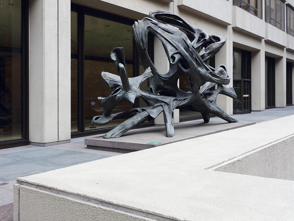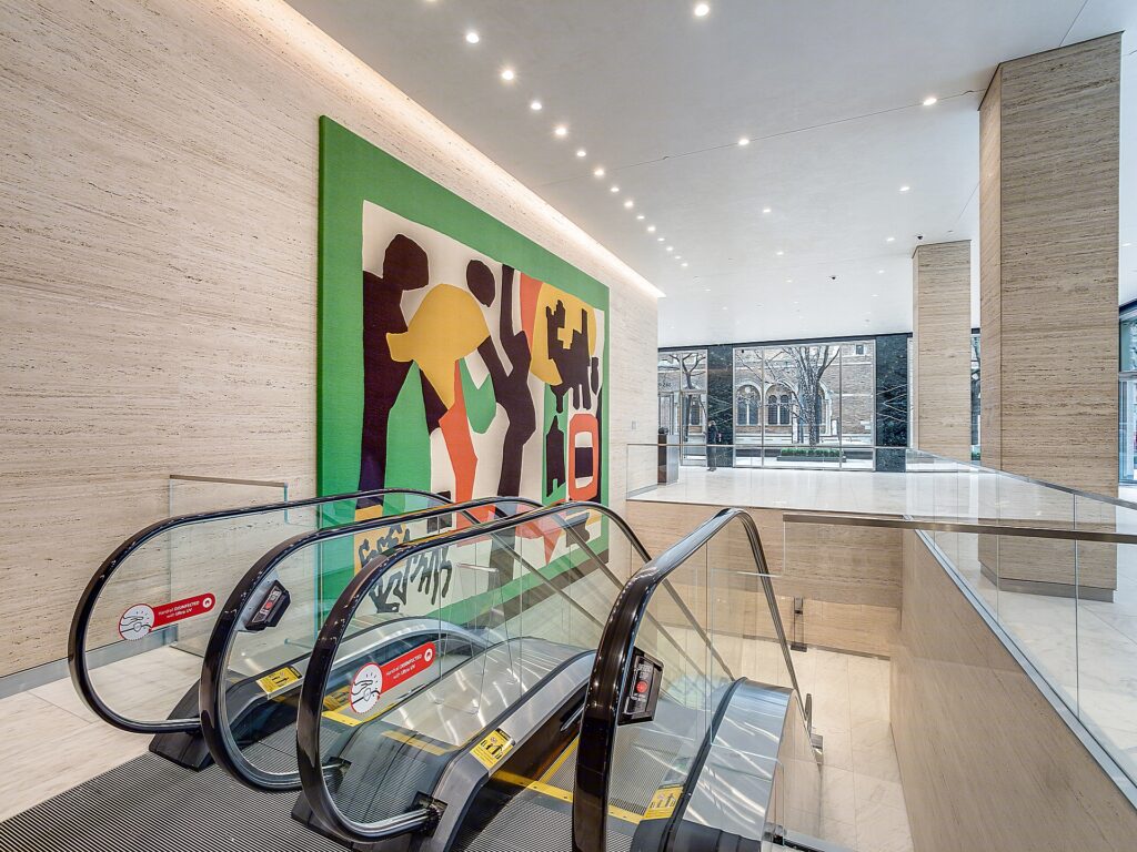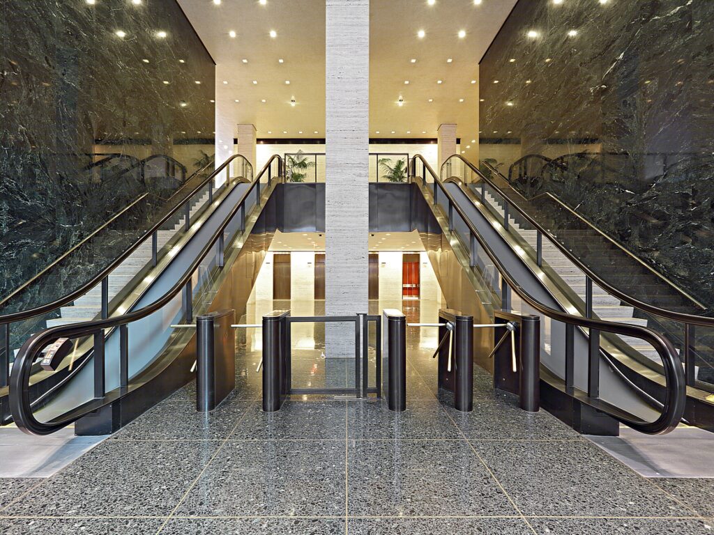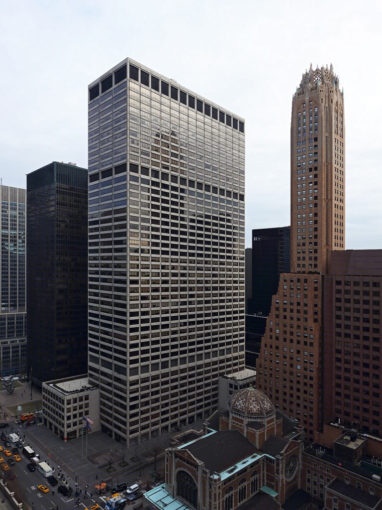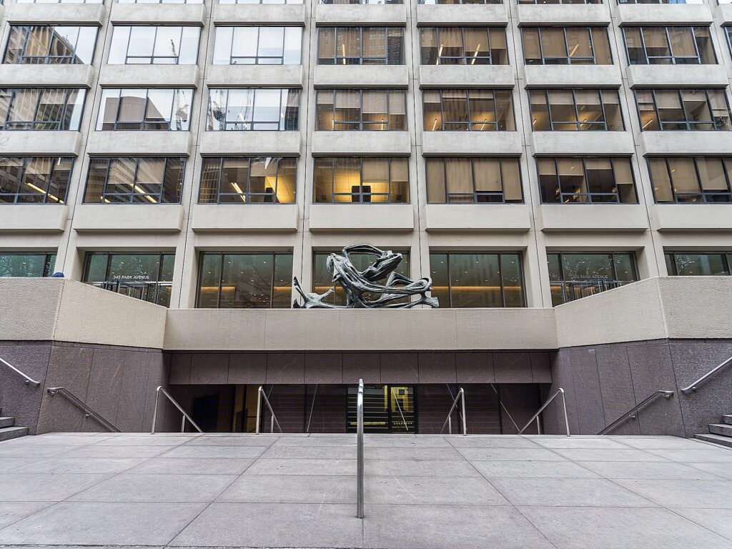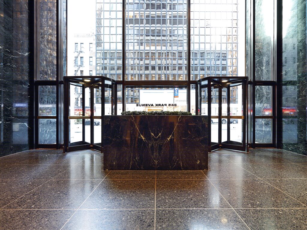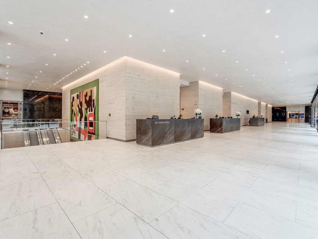The property at 345 Park Avenue doesn’t fit either mold – but rather stands as its own distinct presence pointed by its white stark concrete façade matched to dark glass panes. Creating a difference by which the focus is brought away from the Seagram’s to that of the Park Avenue property instead. The building’s frontage furthermore is differentiated by its angular concrete components that seemly meet the sky though not as raised or rough as the former Pan Am building; all in all the property at 345 stands as a behemoth to both function and design.