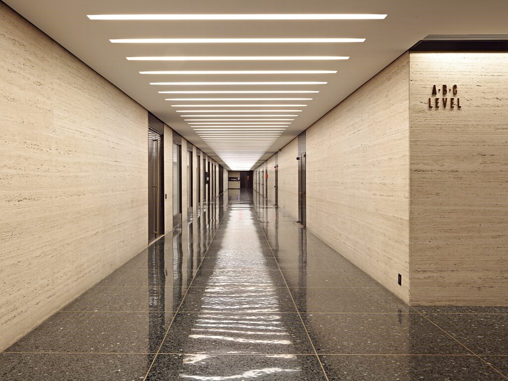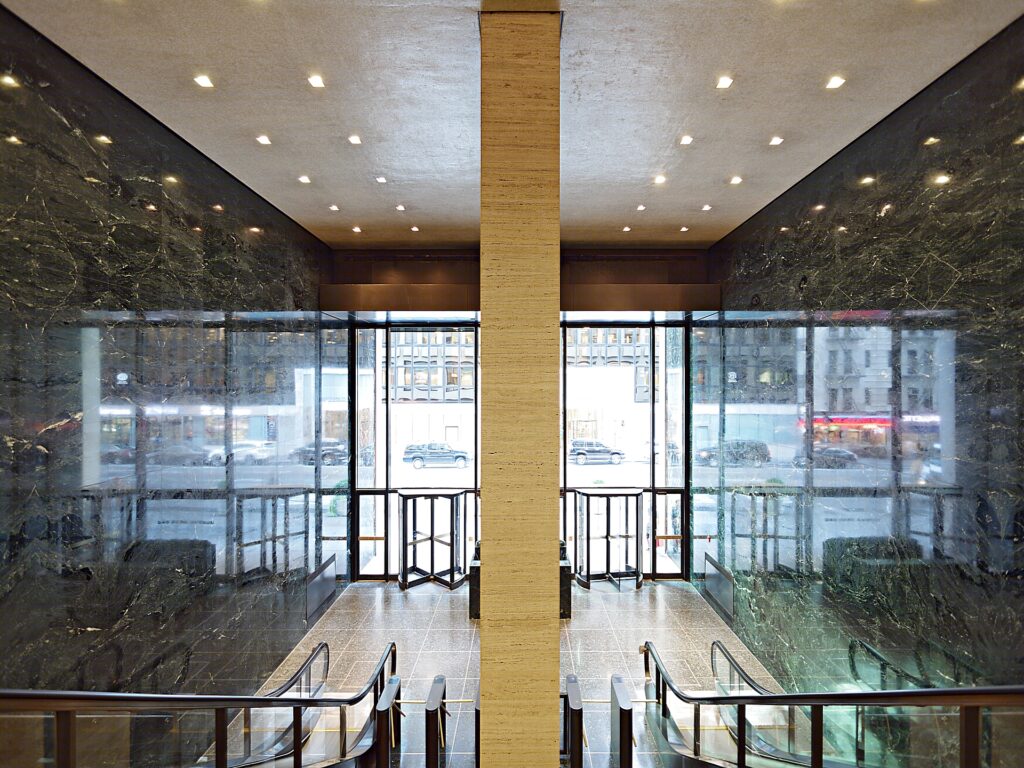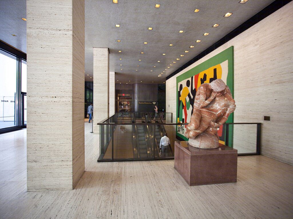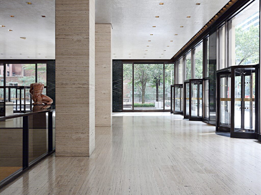 The shear mass of the exterior of 345 Park Avenue looms over the surrounding neighborhood which also hosts the General Electric Tower to its south while the Seagram Building to the north stands at its other side. The bold white appearance of the building was chosen to contrast against its neighbors most notably the Seagram’s.