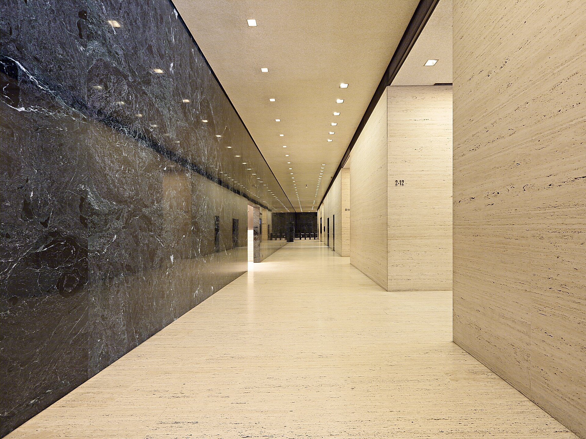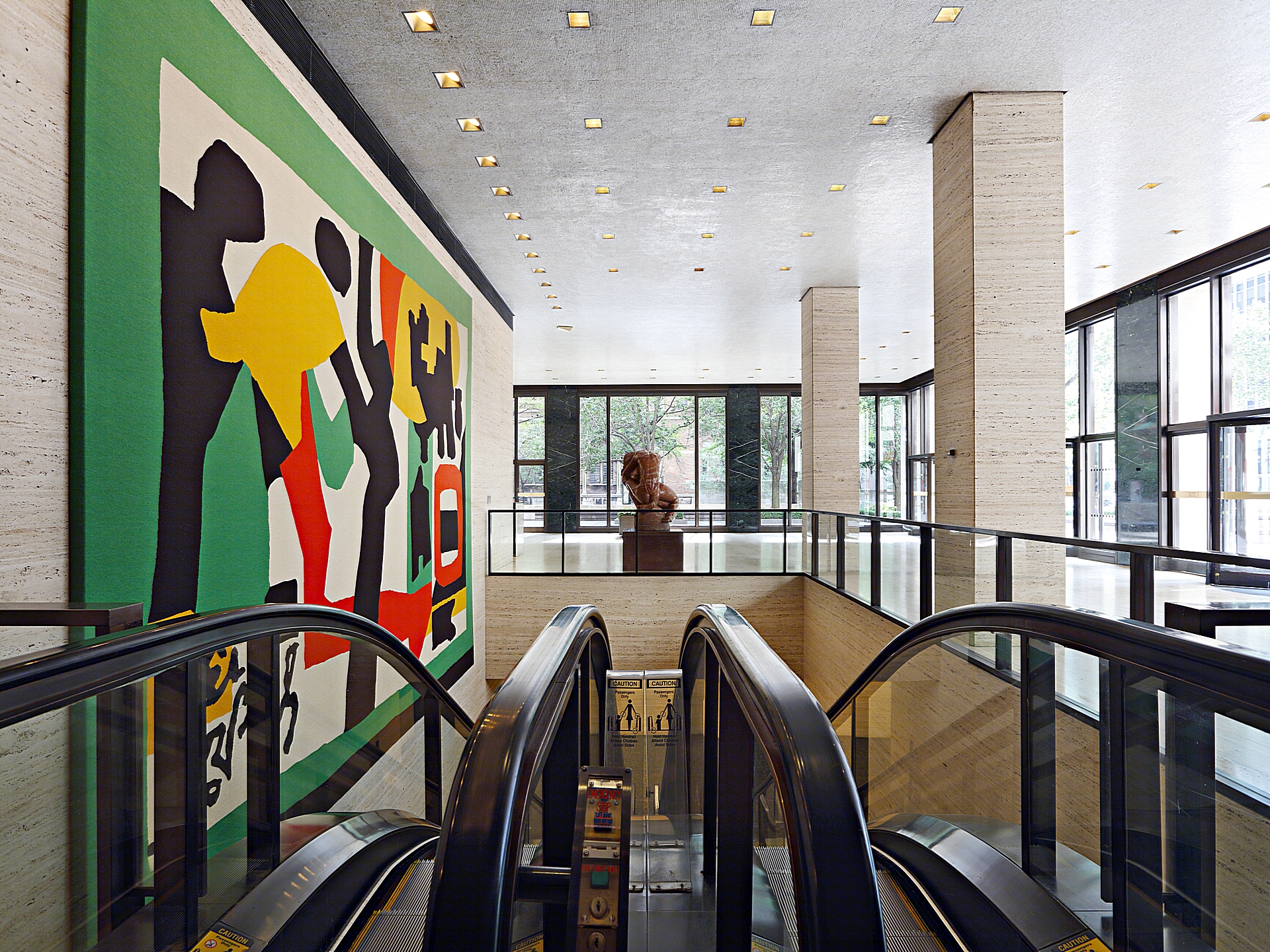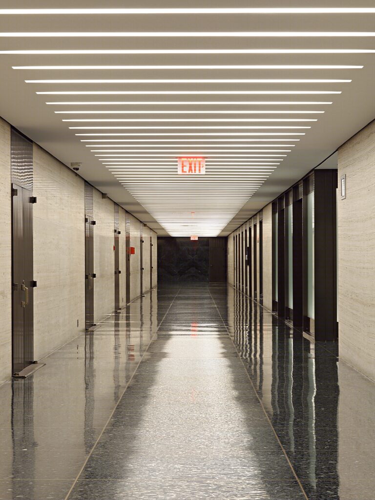 The shear mass of the exterior of 345 Park Avenue looms over the surrounding neighborhood which also hosts the General Electric Tower to its south while the Seagram Building to the north stands at its other side. The bold white appearance of the building was chosen to contrast against its neighbors most notably the Seagram’s.