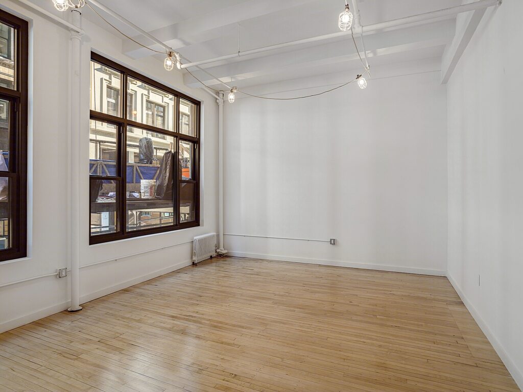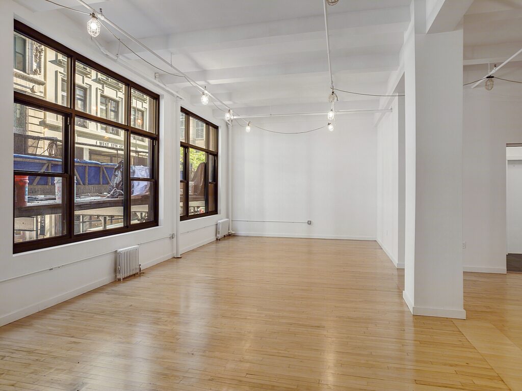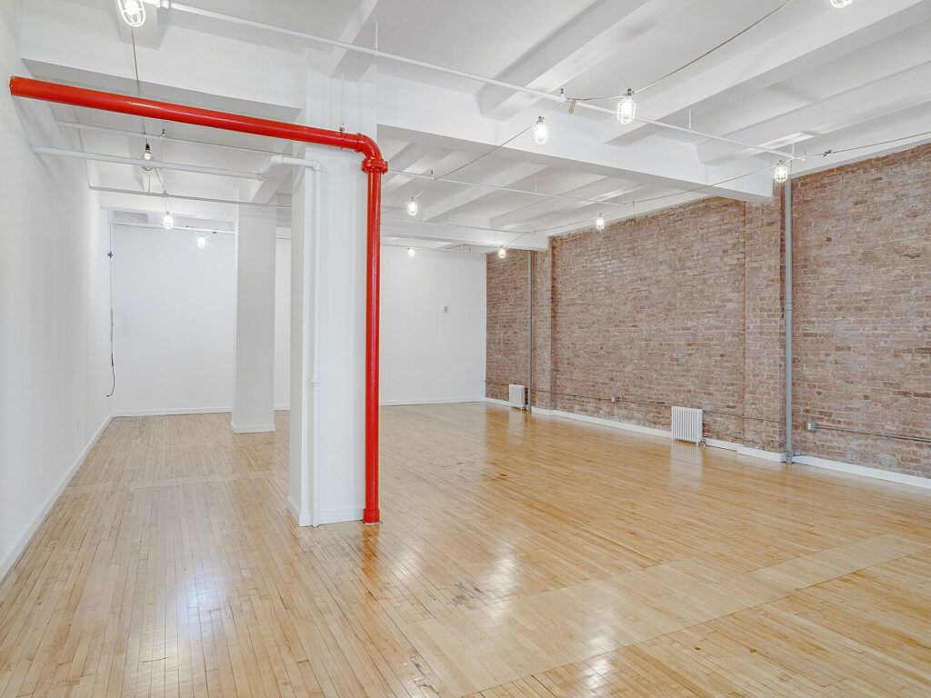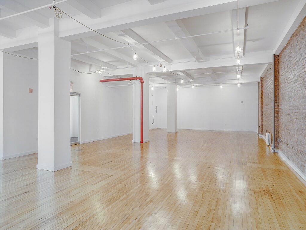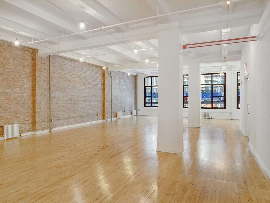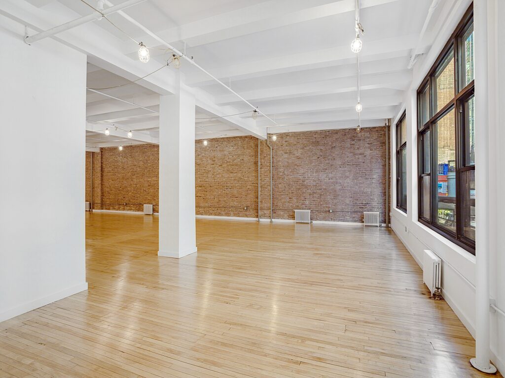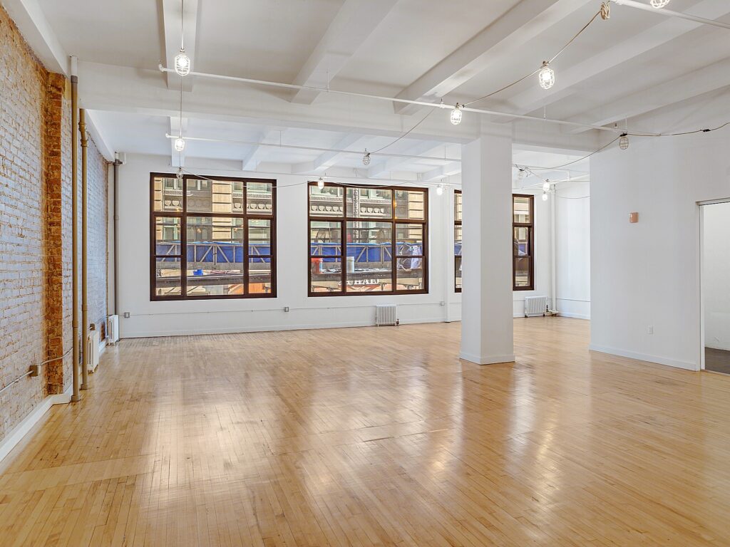 Along one full side of the space, a series of large, newly installed bay windows lines the perimeter, bringing consistent daylight deep into the floorplate and offering an appealing outlook over the surrounding Garment District streetscape. These windows also provide the opportunity to introduce perimeter glass-front offices or meeting rooms if a tenant elects to build out enclosed spaces, with the layout easily supporting the addition of approximately three to five perimeter rooms for private offices, small conference rooms, or showroom display areas depending on operational needs. The opposite wall is defined by an exposed brick surface that runs the length of the space, adding texture and character that pairs with the polished wood flooring to create a classic loft-style aesthetic.