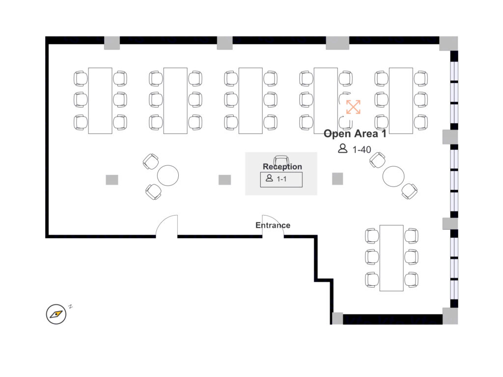 The primary work area stretches across the full depth of the unit, with rows of bench-style desks arranged in parallel runs that maximize usable square footage while maintaining comfortable circulation paths between teams. Structural columns are evenly spaced throughout the floor, creating natural divisions that can be used to subtly organize departments or collaborative clusters without interrupting the openness of the layout. The proportions of the room allow for a balance between density and openness, ensuring that the workstation layout remains functional without feeling compressed.