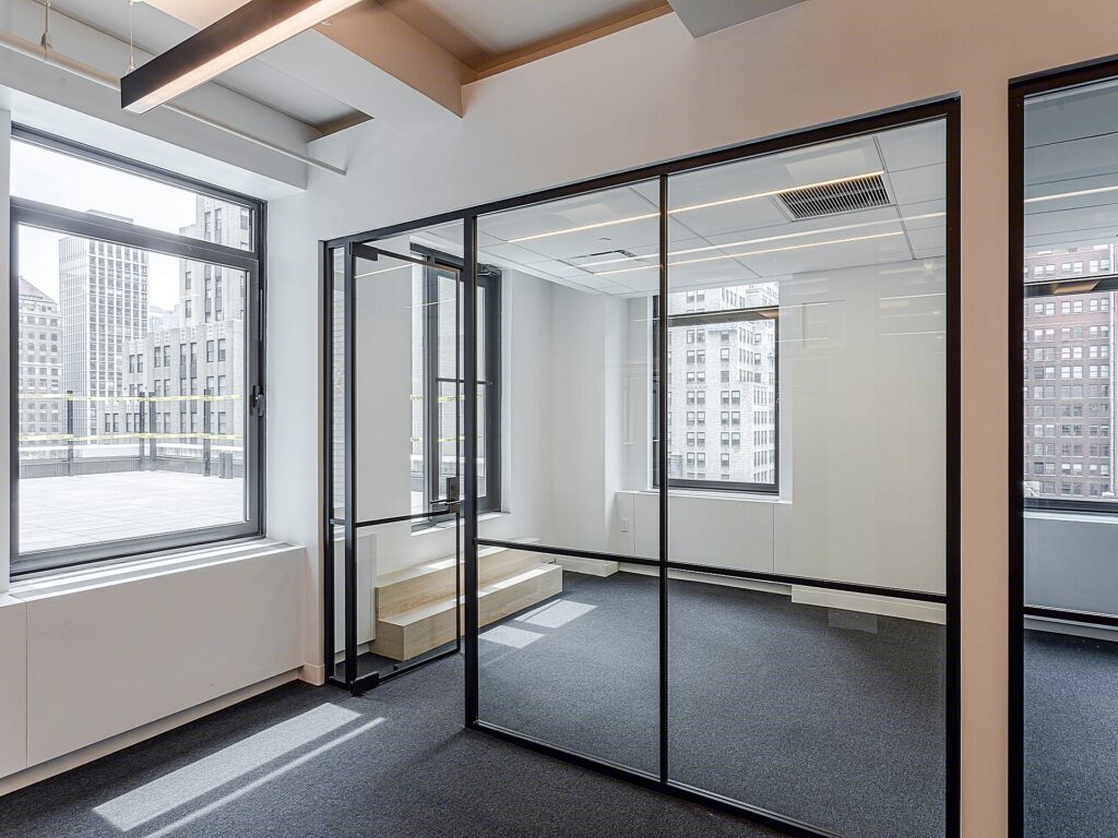 The defining feature of this installation is the large private terrace situated off the main workspace, accessed directly from the interior. This outdoor area is substantial in scale and can accommodate seating, informal meetings, or company events, providing a meaningful extension of the office environment that is rarely available in Midtown Manhattan.