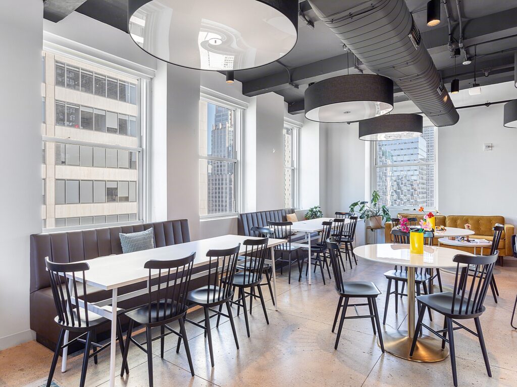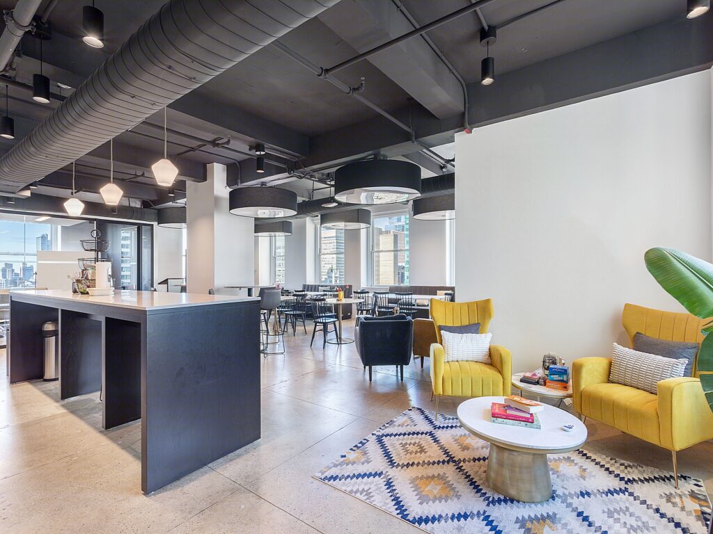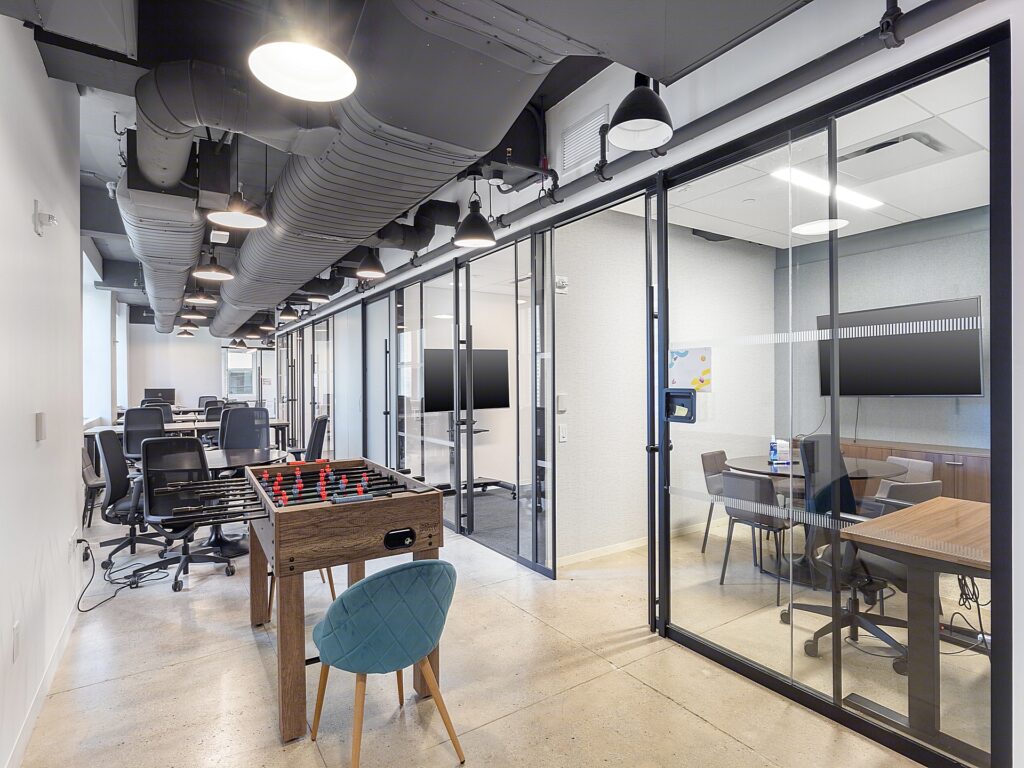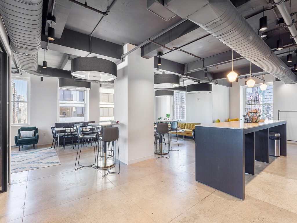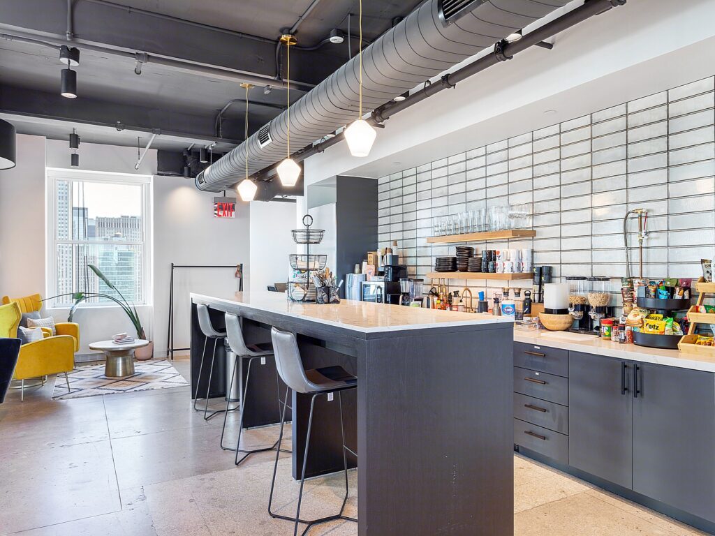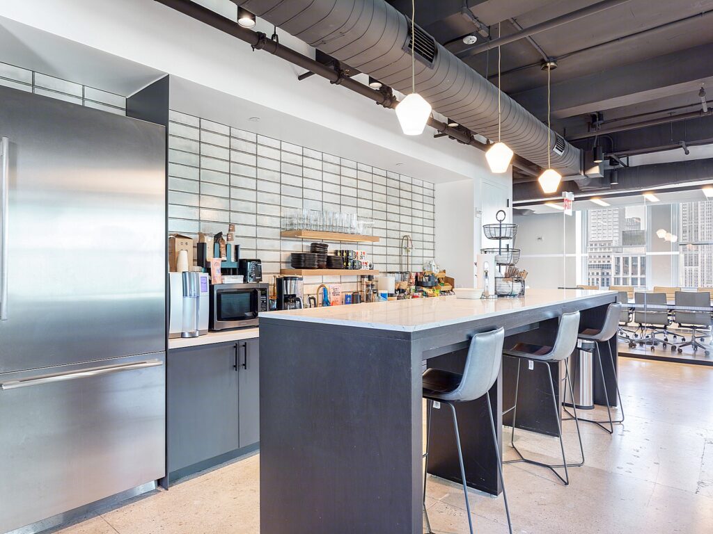 The pantry and kitchen area sits along the side of the floorplate and is built out as a full-service café-style hub, complete with a large island, bar seating, and adjacent lounge and dining areas. This zone is supported by informal seating clusters and soft lounge furniture, creating a social center that doubles as a secondary meeting environment. Nearby breakout areas and a designated game or recreation space further enhance employee engagement and offer flexible collaboration settings outside of traditional workstations.