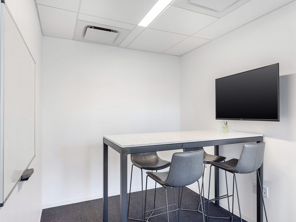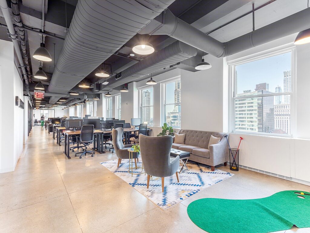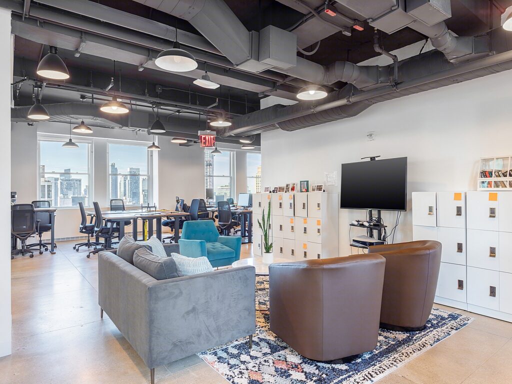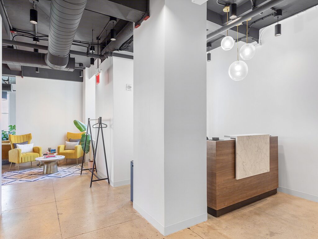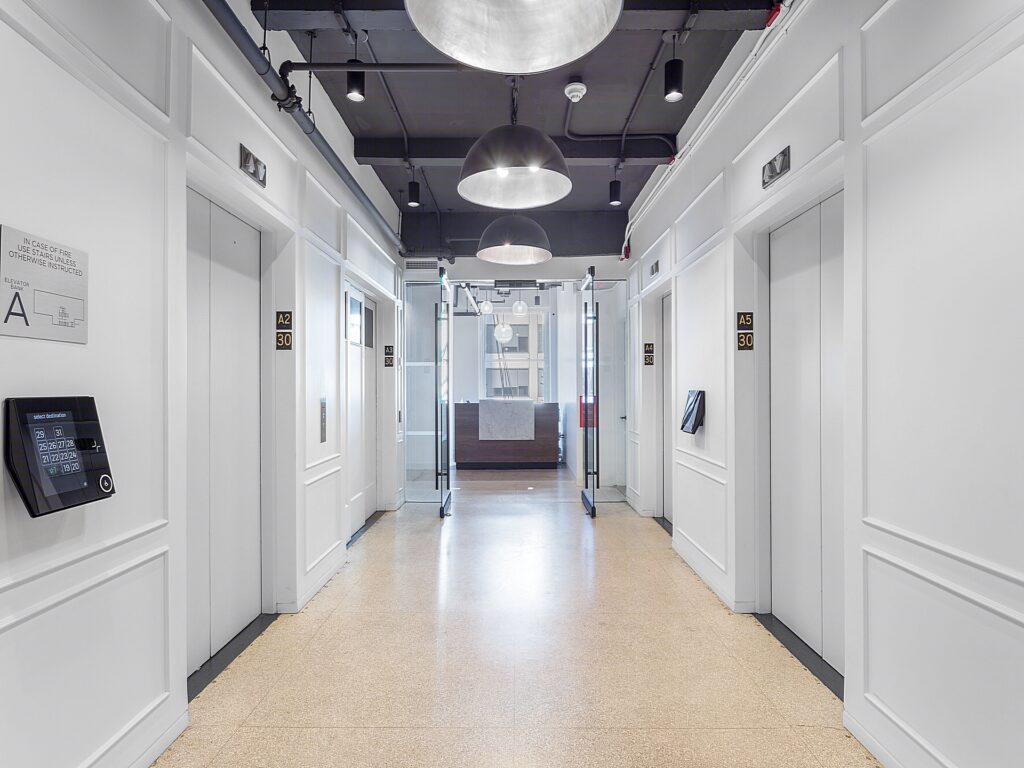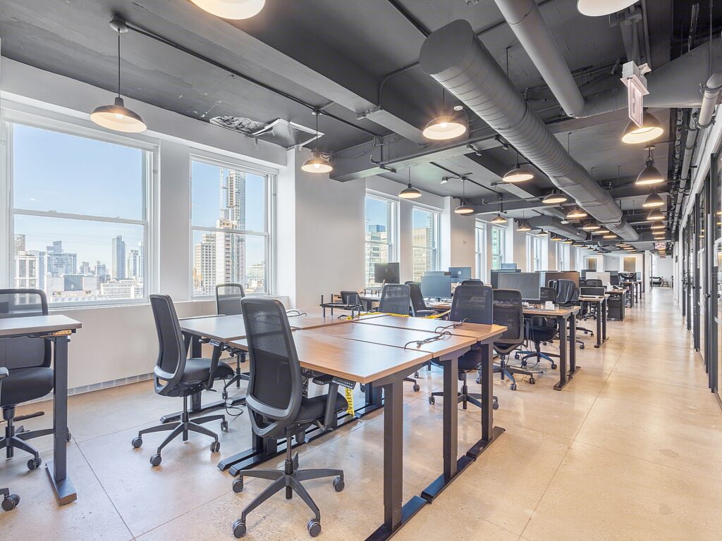 Ceiling heights reach approximately ten feet slab to slab, with an exposed ceiling aesthetic that incorporates visible ductwork, modern suspended lighting, and polished concrete flooring, reinforcing a contemporary and creative office identity. Multiple utility areas, including three dedicated support rooms and two restroom cores, are positioned around the central infrastructure to support operational needs without disrupting the primary workspace. The full-floor identity, combined with windows on multiple sides and a balanced mix of open and enclosed environments, delivers a turnkey office solution suited for a wide range of tenants seeking both scale and design presence in a Midtown location.