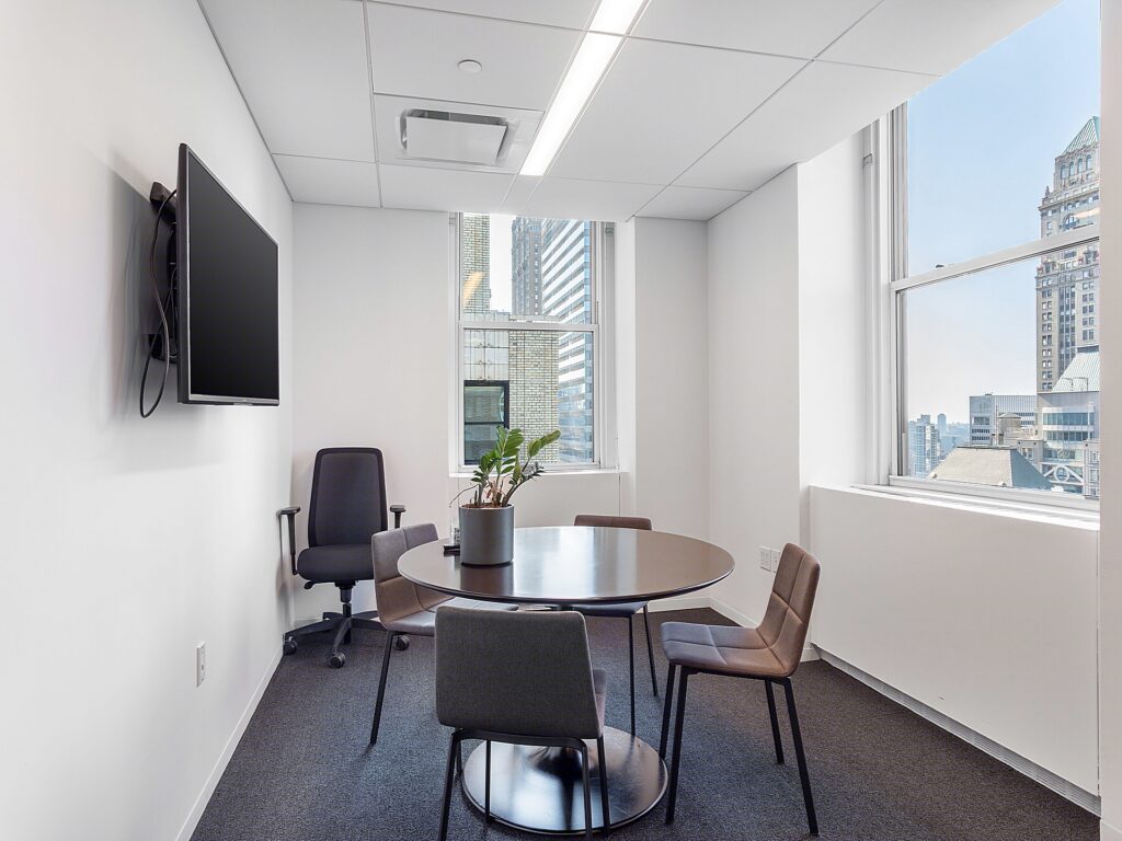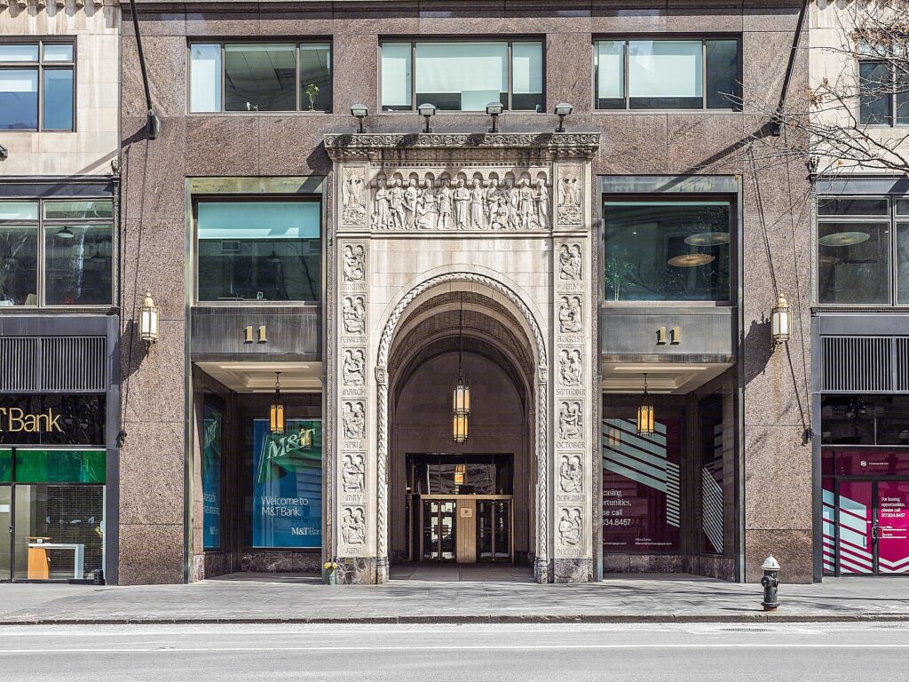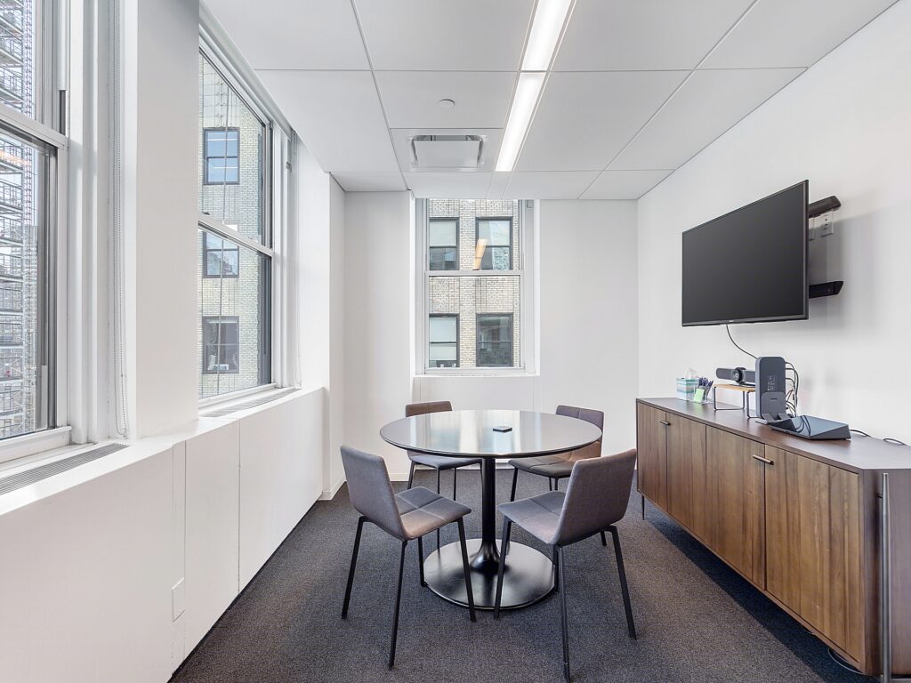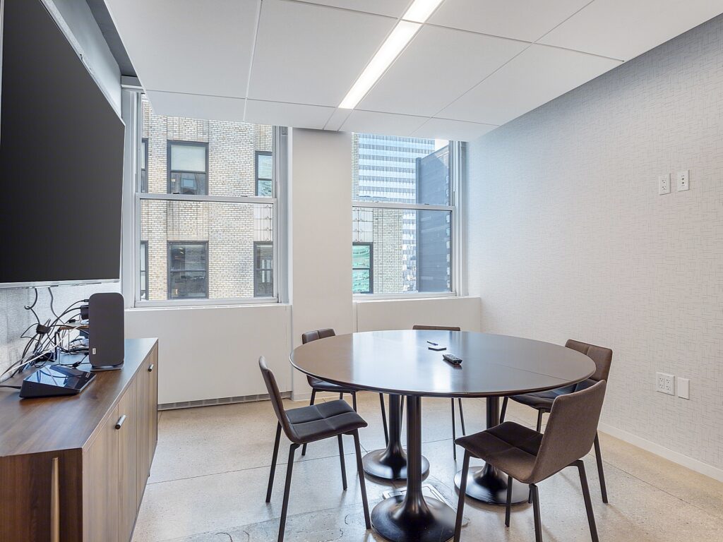 The front-facing open area anchors the primary work environment, where rows of workstations are arranged to maximize efficiency while maintaining clear pathways and sightlines. This zone benefits from a continuous perimeter of windows along the avenue frontage, allowing the workspace to feel expansive and energized throughout the day. Along this same perimeter sits a large enclosed room that functions well as a formal boardroom or executive conference space, with proportions that comfortably support larger team meetings or client presentations. Adjacent to this, a secondary open work area occupies the opposite wing of the floor, offering a slightly more segmented environment that can be used for departmental separation or quieter team functions.
