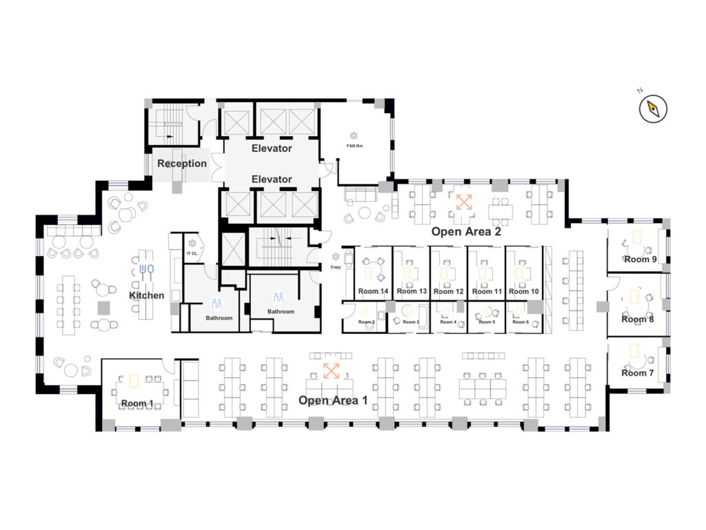 A full-floor installation totaling approximately ten thousand eight hundred twenty-four square feet is delivered here as a highly polished, prebuilt office with an estimated capacity of roughly two hundred thirty people, combining expansive open work areas with a strong mix of enclosed rooms and hospitality-driven amenities. The layout is organized around a central elevator core, from which a defined reception area introduces the space with a professional check-in point and immediate access to both collaborative and private work zones. From this central point, circulation flows naturally into two primary open work areas that stretch along the window lines, supporting a dense workstation layout with long benching runs and flexible team configurations.