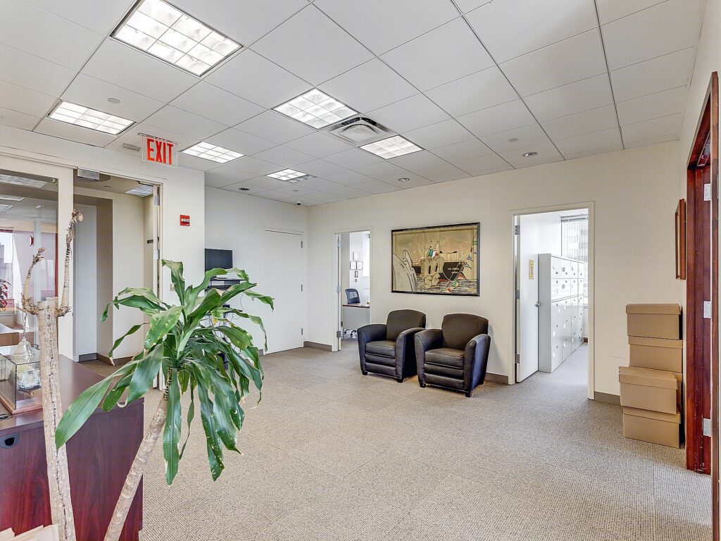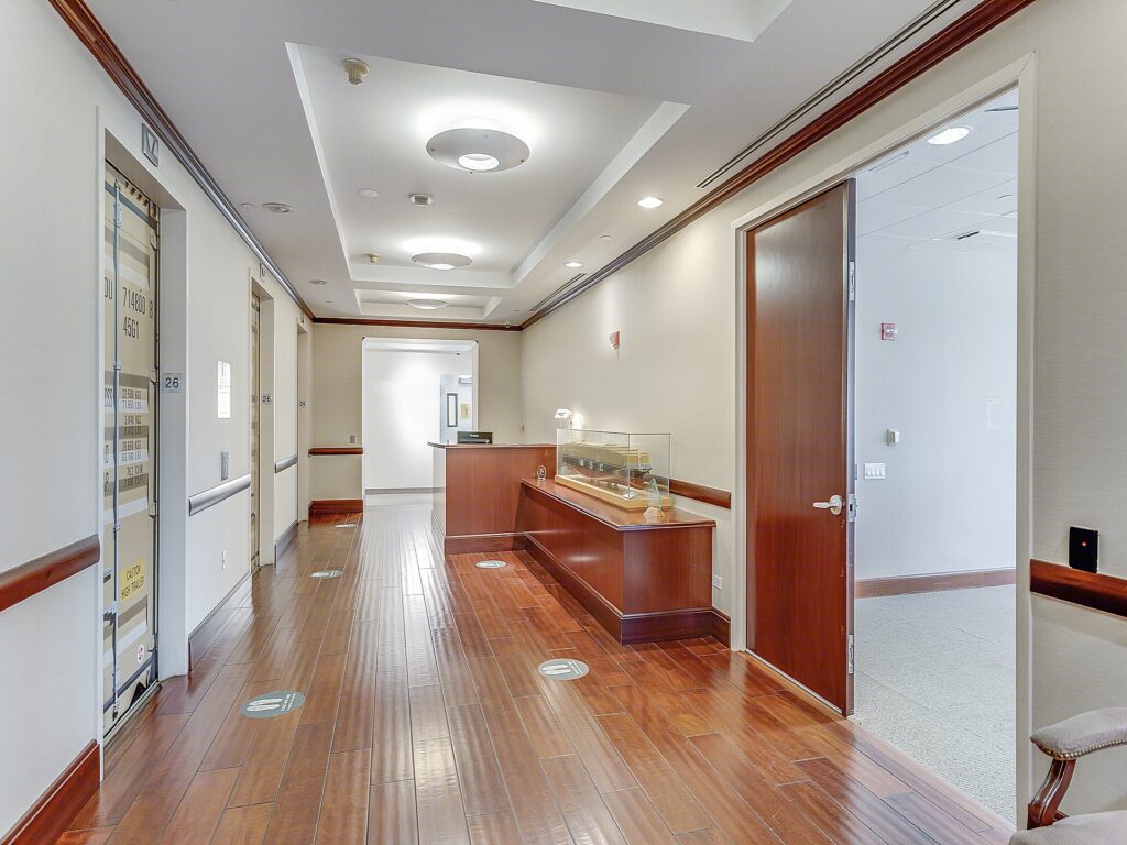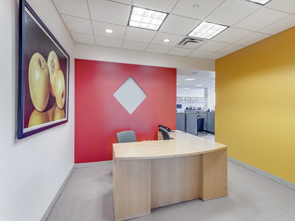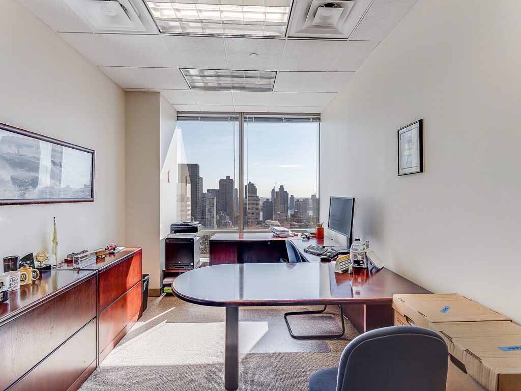 Full-floor presence defines this 26th floor installation at 420 Fifth Avenue, encompassing approximately 17,500 square feet and delivering a highly structured, business-forward layout anchored by a large central workstation environment supported by a full perimeter of private offices and meeting rooms. The suite opens into a formal reception positioned directly off the elevator core, establishing a clear front-of-house identity before transitioning into the operational areas of the floor.