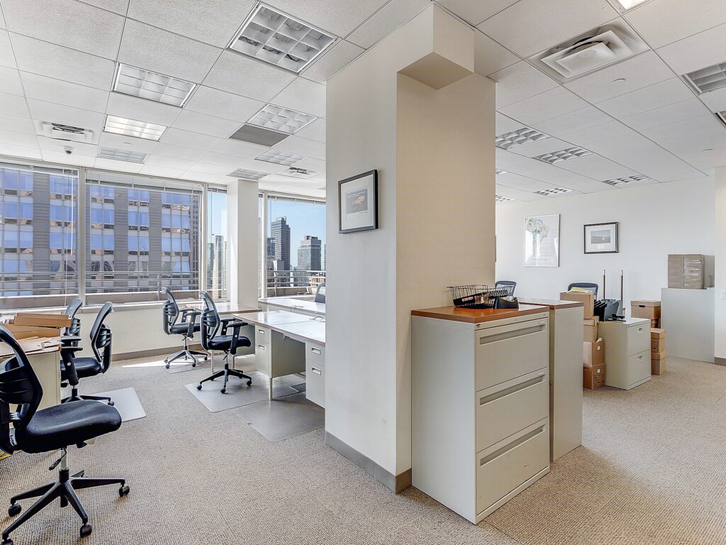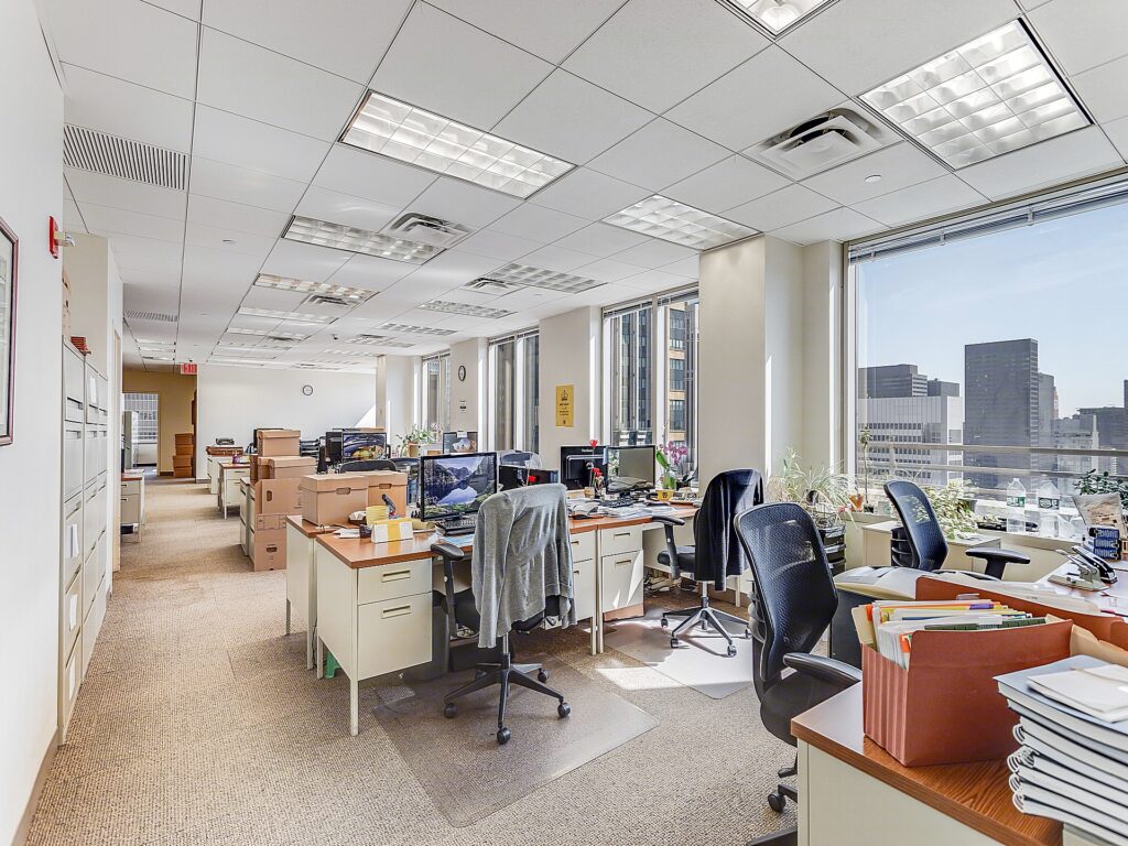 Windows line multiple sides of the floorplate, allowing daylight to reach both the perimeter offices and significant portions of the open workspace. The combination of 68 workstation seats, 10 perimeter private offices, and a large boardroom creates a balanced environment suited for firms requiring both high-density team seating and a strong private office presence. The layout supports a range of professional uses, from financial and legal operations to corporate headquarters functions, all within a full-floor setting that offers scale, identity, and flexibility.