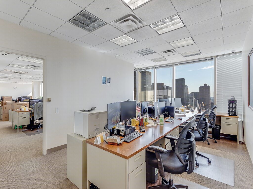 Encircling the open work areas are 10 private offices positioned along the perimeter, each benefiting from window exposure and configured for executive or managerial use. These rooms are appropriately scaled for individual offices or small team offices, with flexibility to convert select rooms into smaller meeting spaces or breakout rooms depending on operational needs. A large boardroom serves as the primary conference space, designed to accommodate full team meetings and client presentations with a long conference table and ample seating capacity. Its placement along the window line enhances its presence as a flagship meeting environment.