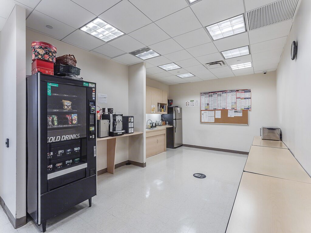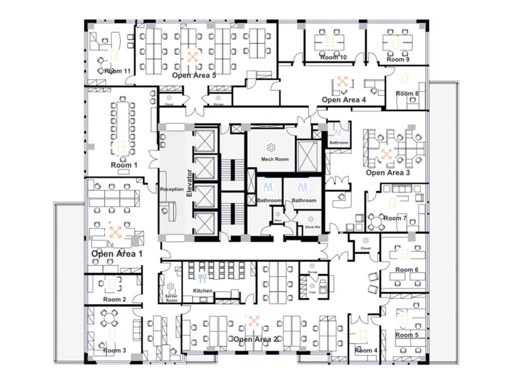 Additional enclosed rooms throughout the layout provide further functionality, including secondary meeting rooms, support rooms, and flexible-use spaces that can operate as huddle rooms or quiet work areas. A centrally located pantry serves the floor, positioned to be easily accessible from all work zones while remaining slightly removed from primary desk areas to avoid disruption. Supporting infrastructure includes multiple utility and storage rooms, along with restrooms located near the core for efficient access.