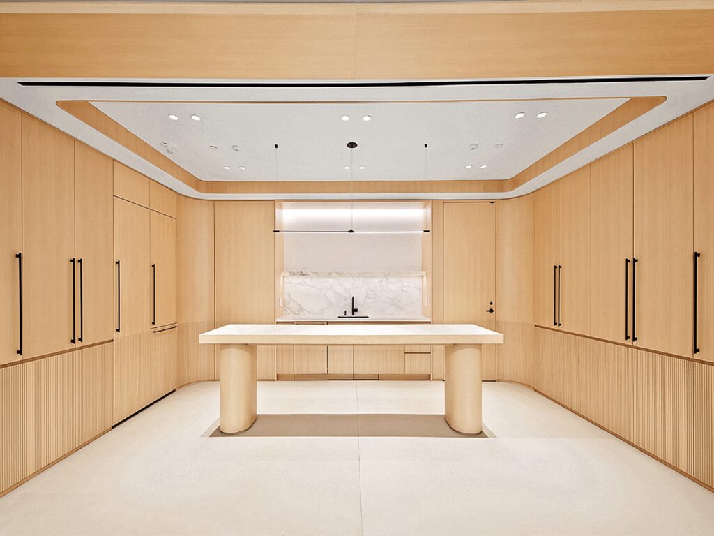 A standout feature within the layout is the dedicated pantry and kitchen installation, finished in warm wood millwork with integrated storage, a large central island, and stone backsplash detailing, creating a hospitality-driven hub that functions equally well for daily staff use or informal gatherings. Circulation corridors wrap cleanly around this core, allowing seamless movement between departments while maintaining privacy where needed.