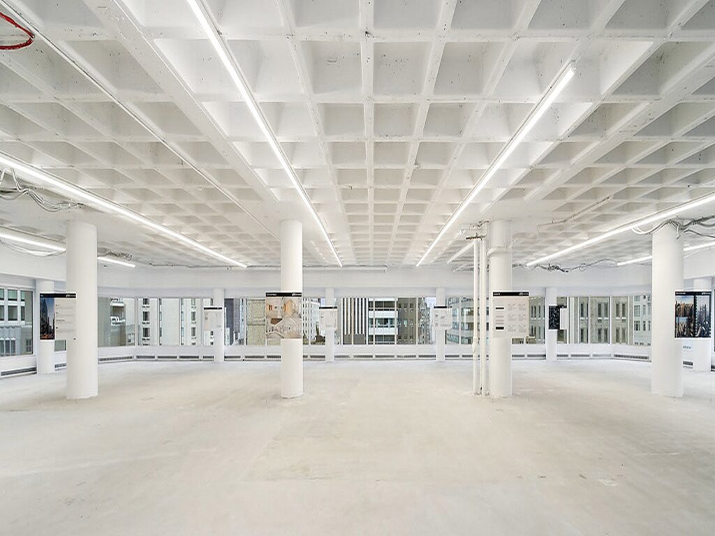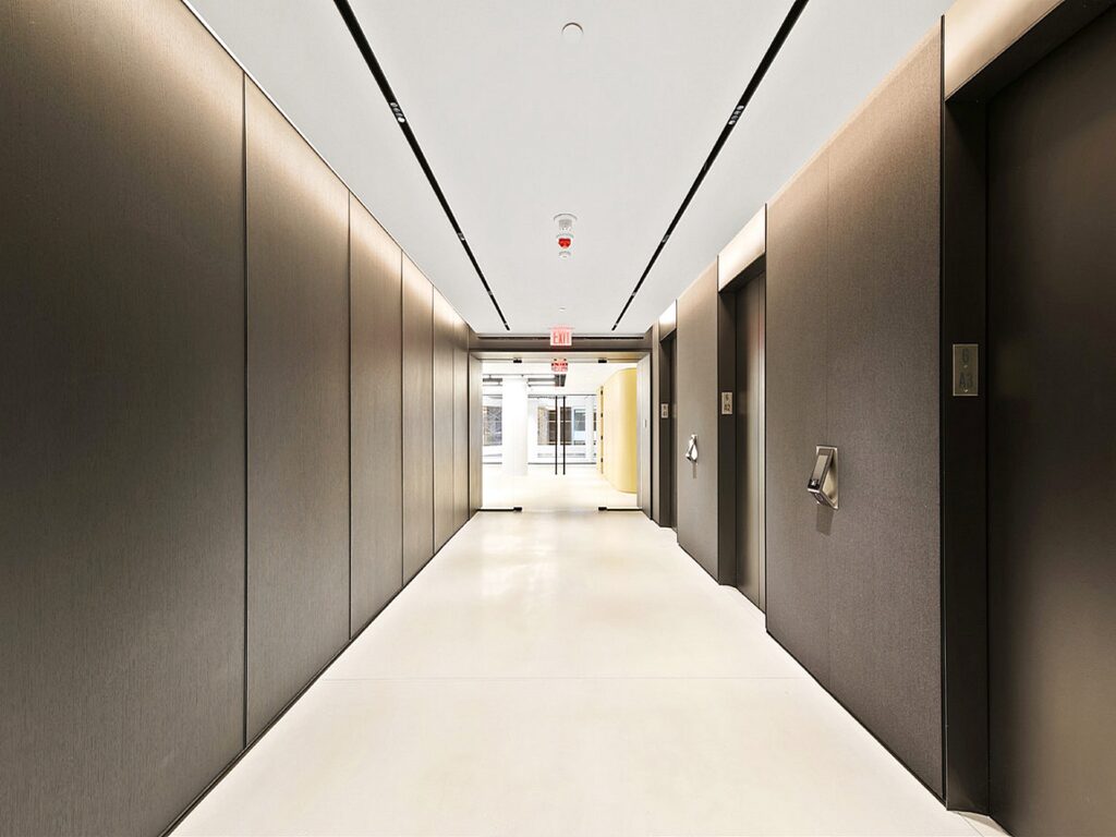 Direct elevator presence opens into a refined corridor experience that transitions into a bright, modern interior defined by clean architectural lines, recessed lighting, and a mix of polished concrete and soft-finish flooring that clearly delineates circulation from collaborative zones. Moving beyond the entry sequence, the layout unfolds into a large central open area engineered to comfortably accommodate 38 workstations, with column spacing that allows for flexible desk configurations while maintaining clear sightlines across teams. The ceiling design alternates between smooth finished sections and recessed lighting grids, creating visual structure without interrupting the openness of the workspace.