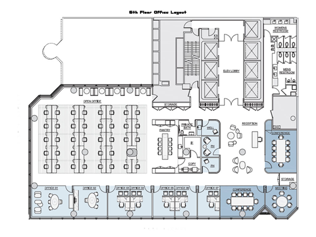 Notes: 6th floor Brand new prebuilt space with 2 conf., rooms, 1 meeting room, 7 offices, 2 phone rooms and open area for 38