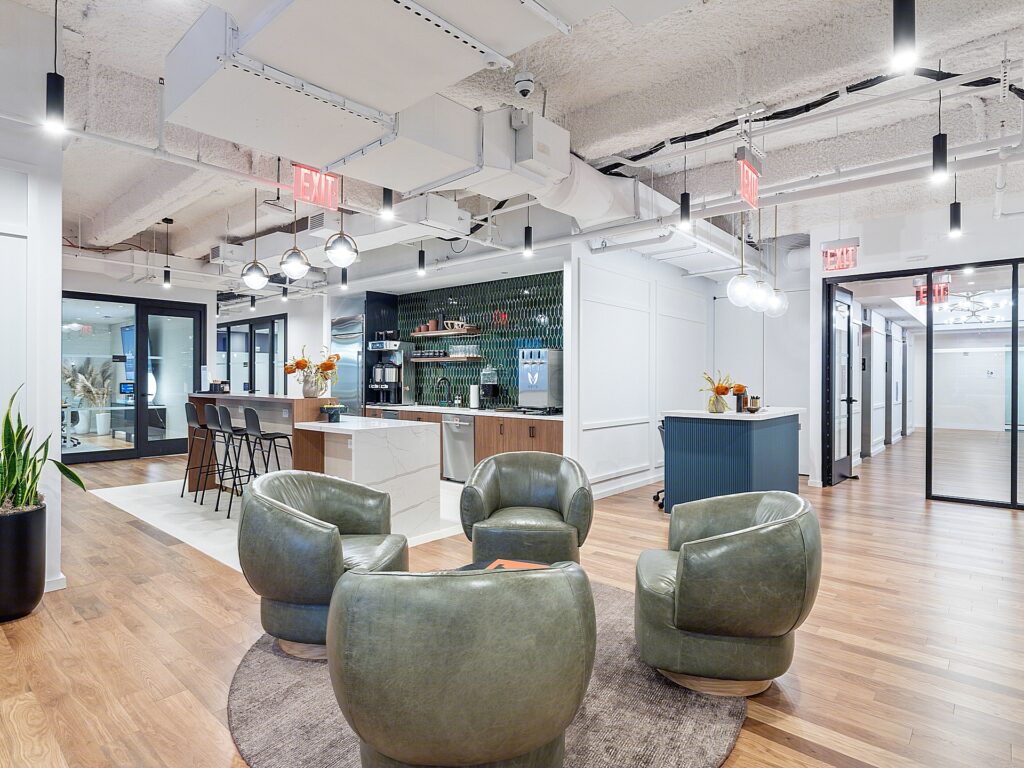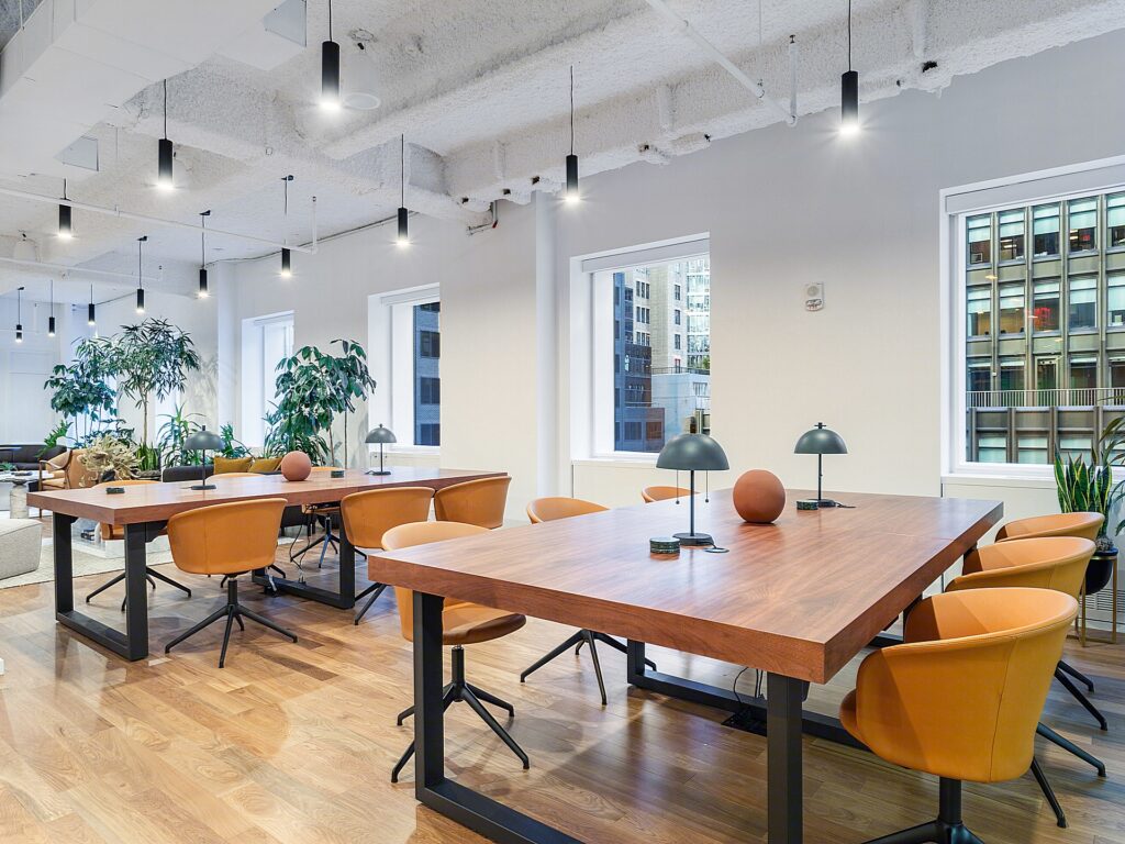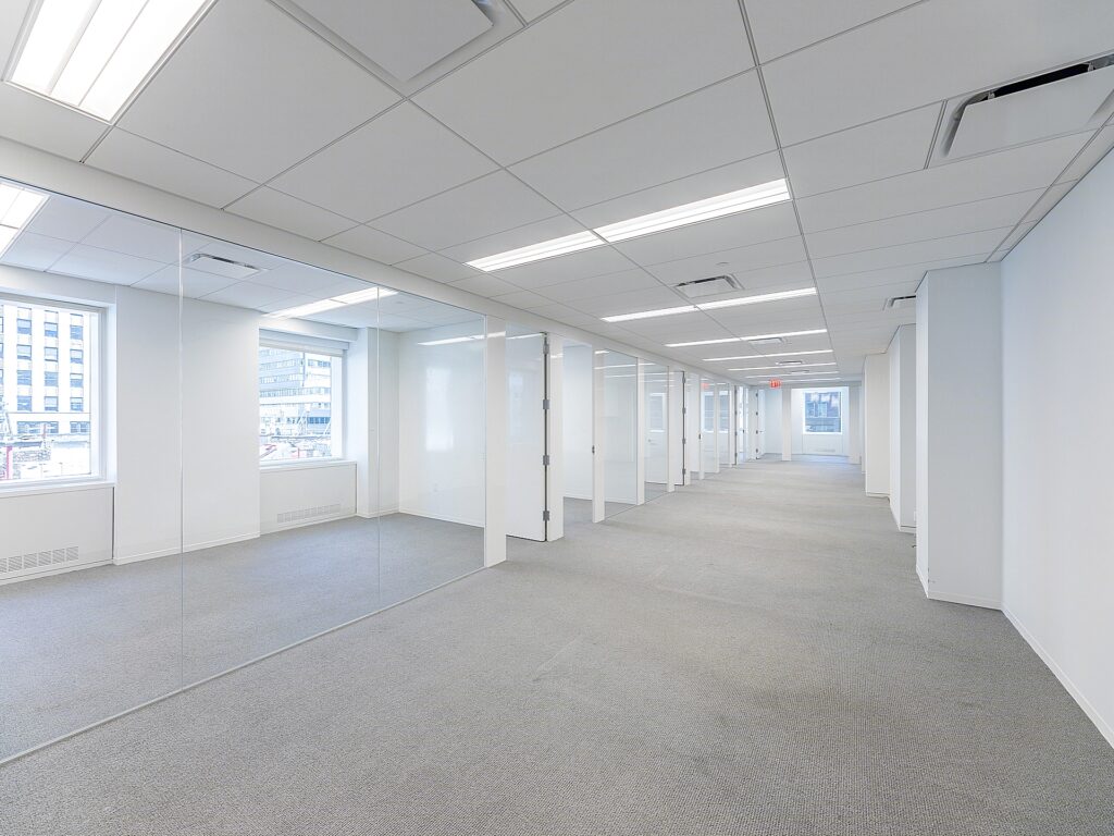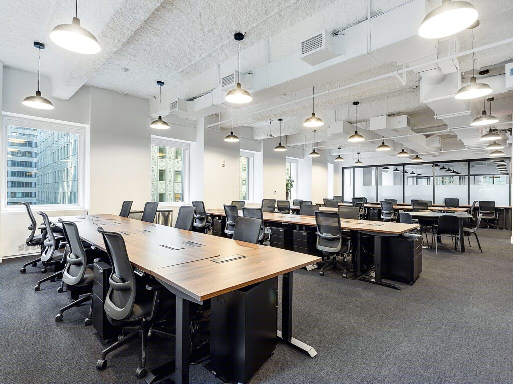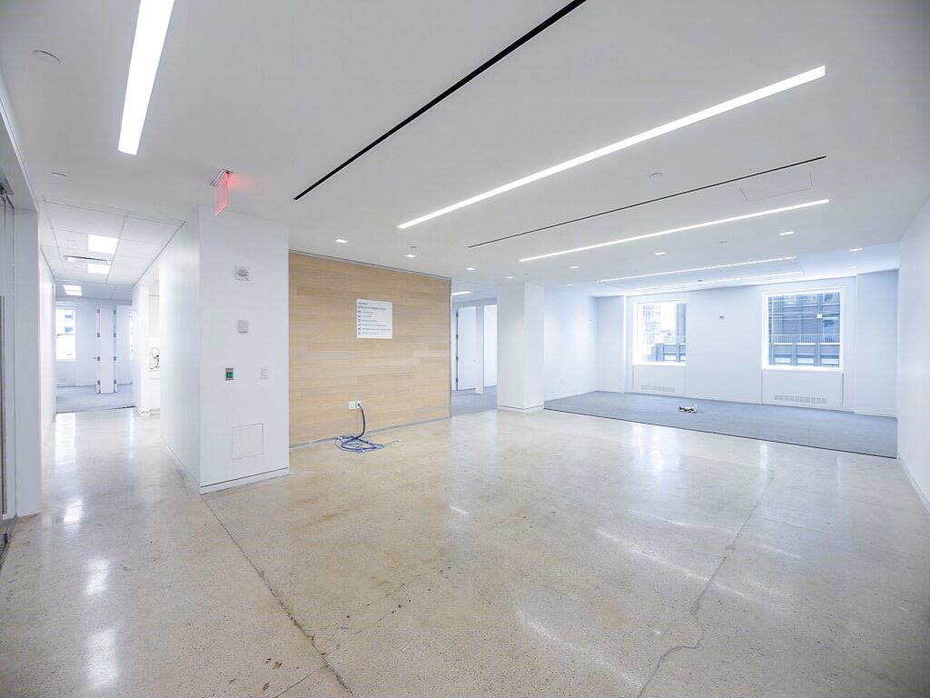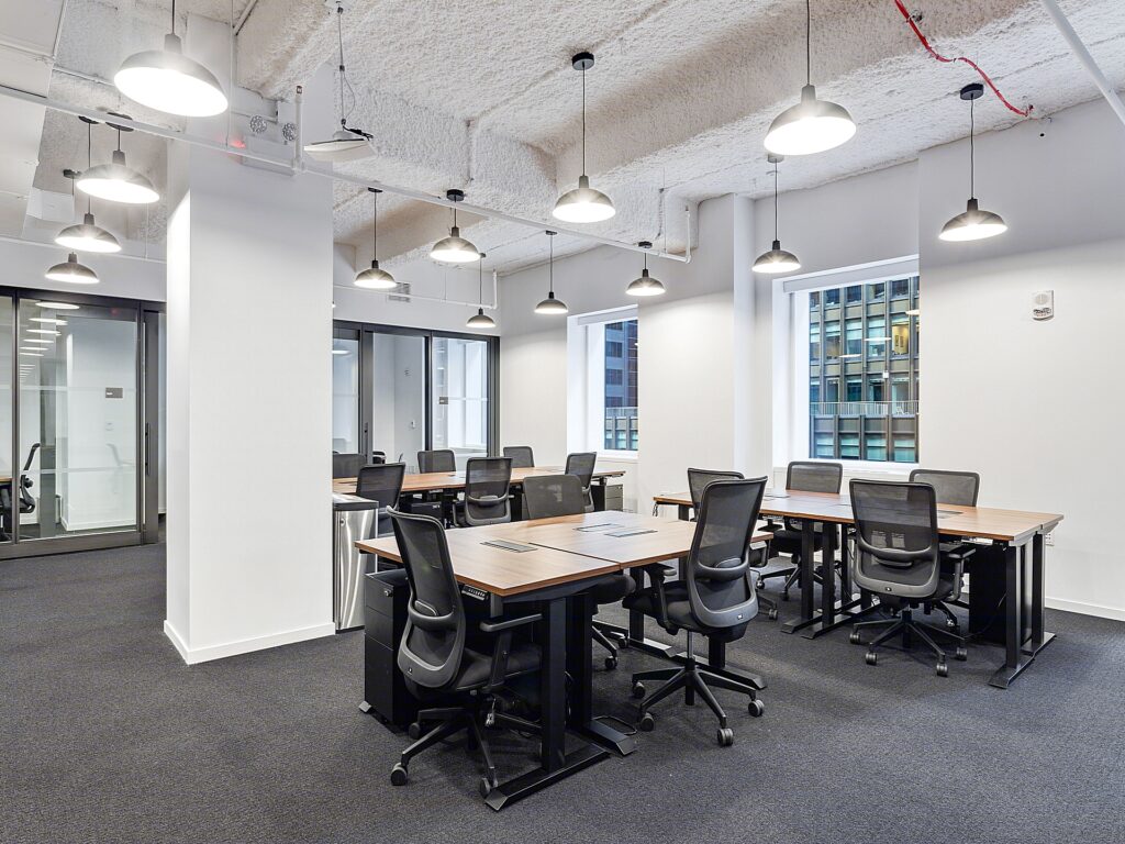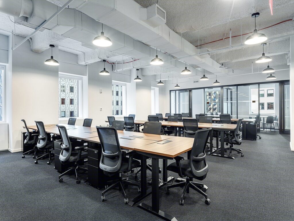 Windows span multiple exposures along the perimeter, bringing in consistent daylight throughout the day and enhancing the overall work environment across both the open areas and enclosed rooms. High exposed ceilings with modern lighting fixtures and visible mechanical systems contribute to a contemporary, creative-office aesthetic that appeals to a wide range of tenants, from technology and media firms to professional services and boutique financial groups. This Furnished Grand Central Large Partial Floor ultimately delivers a turnkey environment with strong identity, efficient circulation, and the ability to scale within a single contiguous footprint.