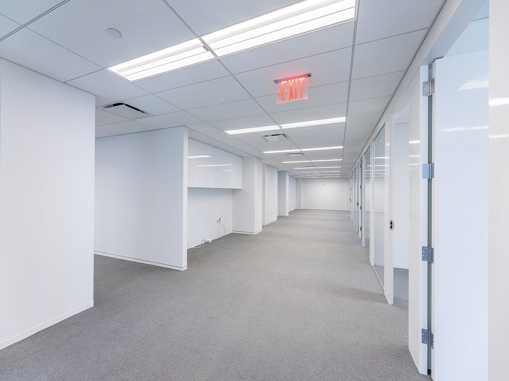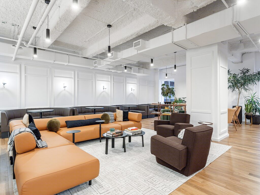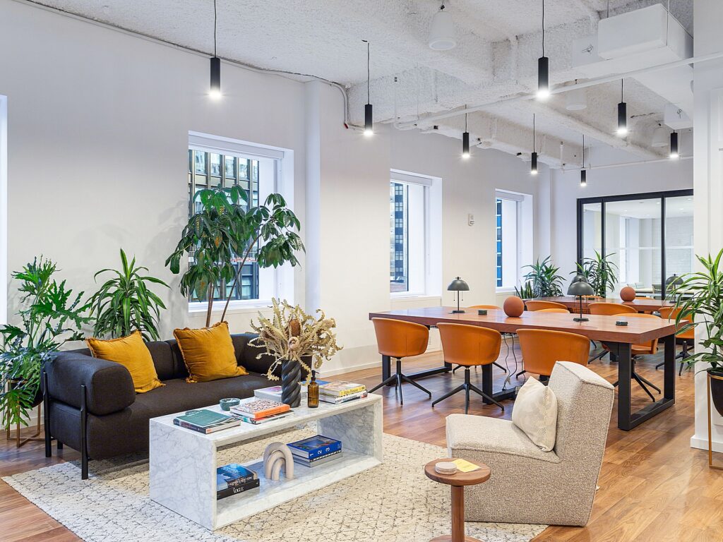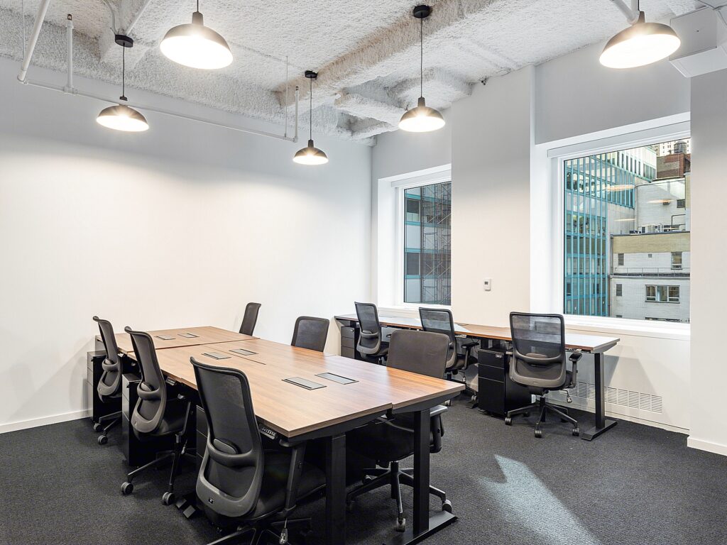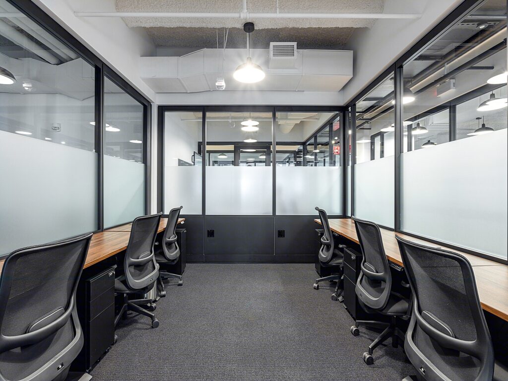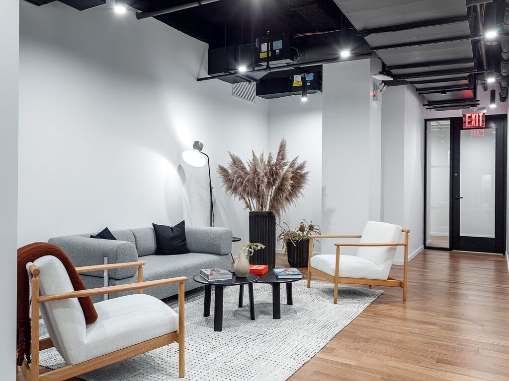 Windows span multiple exposures along the perimeter, bringing in consistent daylight throughout the day and enhancing the overall work environment across both the open areas and enclosed rooms. High exposed ceilings with modern lighting fixtures and visible mechanical systems contribute to a contemporary, creative-office aesthetic that appeals to a wide range of tenants, from technology and media firms to professional services and boutique financial groups. This Furnished Grand Central Large Partial Floor ultimately delivers a turnkey environment with strong identity, efficient circulation, and the ability to scale within a single contiguous footprint.