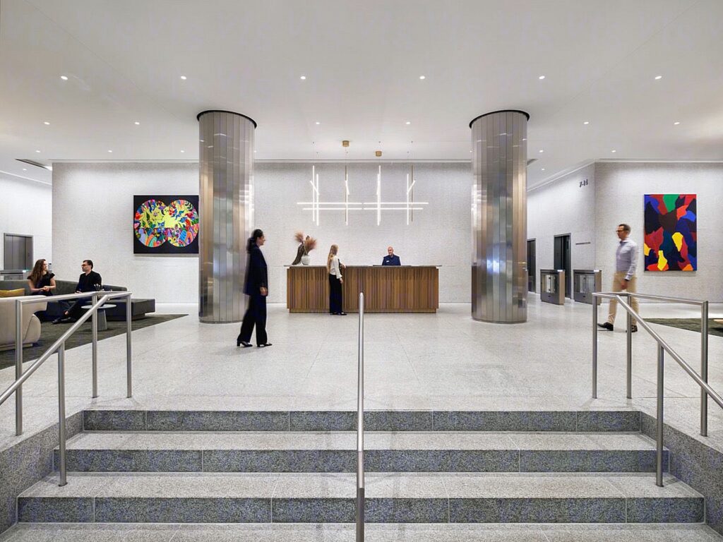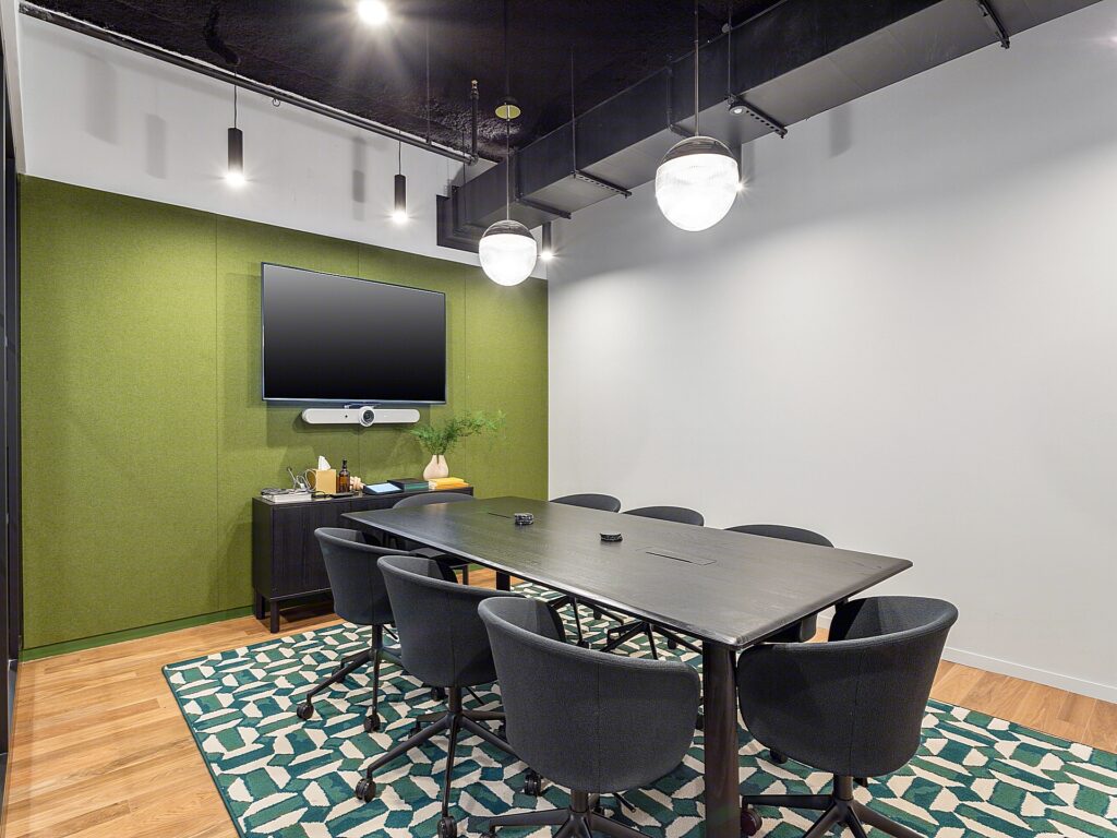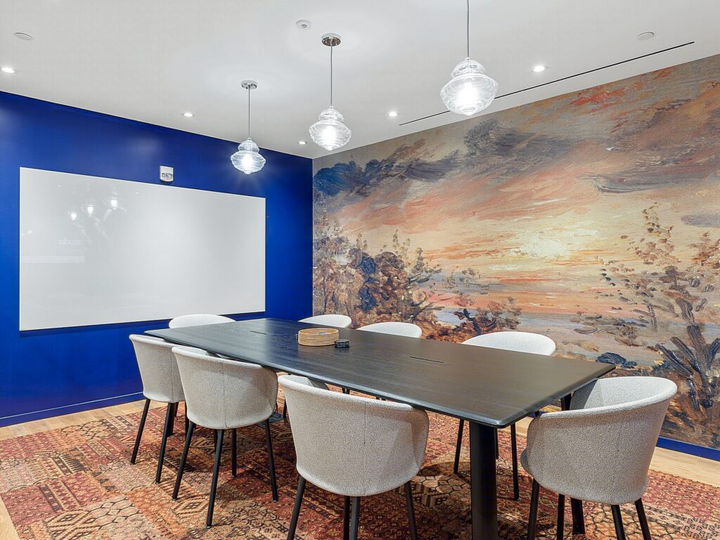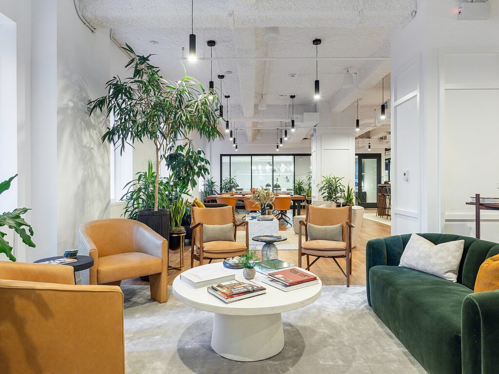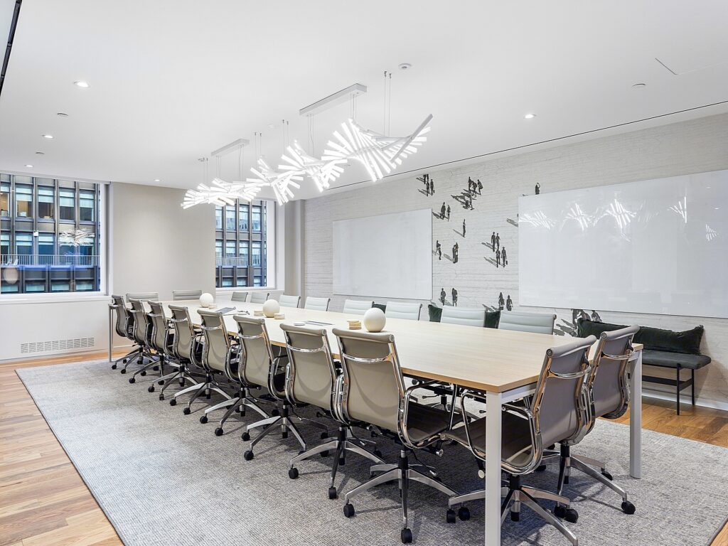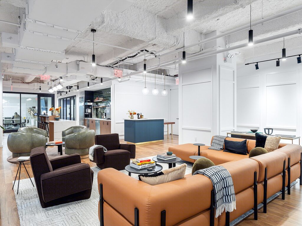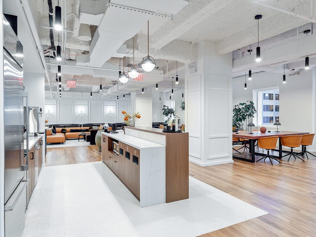Windows span multiple exposures along the perimeter, bringing in consistent daylight throughout the day and enhancing the overall work environment across both the open areas and enclosed rooms. High exposed ceilings with modern lighting fixtures and visible mechanical systems contribute to a contemporary, creative-office aesthetic that appeals to a wide range of tenants, from technology and media firms to professional services and boutique financial groups. This Furnished Grand Central Large Partial Floor ultimately delivers a turnkey environment with strong identity, efficient circulation, and the ability to scale within a single contiguous footprint.