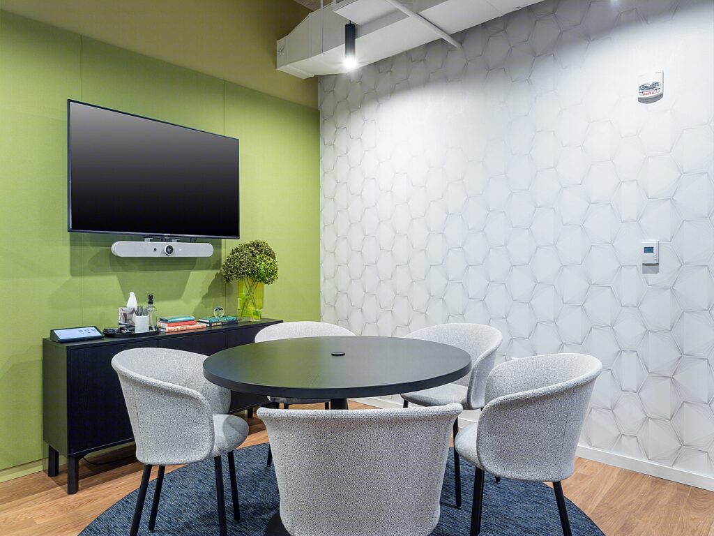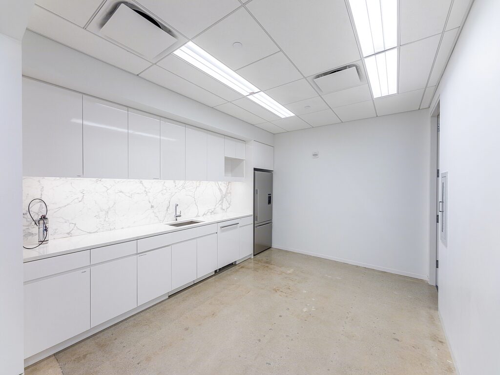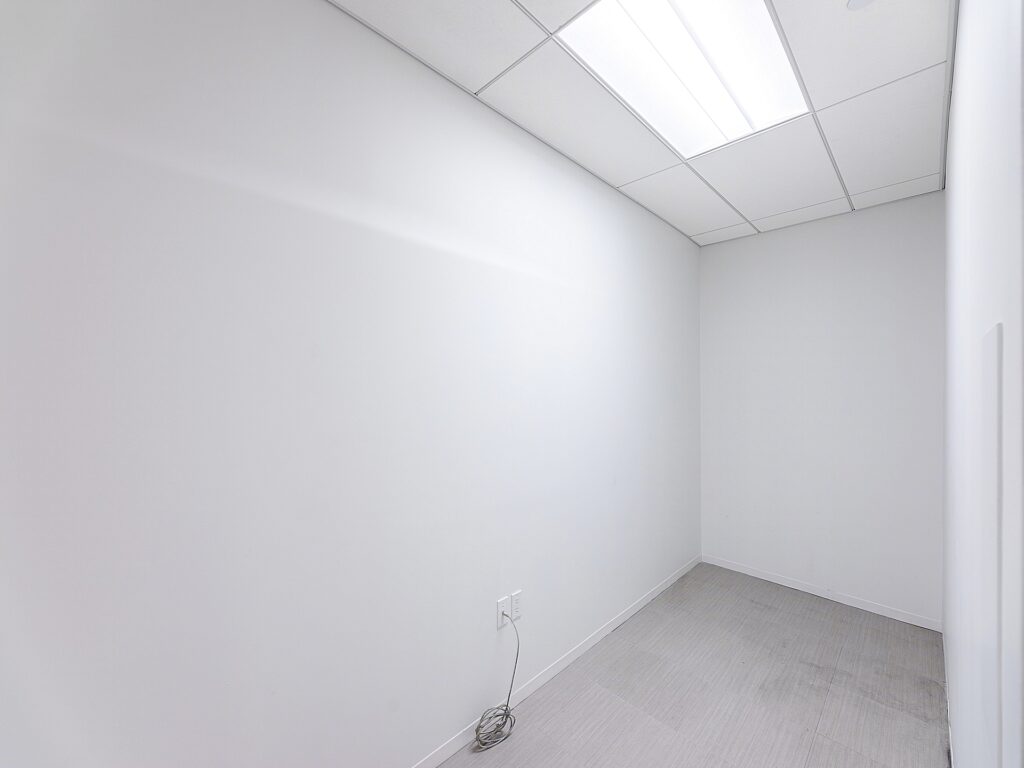 Additional enclosed rooms are distributed along secondary wings of the floorplate, offering flexibility for uses such as huddle rooms, wellness rooms, or specialized functions like editing suites or medical consult rooms if required. The presence of multiple utility areas and support spaces ensures that back-of-house operations, storage, and infrastructure can be handled without encroaching on the main working environment. The irregular shape of the floorplate creates natural divisions between teams while still maintaining cohesion, and the depth of the space allows for a thoughtful balance between openness and privacy.