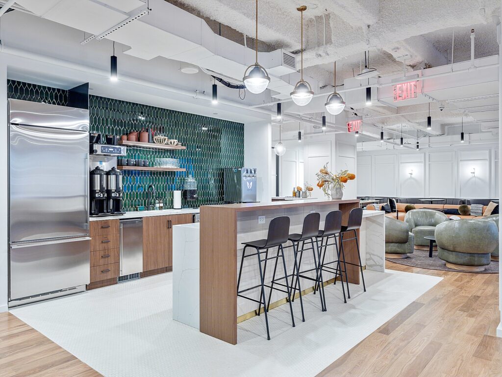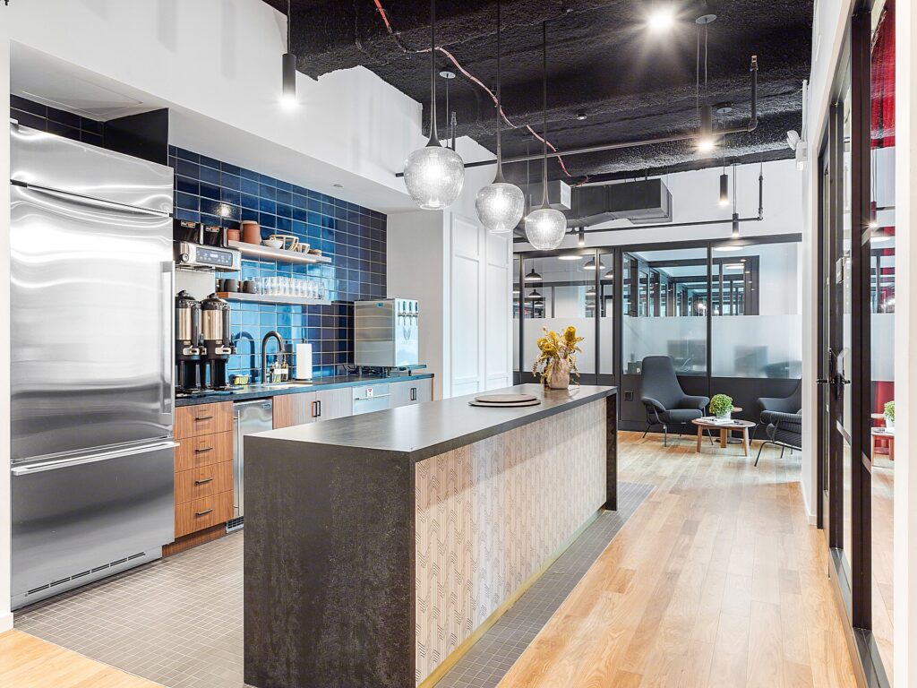 An expansive Furnished Grand Central Large Partial Floor opportunity unfolds here as a highly efficient, modern office installation centered around a large open work environment with multiple breakout zones and enclosed perimeter rooms positioned along the window lines. The layout wraps around a central core, creating a dynamic, multi-wing floorplate that allows for both collaborative density and private, enclosed functions without sacrificing flow. Upon entering, the space opens into a welcoming reception and lounge area defined by soft seating arrangements, warm wood flooring, and a hospitality-driven aesthetic that immediately sets a professional yet comfortable tone for both staff and visitors. Adjacent to this entry sequence sits a fully built-out pantry and café-style kitchen with bar seating, providing a natural hub for informal meetings and team interaction.