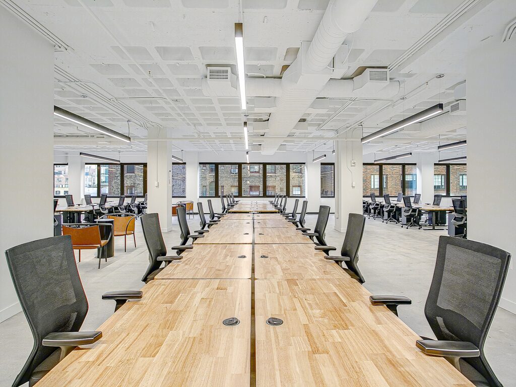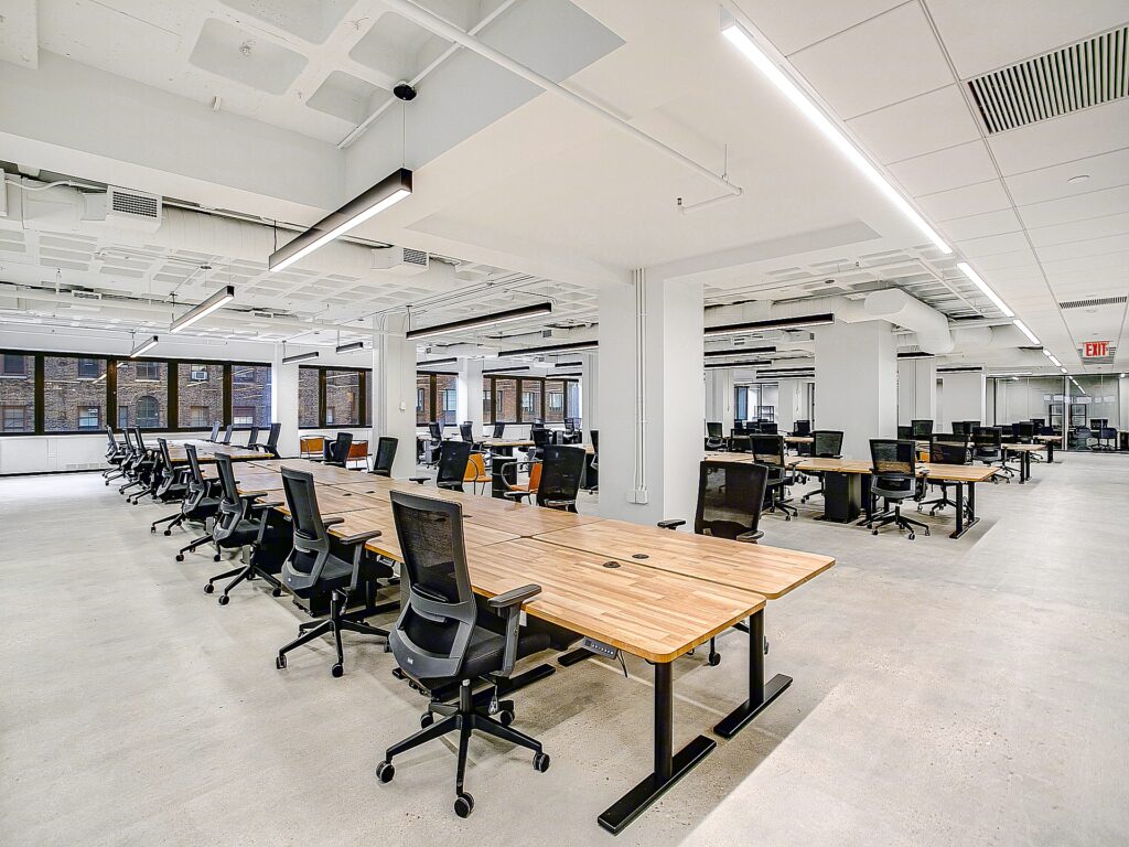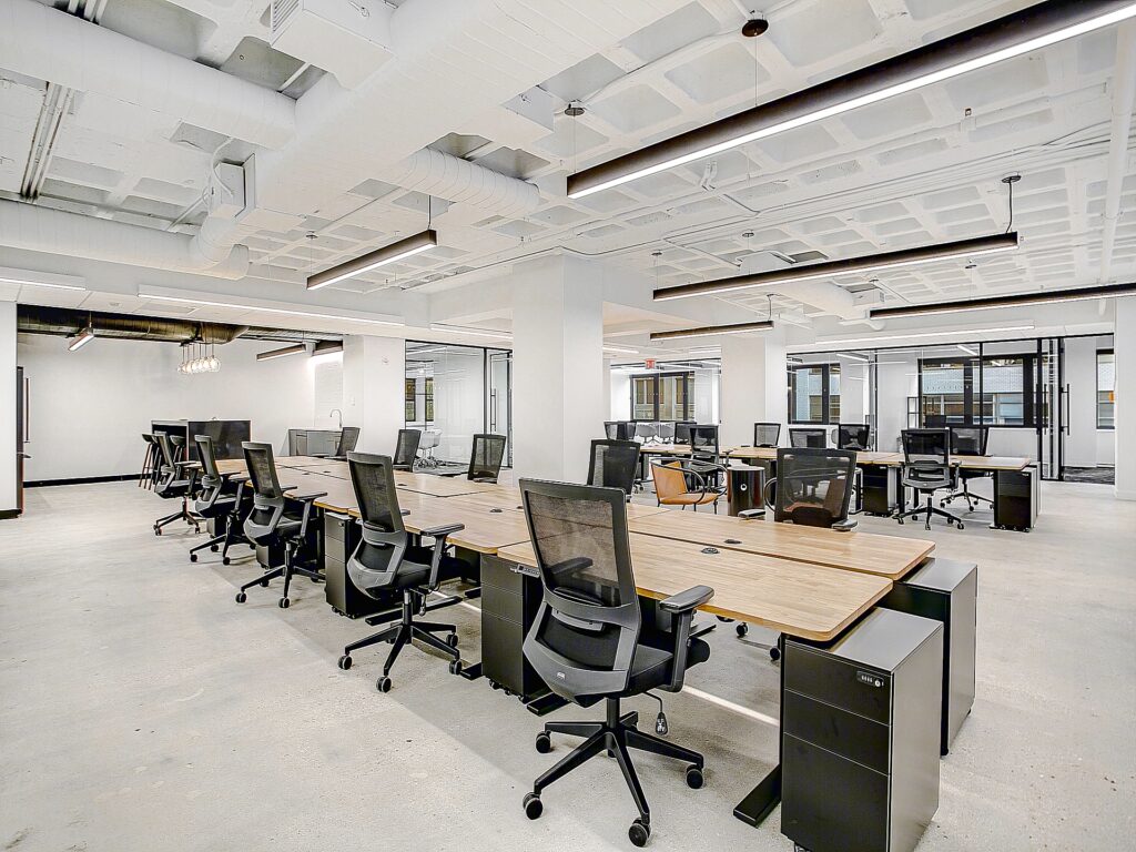 From reception, circulation flows seamlessly into a large central open work area where 72 workstations are arranged in organized benching clusters. These stations are laid out in long rows that maximize seating density while maintaining clear sightlines and accessible pathways between teams. The open area is punctuated by structural columns that are thoughtfully integrated into the plan, creating natural divisions for departmental groupings without interrupting the overall cohesion of the space. Exposed ceilings paired with linear lighting fixtures contribute to a modern, loft-like atmosphere, while polished concrete floors reinforce durability and ease of maintenance for high-density occupancy.