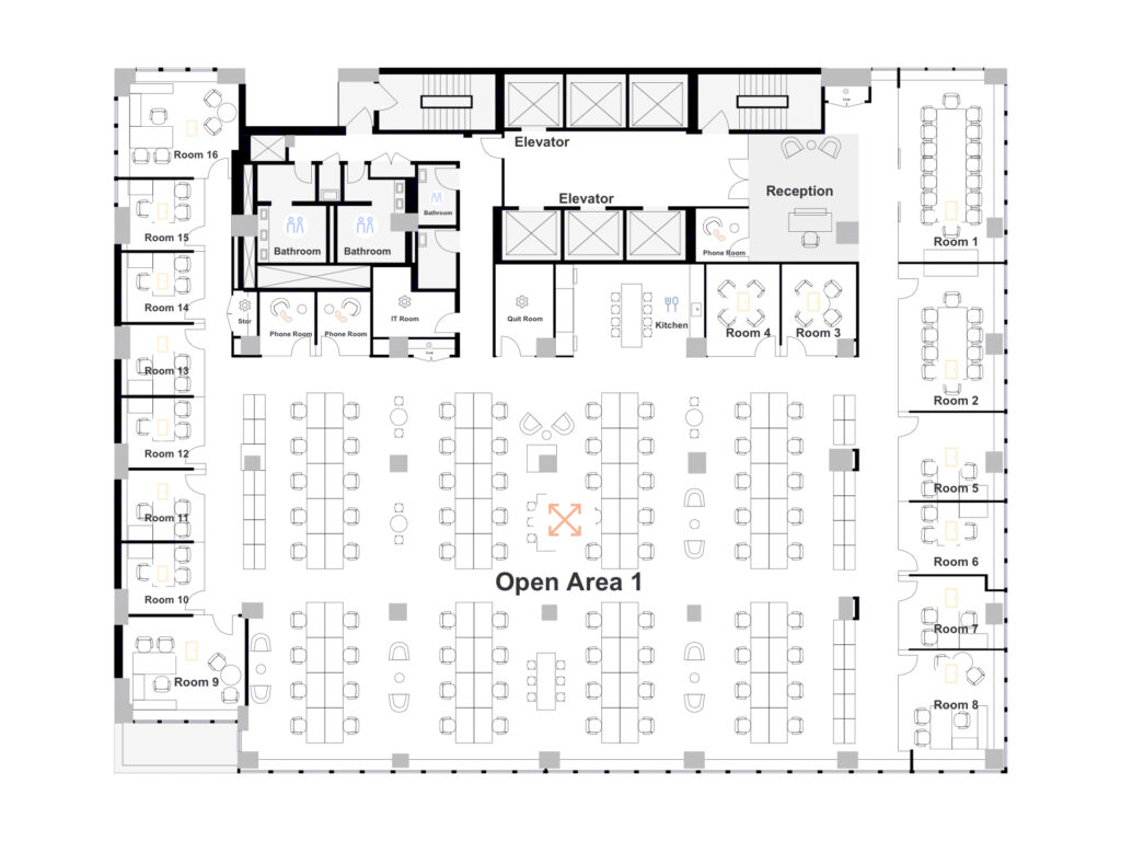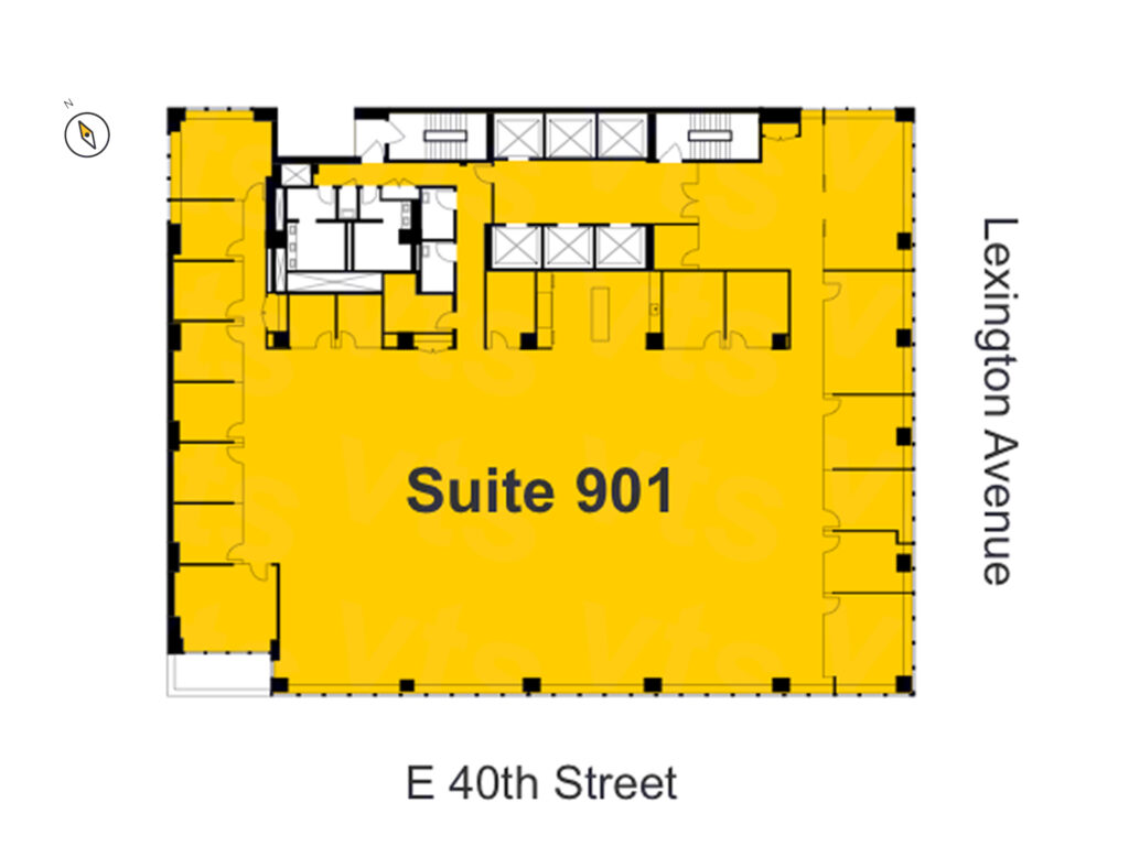 Lexington Avenue Full Floor Suite totaling approximately 15,214 square feet at 360 Lexington Avenue delivers a highly structured and scalable office environment designed to accommodate 72 workstations, 14 private offices, 1 conference room, and 1 meeting room, all organized within a clean, efficient floorplate that wraps the building’s perimeter along Lexington Avenue and East 40th Street. The entrance opens directly off the elevator bank into a defined reception zone that provides a clear front-facing identity with space for a staffed desk and informal seating, creating a natural checkpoint between visitors and the working interior.
