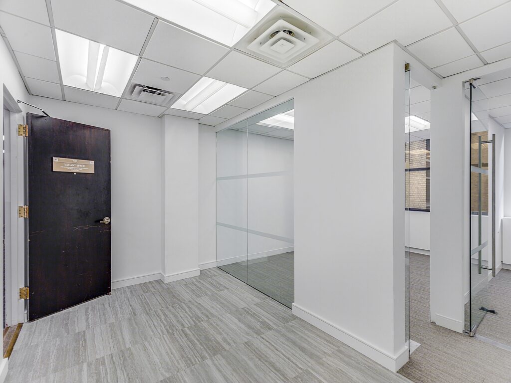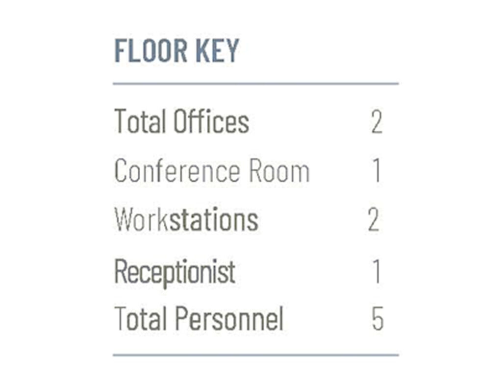 A thoughtfully built pre-existing suite totaling approximately one thousand three hundred forty-four rentable square feet offers a highly efficient and professional layout tailored for a boutique office user, with a program that includes two private offices, one dedicated conference room, two support workstations, one reception position, and a total staff capacity of five. The layout is compact yet deliberate, maximizing every portion of the floorplate while maintaining clear separation between client-facing and internal work areas.