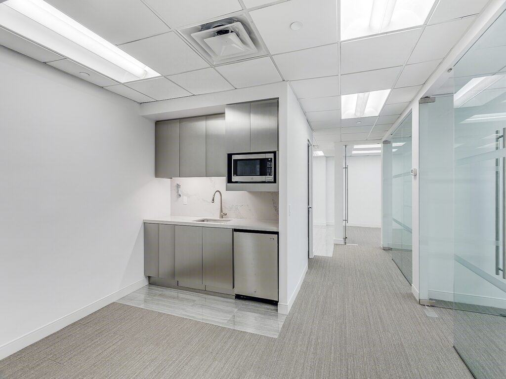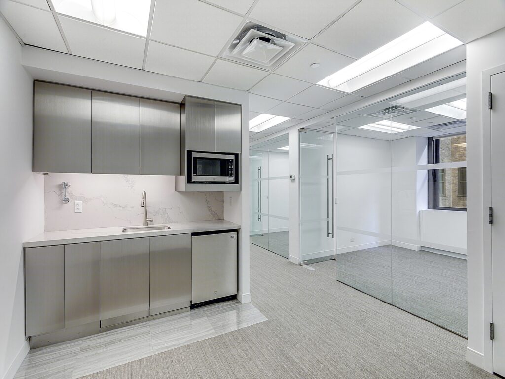Toward the interior portion of the suite, a compact pantry is integrated into the layout, equipped to support basic kitchen functions and staff convenience. Nearby, a restroom is located within the suite, enhancing usability and reducing reliance on common corridor facilities. The overall layout is clean and modern, with glass-fronted partitions, neutral finishes, and a cohesive design that allows the space to feel open despite its efficient footprint.