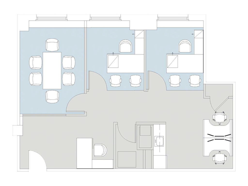 To one side of the layout, a full conference room is positioned along the window line, sized to accommodate a meeting table with seating for approximately six individuals. This room benefits from direct window exposure, providing a comfortable setting for client meetings, presentations, or internal discussions. Adjacent to the conference room, two private offices are also located along the perimeter, each enclosed and proportioned to support executive desks and seating for small meetings. These offices are well suited for partners or senior staff, offering both privacy and access to exterior light.