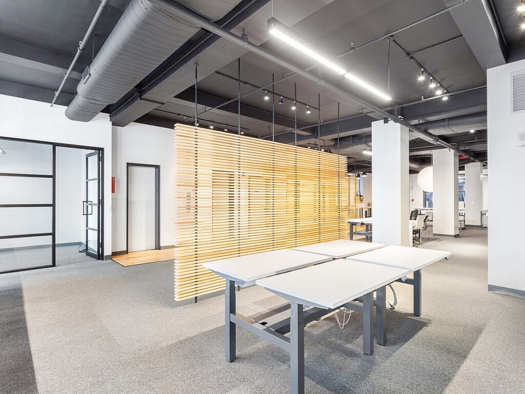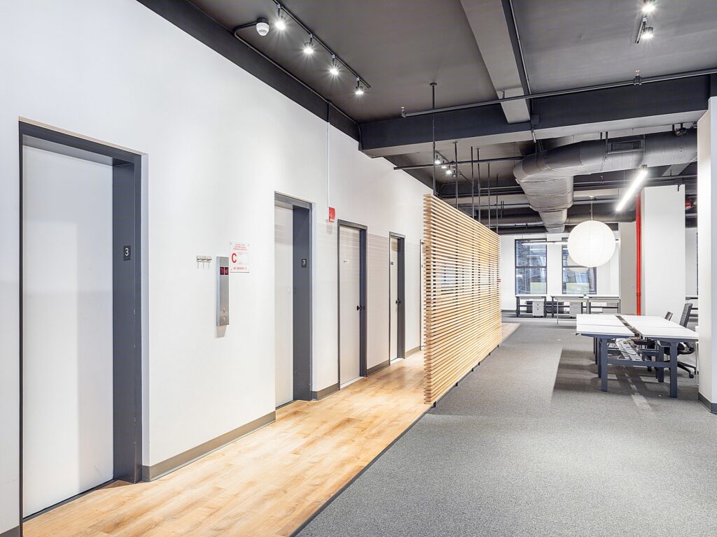 Throughout the space, high ceilings with exposed ductwork and industrial lighting fixtures complement the modern finishes and generous window lines. Wood accents and a feature screen wall add warmth and visual separation without closing off the space. The suite includes three private restrooms conveniently located off the main corridor, along with dedicated closets and utility rooms for IT and storage.