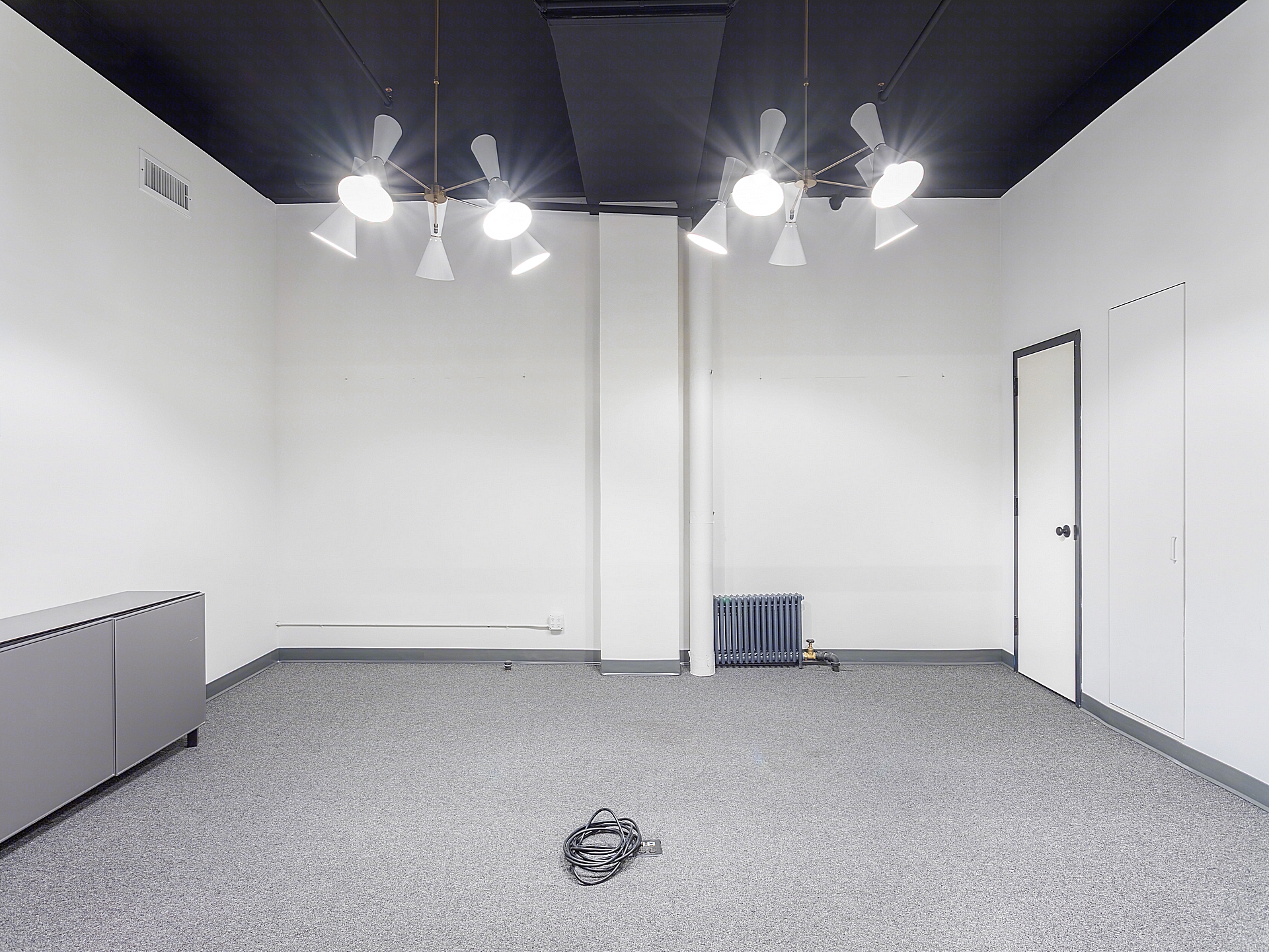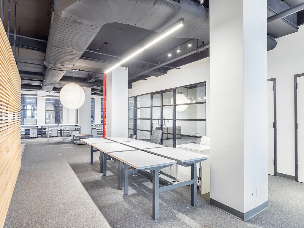Flanking the open areas are three enclosed perimeter rooms, each benefiting from large windows and daylight exposure. Two of these rooms function perfectly as private offices or small meeting rooms, offering privacy without sacrificing visibility thanks to full-height glass walls. The third and largest room sits behind double glass doors and serves as the primary conference room, capable of supporting formal team meetings, client presentations, or collaborative planning sessions. The room’s position and separation allow it to function without interrupting the flow of the main floor.