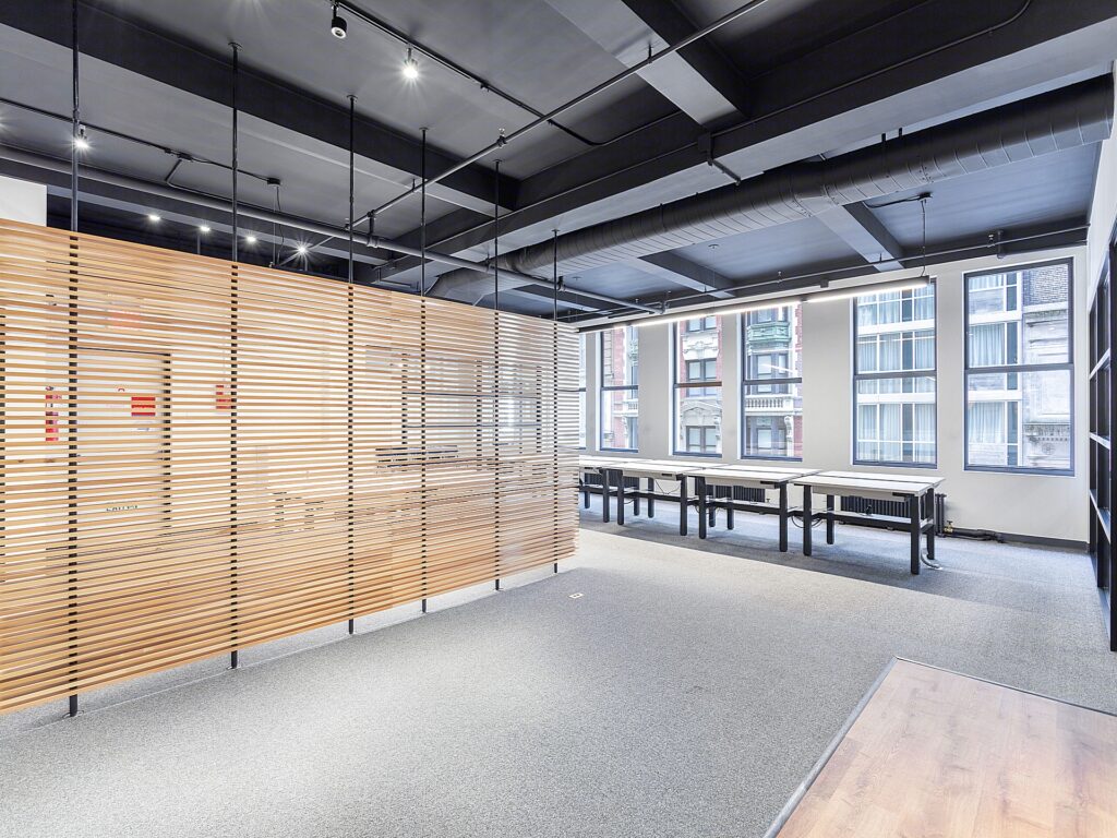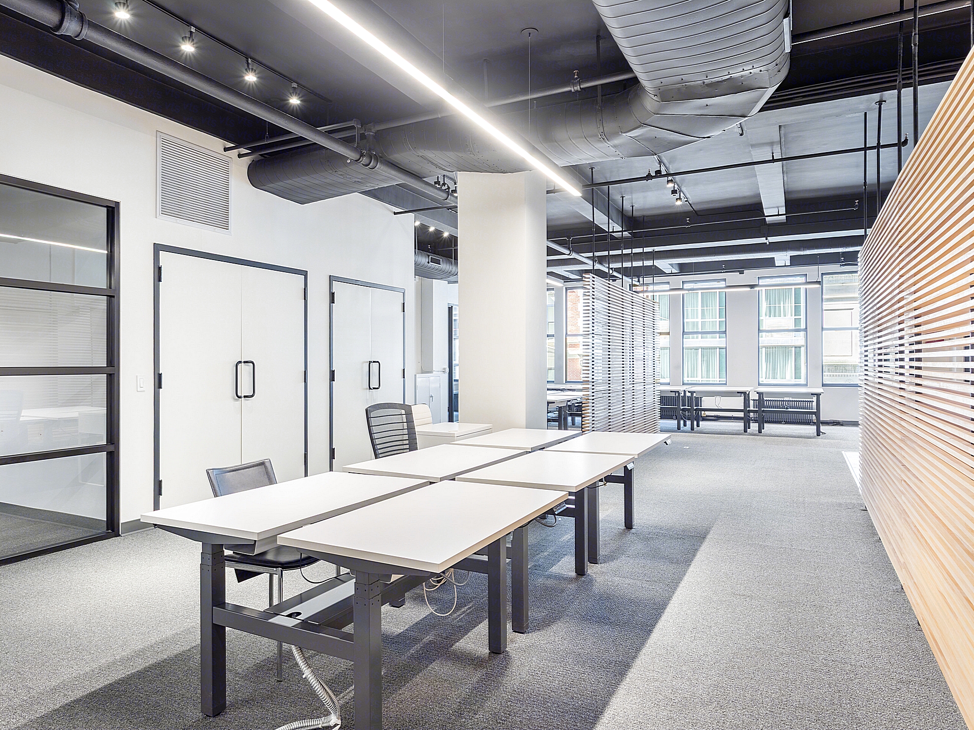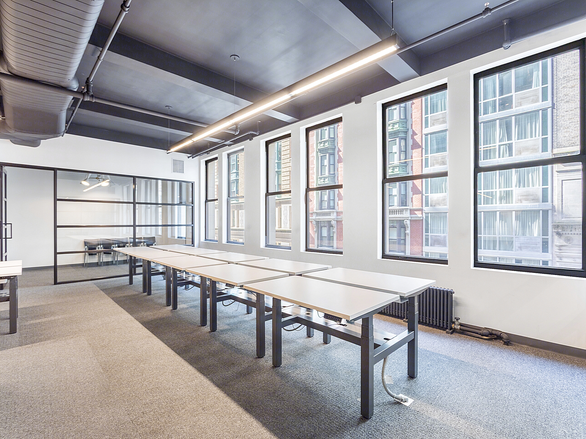 Murray Hill Office Space for Rent; Suite 300 at 31 East 32nd Street is a full-floor, move-in-ready commercial unit designed with both functionality and style in mind. The layout supports teams that value collaboration, natural light, and flexible work zones. Upon arrival from the elevator bank, visitors are greeted by a comfortable waiting area that introduces the clean, modern aesthetic that continues throughout the space. Just beyond, the main open work area unfolds across the central portion of the floor, featuring 14 fully-wired workstations arranged in linear pods with ample spacing and storage beneath each desk. To the west end of the suite, an additional open area supports 10 more workstations arranged in benching format, ideal for dedicated teams or overflow seating. Together, the space comfortably supports approximately 24 staff members with room to expand.