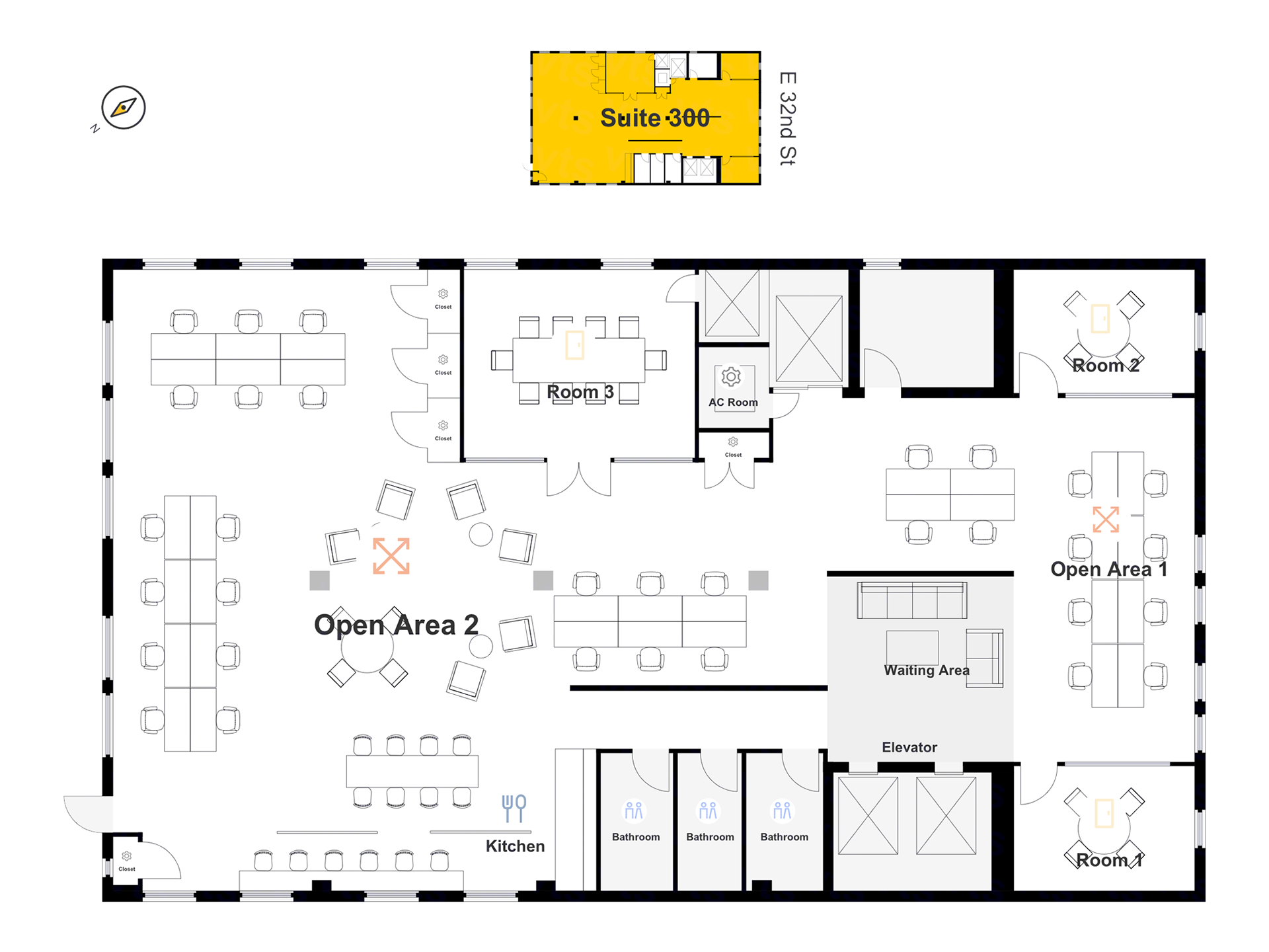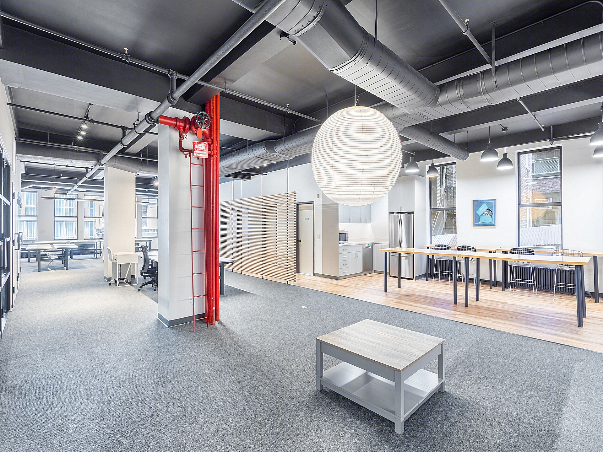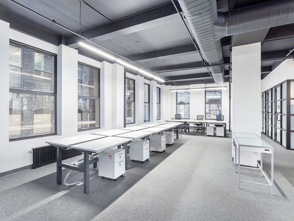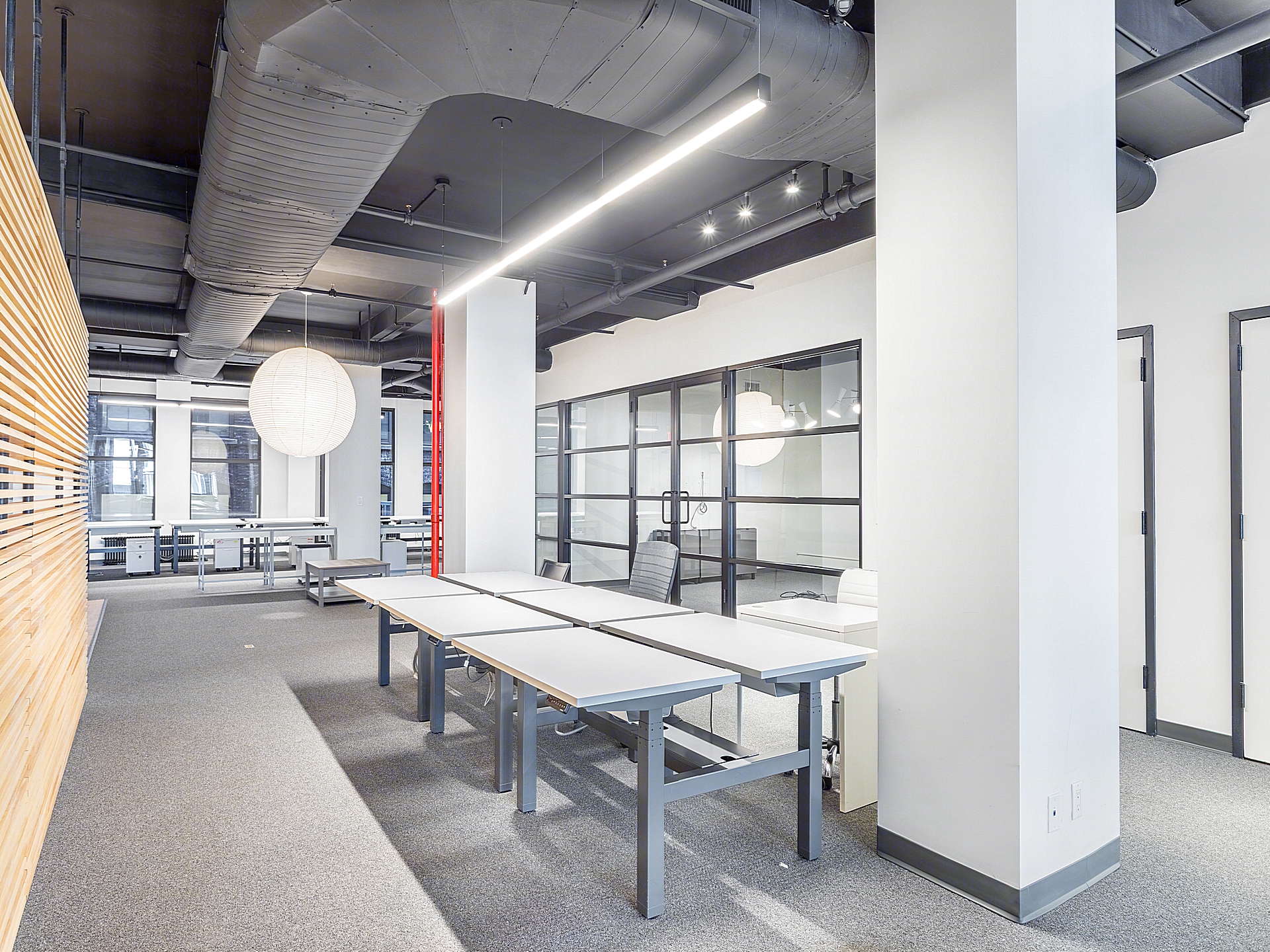 Murray Hill Office Space for Rent; Suite 300 at 31 East 32nd Street is a full-floor, move-in-ready commercial unit designed with both functionality and style in mind. The layout supports teams that value collaboration, natural light, and flexible work zones. Upon arrival from the elevator bank, visitors are greeted by a comfortable waiting area that introduces the clean, modern aesthetic that continues throughout the space. Just beyond, the main open work area unfolds across the central portion of the floor, featuring 14 fully-wired workstations arranged in linear pods with ample spacing and storage beneath each desk. To the west end of the suite, an additional open area supports 10 more workstations arranged in benching format, ideal for dedicated teams or overflow seating. Together, the space comfortably supports approximately 24 staff members with room to expand.