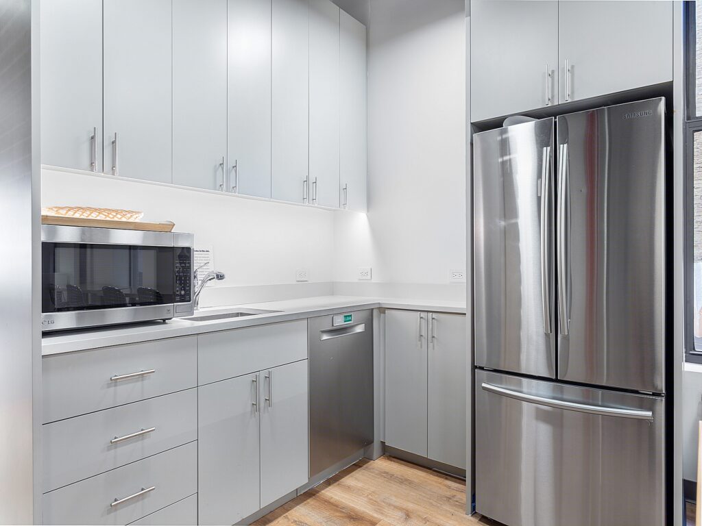 At the southwest corner, a modern kitchen pantry is outfitted with full-size stainless steel appliances including a French-door refrigerator, dishwasher, microwave, and extensive cabinet storage. A wide center island doubles as a communal table with additional counter seating along the side wall, creating an ideal spot for informal meetings or midday breaks. The kitchen connects naturally with the open area, making it a central social node within the suite.