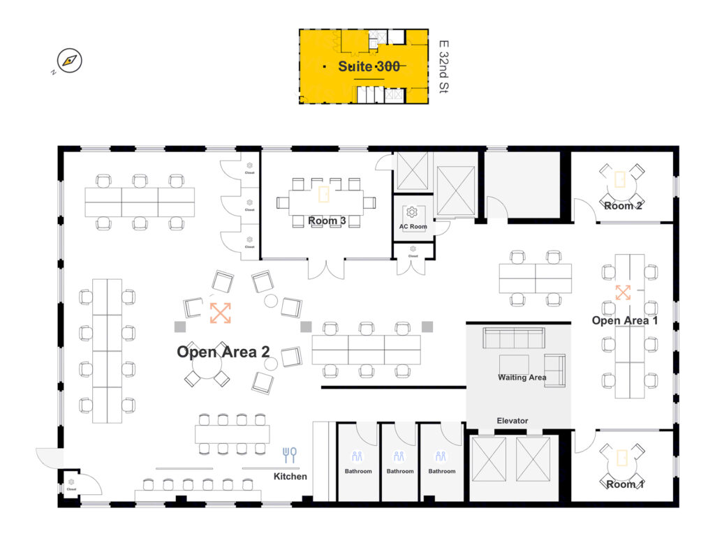 With dual open workspace zones, three perimeter rooms, a defined waiting area, and a fully-appointed kitchen, this Murray Hill Office Space for Rent provides a complete turnkey solution. Its full-floor identity, abundant natural light, and available furnishings—including desks, chairs, and seating—make it an ideal environment for boutique firms, creative teams, or professional services looking for a polished yet adaptable home base in Midtown South.
