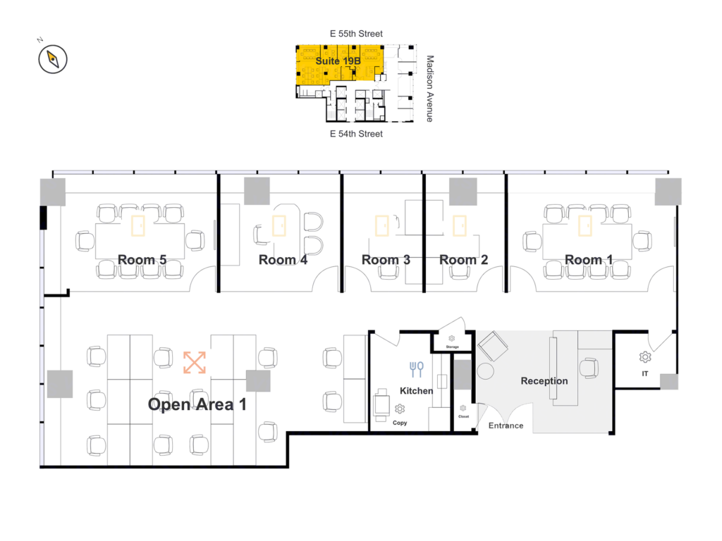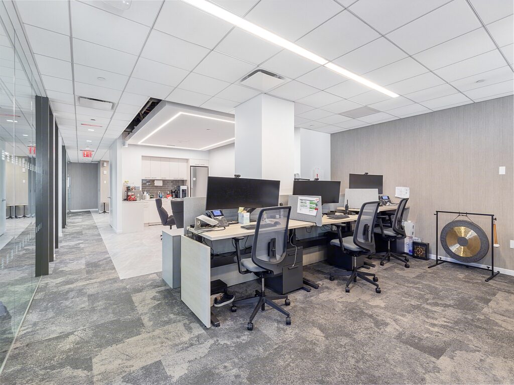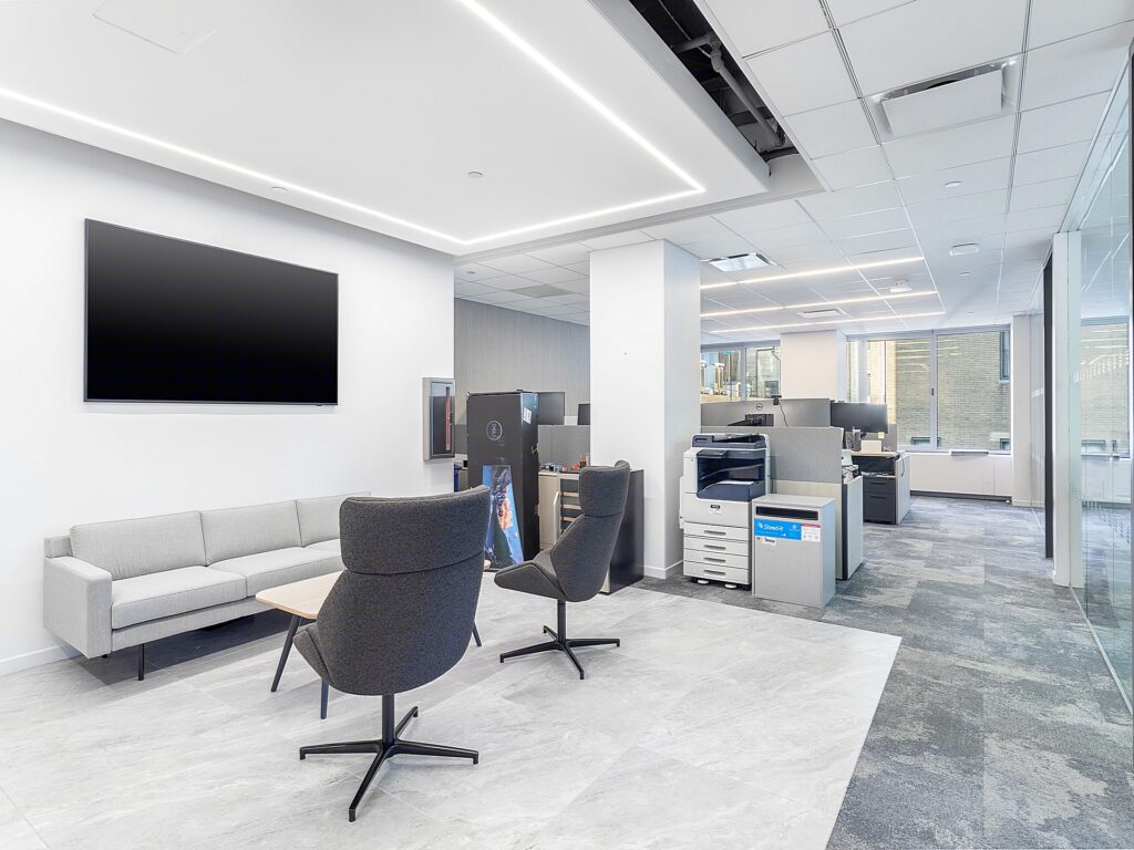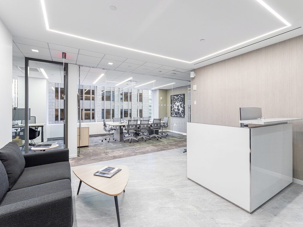 Office on Madison and Fifth – Suite 19B on the partial 19th floor presents a polished, thoughtfully built environment in a distinguished Madison Avenue tower. The suite has been designed to comfortably support up to 26 professionals across a flexible layout that balances private focus areas with shared workspaces, while capitalizing on natural light and city views. The reception welcomes guests with clean lines and soft lighting, anchored by a glass-wrapped wood concierge desk and comfortable guest seating, setting a professional and approachable tone for any firm.