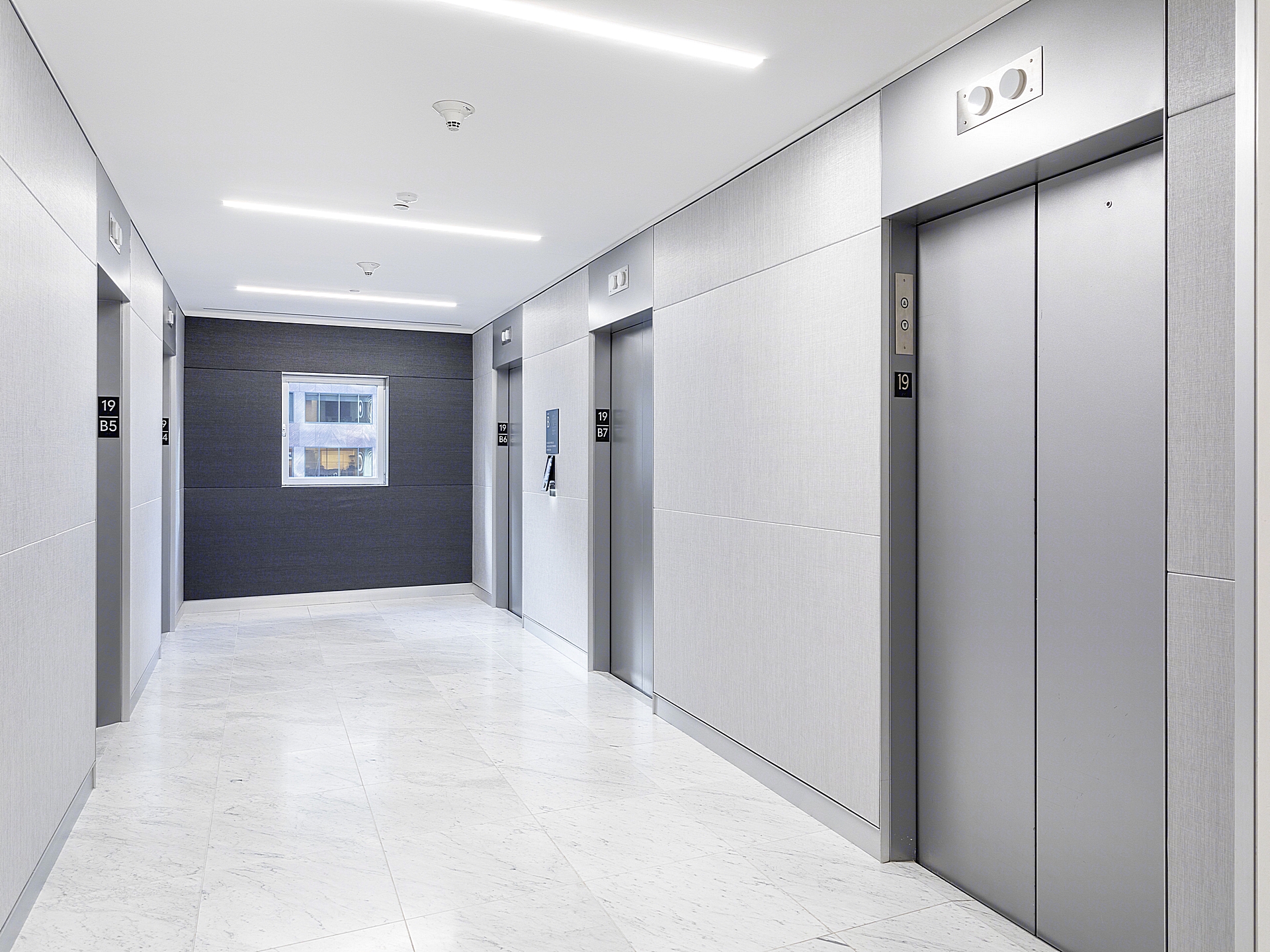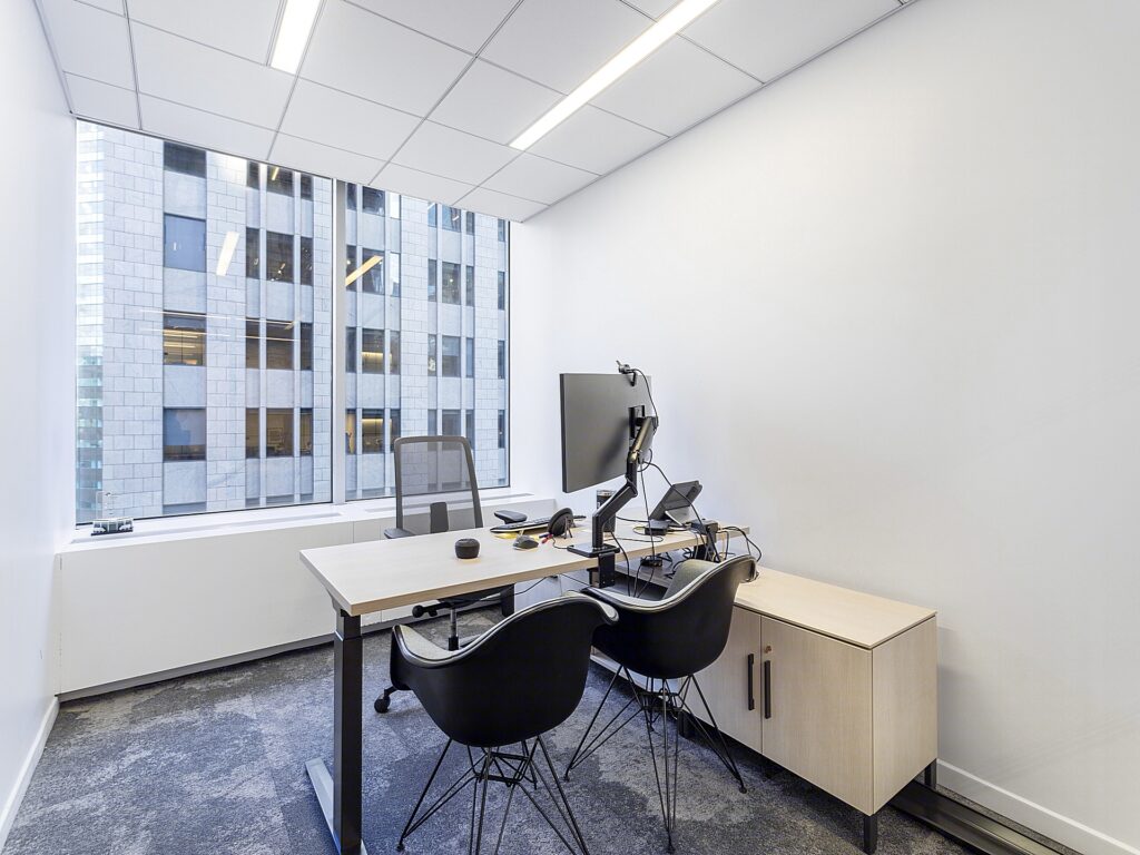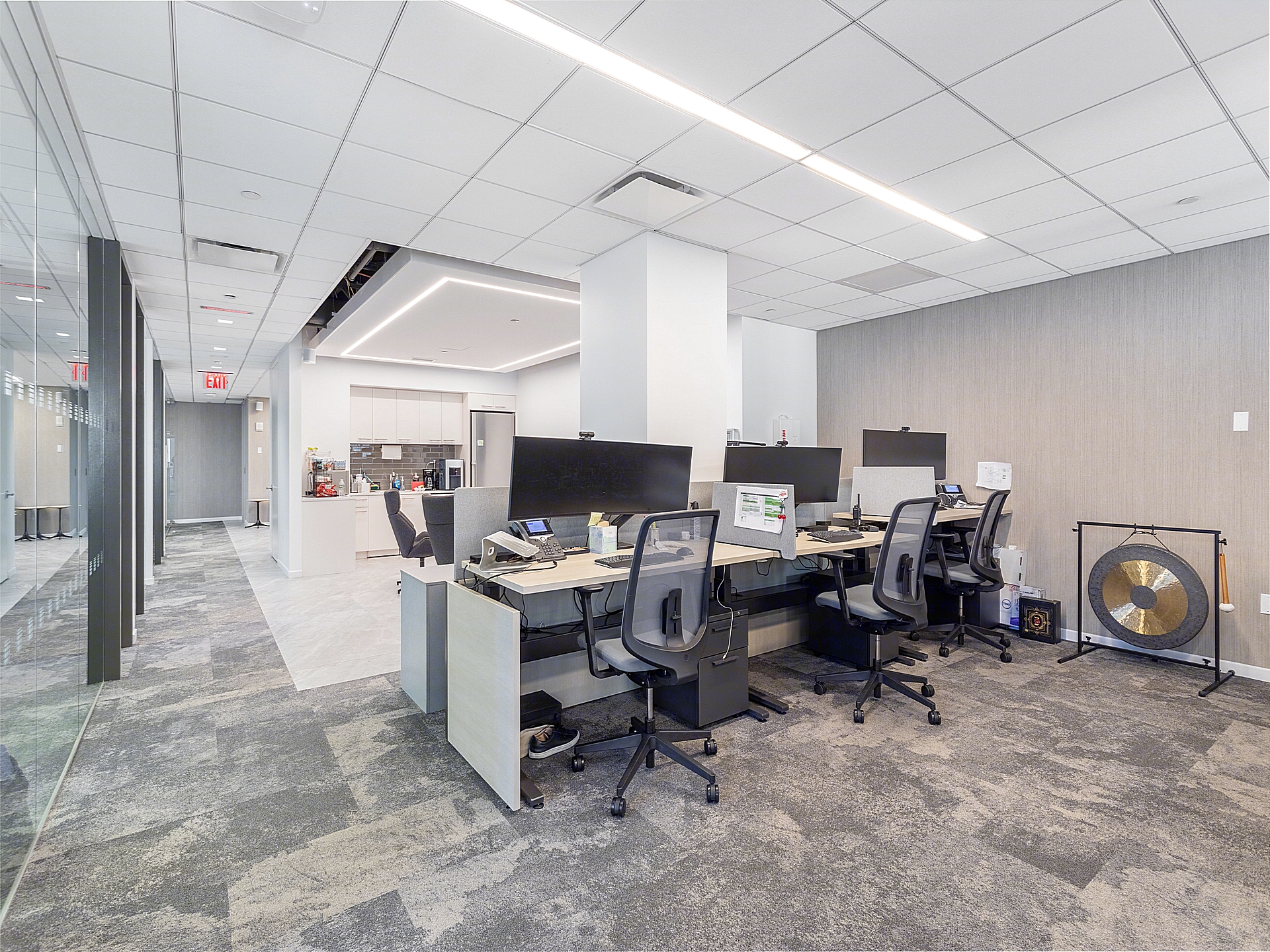 Office on Madison and Fifth – Suite 19B on the partial 19th floor presents a polished, thoughtfully built environment in a distinguished Madison Avenue tower. The suite has been designed to comfortably support up to 26 professionals across a flexible layout that balances private focus areas with shared workspaces, while capitalizing on natural light and city views. The reception welcomes guests with clean lines and soft lighting, anchored by a glass-wrapped wood concierge desk and comfortable guest seating, setting a professional and approachable tone for any firm.
