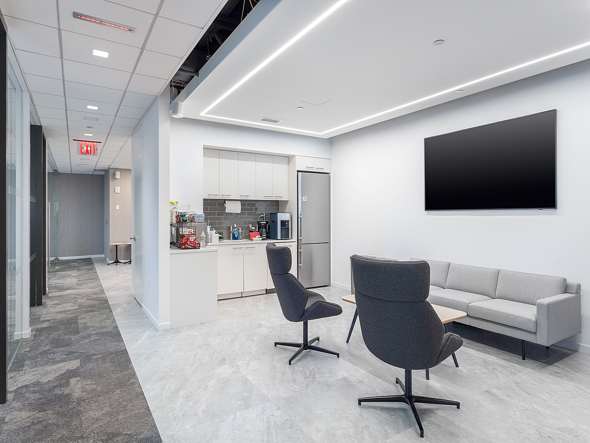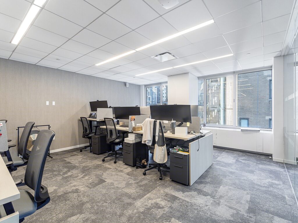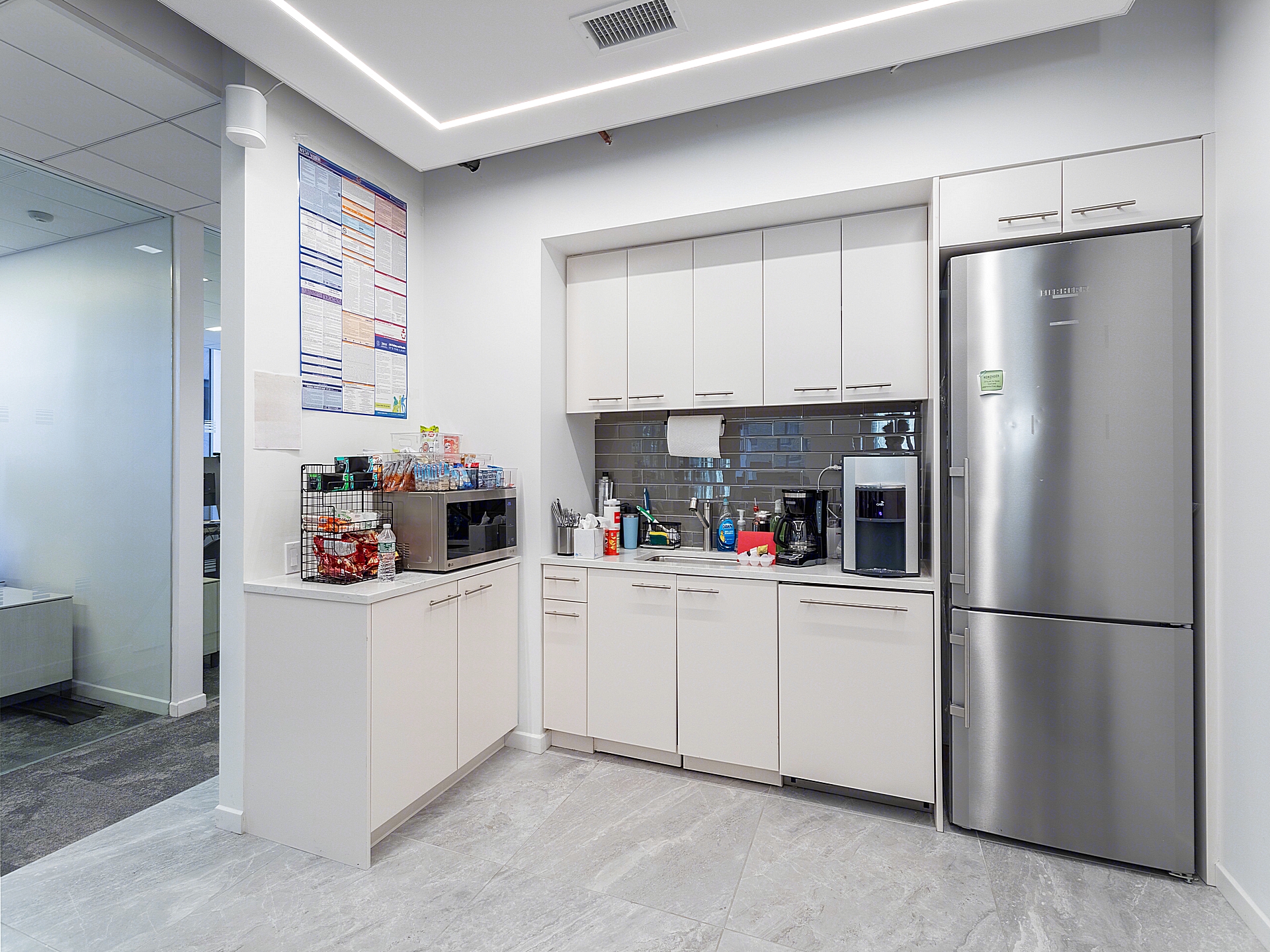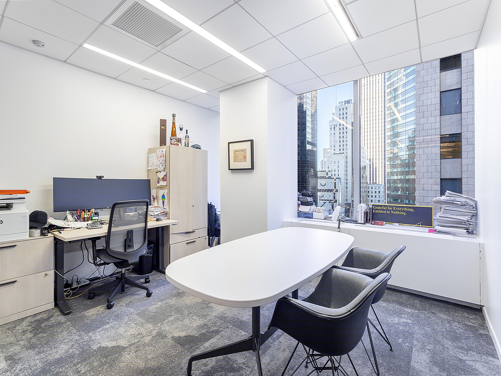 Near the center of the space, a full pantry includes modern stainless steel appliances, a coffee station, dishwasher, and filtered water service, creating a comfortable amenity hub for staff. There is a dedicated copy/print room and additional utility storage built out of view, allowing the rest of the suite to maintain a clean, uncluttered look. From reception to boardroom, every inch of the suite has been tailored for a high-performing professional Office on Madison and Fifth with the flexibility to evolve alongside a growing team. The suite’s elevated floor position, dual window lines, and premium finishes combine to create a refined and inviting workplace in the heart of Manhattan.