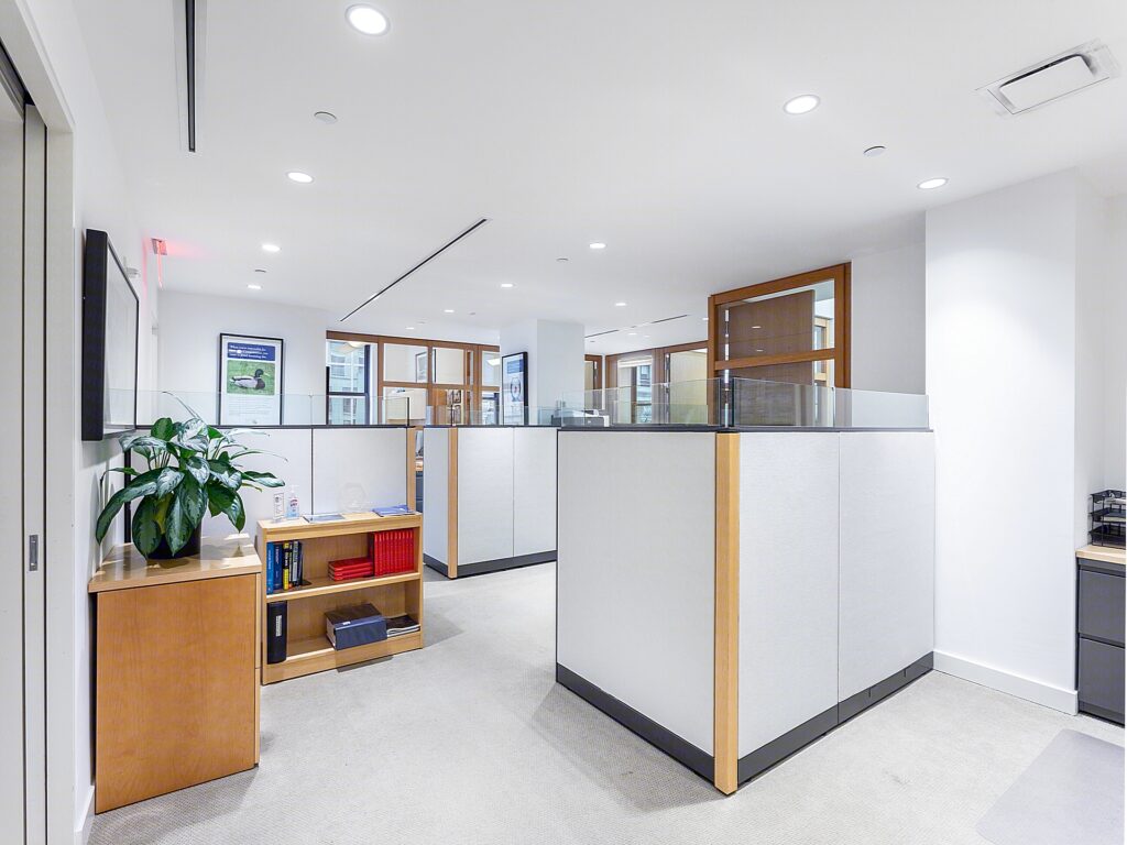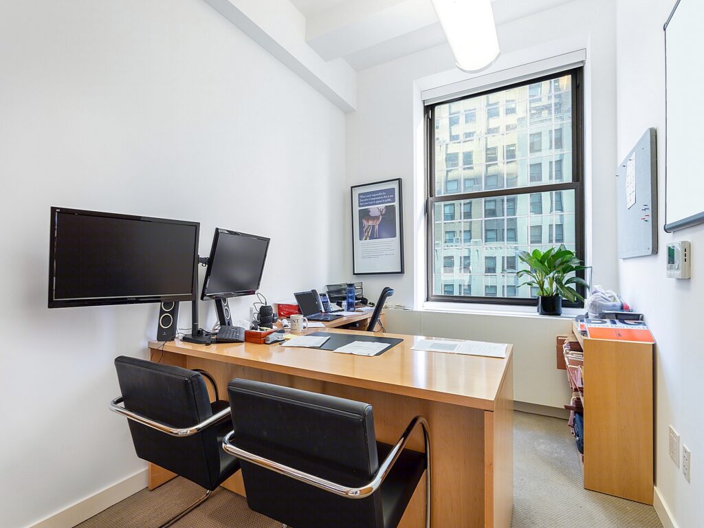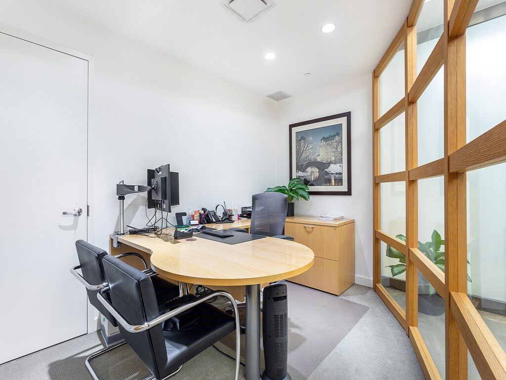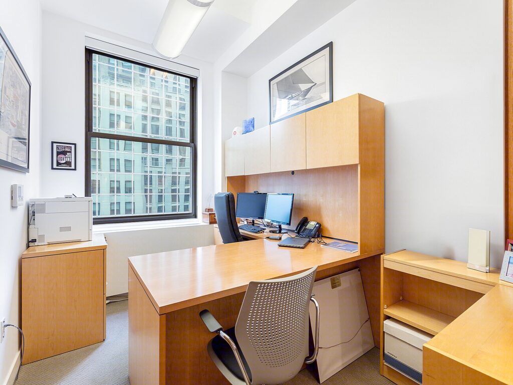At the core of the Plaza District NYC Office for Rent lies a shared pantry and kitchen area, adjacent to a dedicated print/copy room and a small utility nook. The thoughtful division of support spaces ensures noise is minimized near the open workstations. Clean white walls, bright recessed lighting, and light carpeting run throughout the unit, creating a cohesive and professional environment. With windows along the north and east perimeters, natural light is abundant, and the suite’s position within the building ensures a quiet, secure atmosphere. This plug-and-play office is turnkey ready for immediate occupancy, benefiting from ownership’s commitment to high-touch, tenant-oriented management.