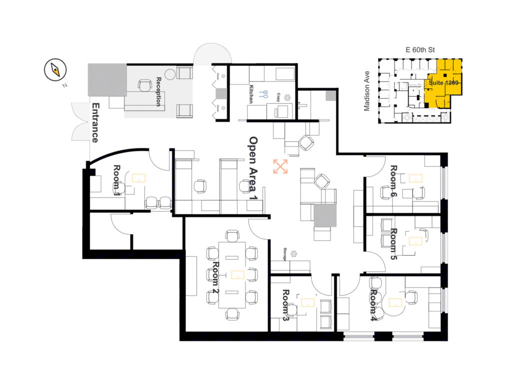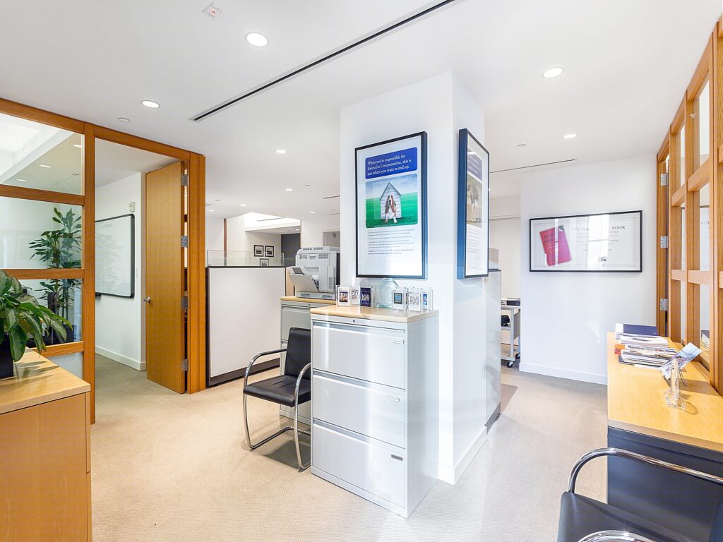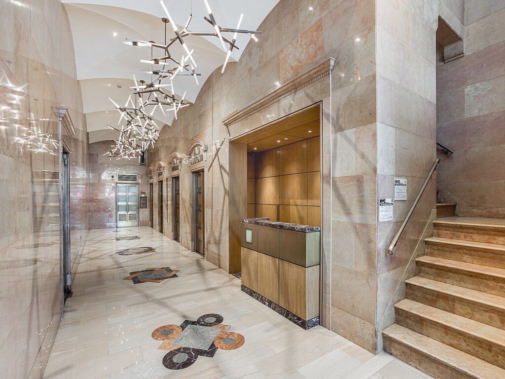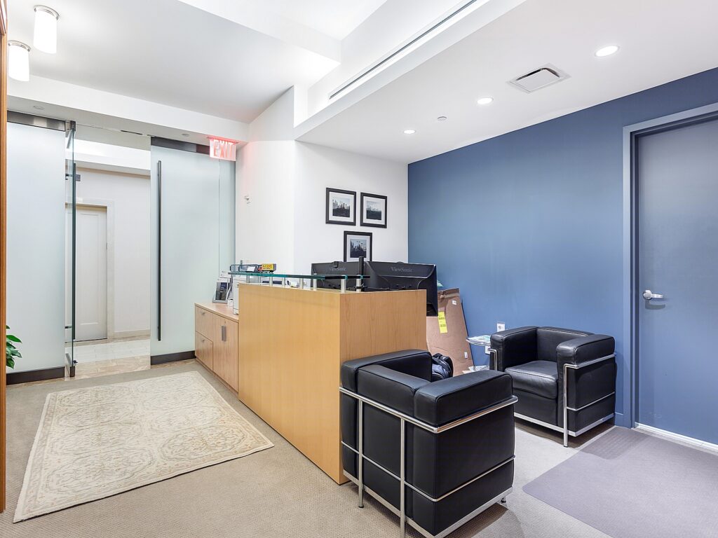 At the core of the Plaza District NYC Office for Rent lies a shared pantry and kitchen area, adjacent to a dedicated print/copy room and a small utility nook. The thoughtful division of support spaces ensures noise is minimized near the open workstations. Clean white walls, bright recessed lighting, and light carpeting run throughout the unit, creating a cohesive and professional environment. With windows along the north and east perimeters, natural light is abundant, and the suite’s position within the building ensures a quiet, secure atmosphere. This plug-and-play office is turnkey ready for immediate occupancy, benefiting from ownership’s commitment to high-touch, tenant-oriented management.