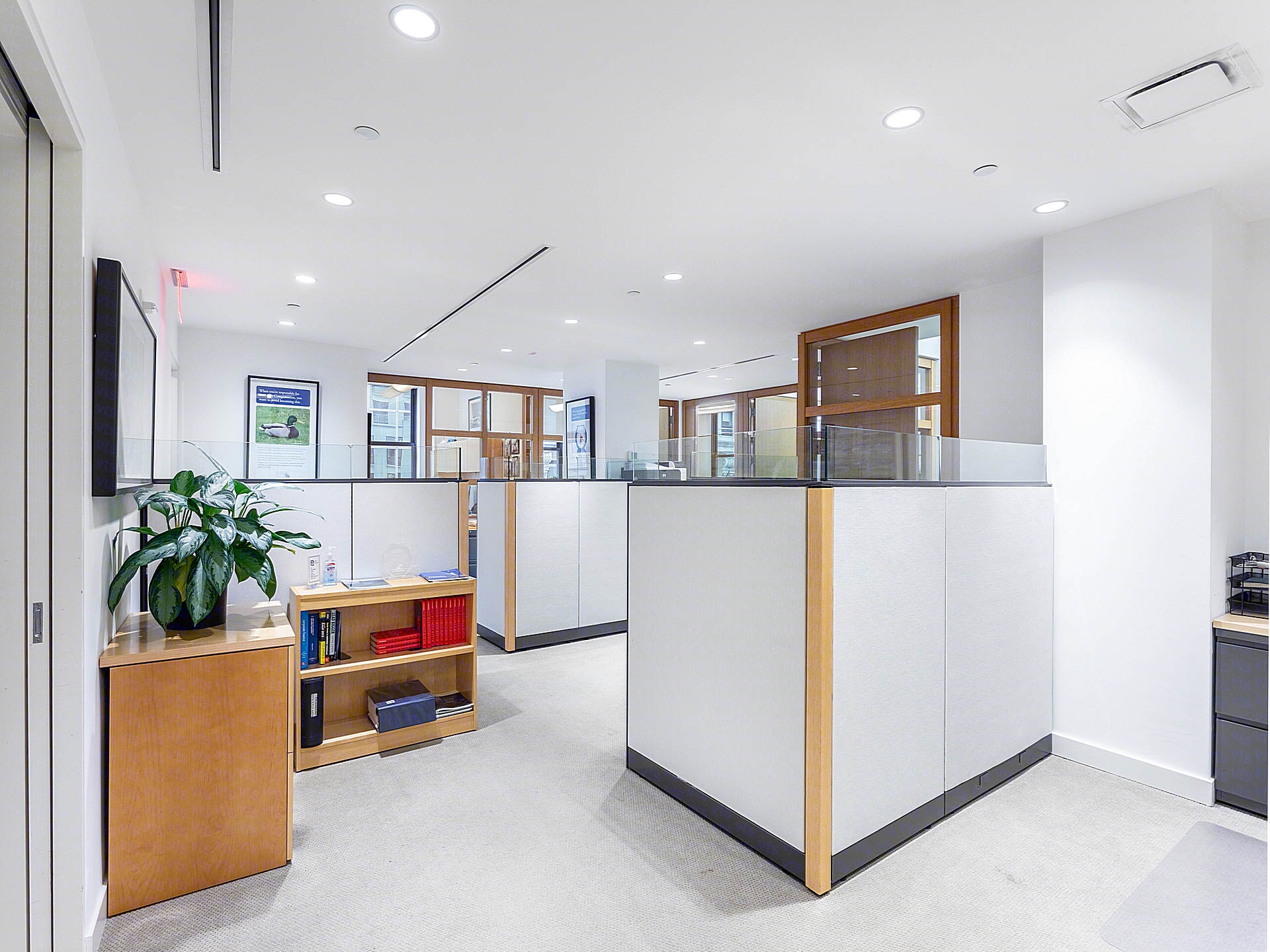 As you enter through a discreet, modern reception area outfitted with a stylish wood and glass concierge desk, the space sets a professional tone. To the left, a curved glass-partitioned office sits just beyond the reception, featuring a contemporary desk with dual guest seating, ideal for leadership, legal consultations, or senior staff needing privacy with visibility to the corridor. Continuing into the heart of the space, the corridor opens into a clean, bright open area with four to six workstations arranged along soft-partitioned cubicles—this central hub encourages quiet collaboration and easy movement between private rooms.