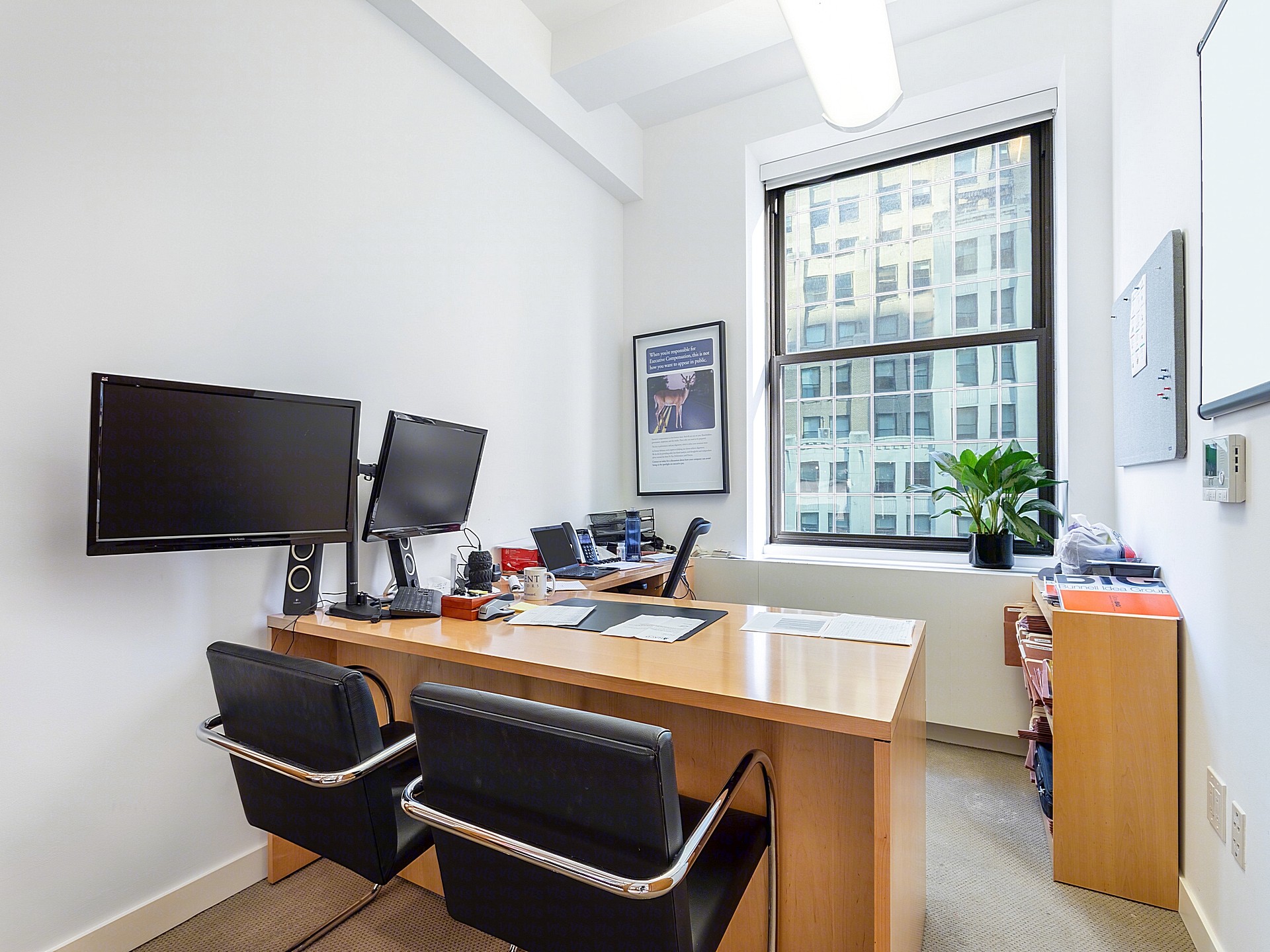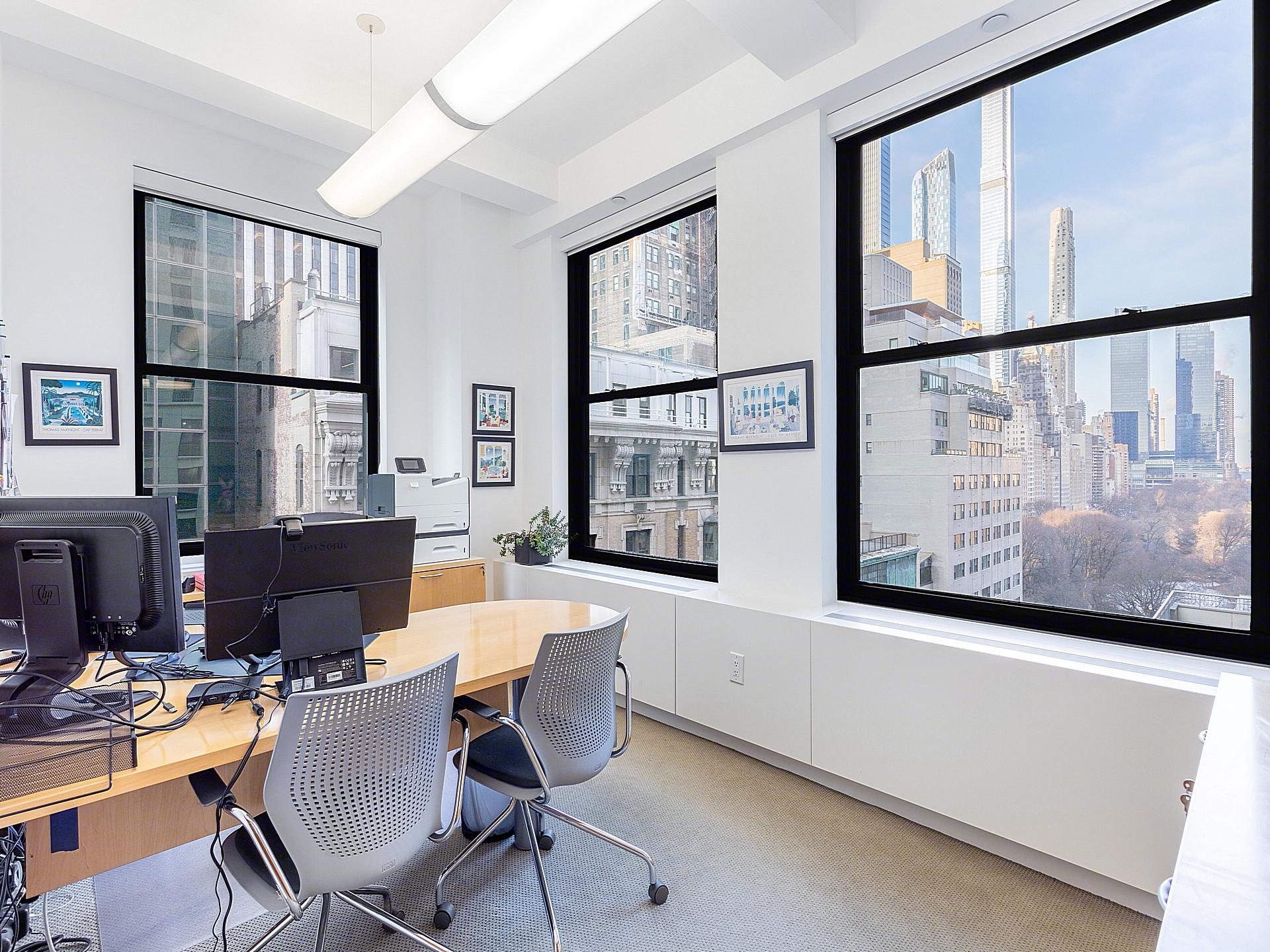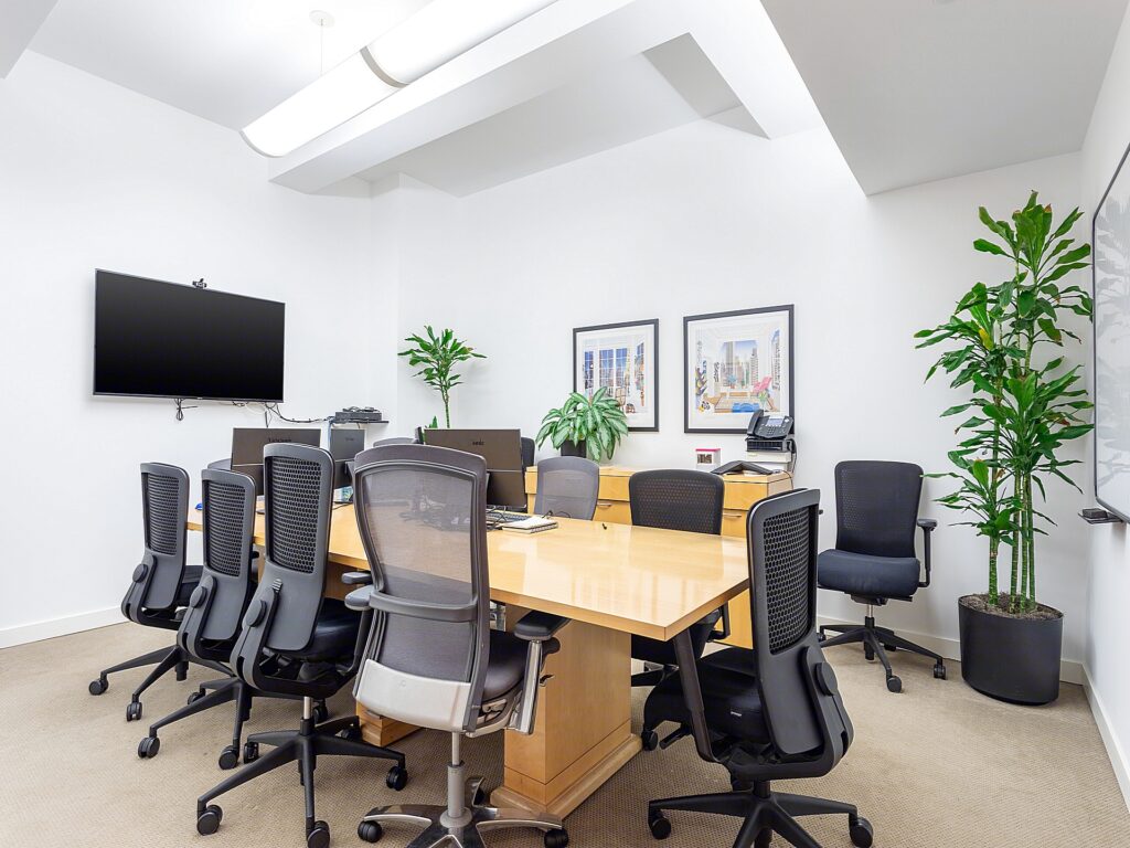 There are six perimeter offices or rooms, most of which feature large windows along two sides, flooding the offices with natural light and offering views of surrounding Midtown and glimpses of Central Park. These rooms are outfitted with sleek, matching wood casework and modern ergonomic seating. Rooms 1 and 3 are configured as executive-style offices, while Room 2 is built out as a formal conference room, comfortably seating 10 and equipped with wall-mounted video conferencing hardware, making it ideal for client presentations and internal meetings. Rooms 4, 5, and 6 can serve as a mix of junior offices or small meeting rooms, offering flexibility for growing teams or discrete operations.
