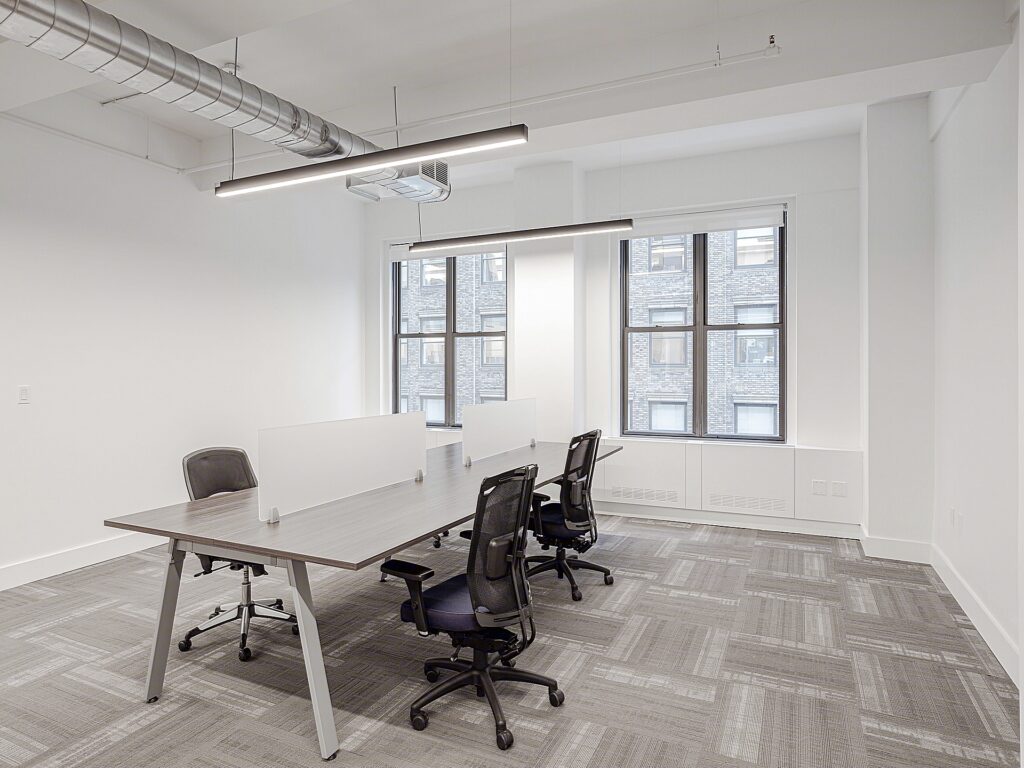 Polished Prebuilt Madison Avenue Office offers a full-floor presence that unfolds across approximately 4,580 square feet at 275 Madison Avenue, delivering a highly functional layout anchored by 22 workstations, 2 private offices, 1 meeting room, and 1 conference room, all organized with a clear sense of flow and perimeter access. The entry sequence leads directly into a defined reception area, scaled appropriately for a front-facing business, where a dedicated desk position greets visitors while maintaining separation from the main working zones. Just beyond, circulation opens into a broad open work environment where 22 workstations are arranged across multiple benching clusters, allowing for team-based seating while preserving generous aisles and sightlines across the floor.
