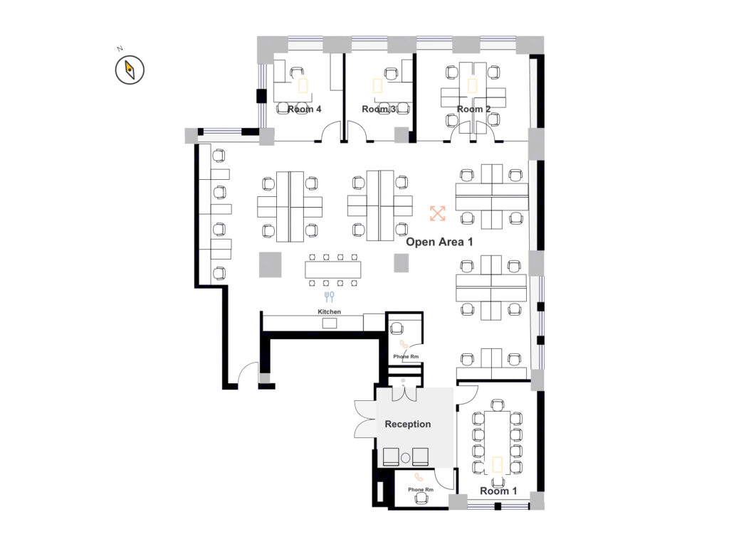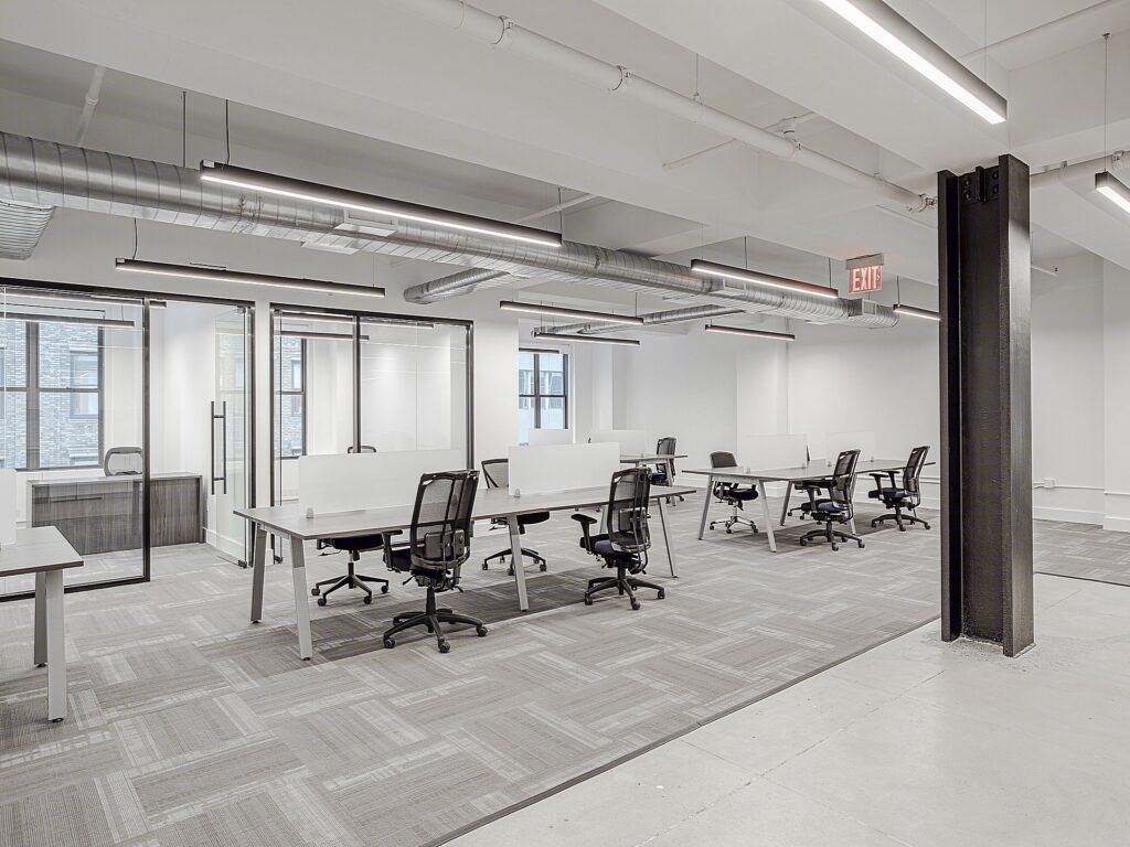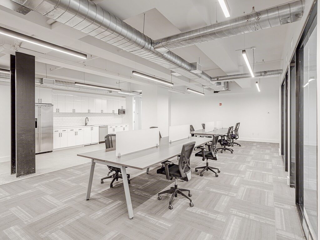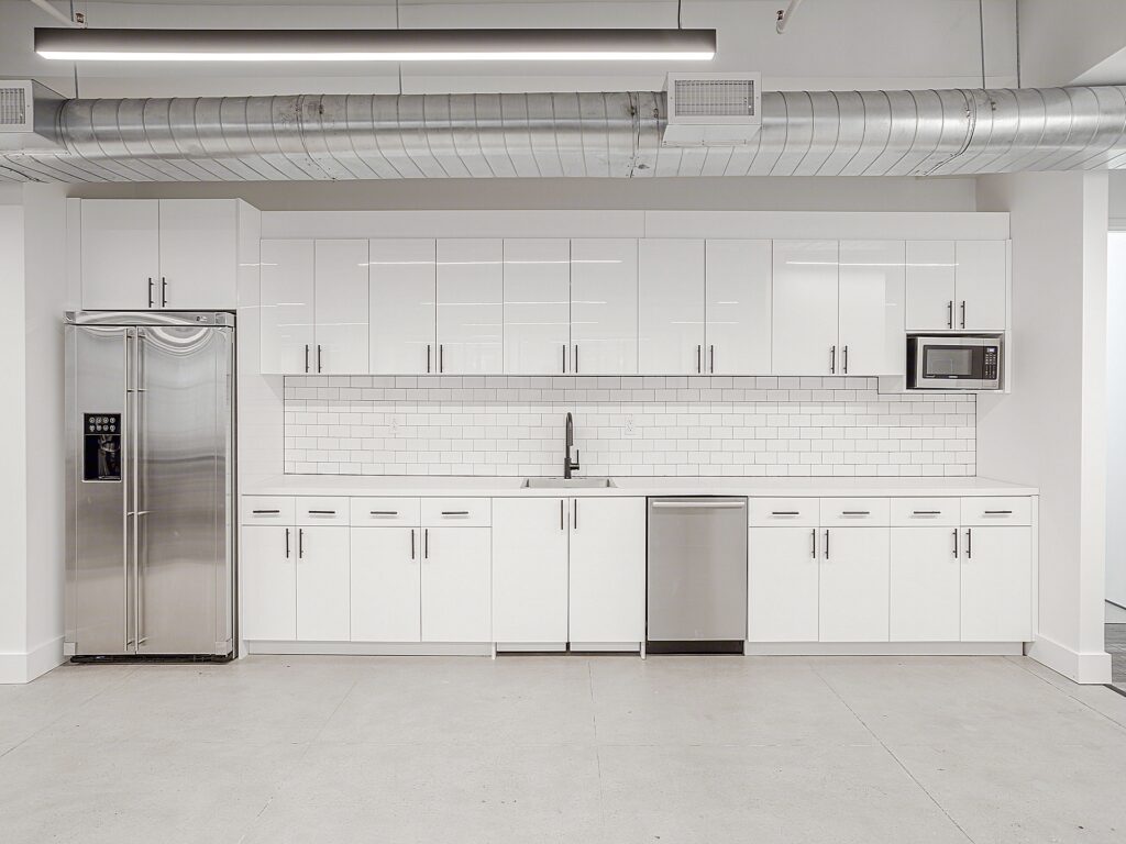 The central open area is reinforced by exposed ceiling elements and linear lighting that emphasize ceiling height and create a clean, modern aesthetic, while structural columns are integrated into the layout without interrupting workflow. Along the interior core, a built-in pantry and kitchen installation provides a clean, efficient break area with cabinetry, countertop workspace, and room for appliances, positioned conveniently between the reception and main workspace. Nearby, dedicated phone rooms offer enclosed privacy for calls, interviews, or focused work, enhancing the overall usability of the floor.