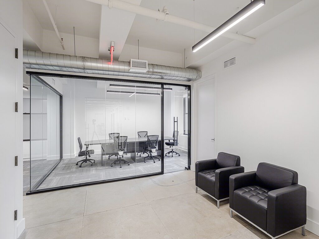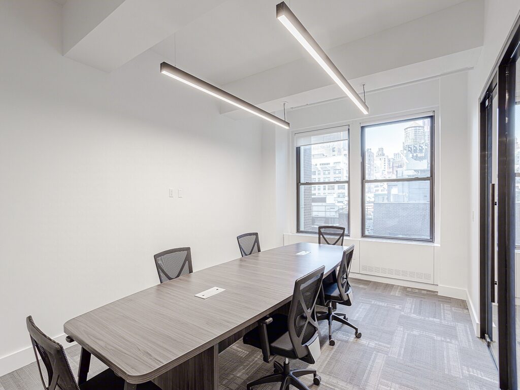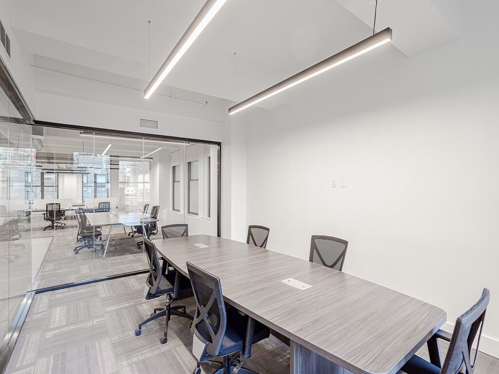 Perimeter planning is thoughtfully executed, with four enclosed rooms lining the windowed edges of the space. Two of these rooms function as private offices, each sized for executive use with room for desks, guest seating, and storage, while maintaining direct access to natural perimeter exposure. A dedicated conference room is positioned along the window line and accommodates a full meeting table with surrounding seating, making it well-suited for formal presentations, client meetings, or internal strategy sessions. Adjacent to the open area, a separate meeting room provides a more intimate setting for smaller group discussions or breakout collaboration, ensuring operational flexibility without disrupting the primary workstation floor.