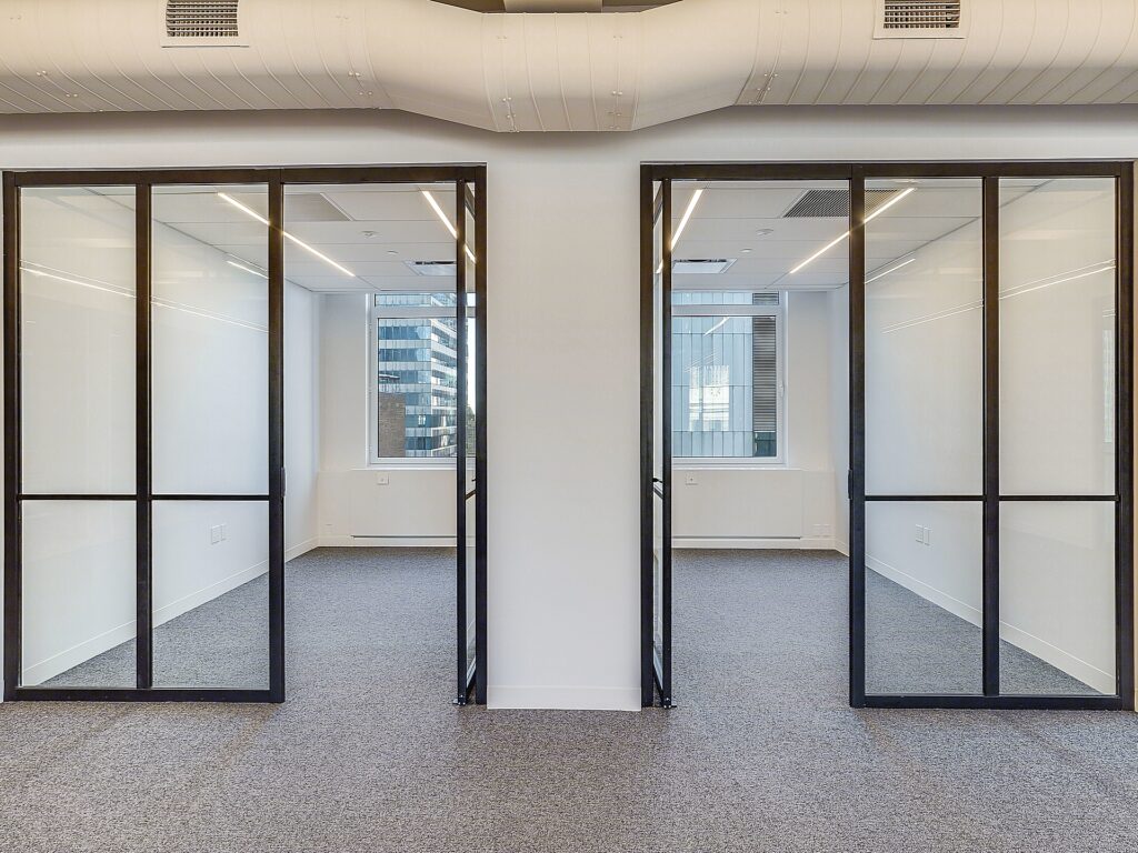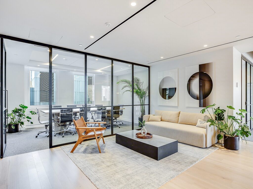 Two conference rooms are integrated into the layout, positioned for both internal accessibility and client-facing functionality. These rooms are enclosed with full-height glass fronts, allowing light to travel through the space while maintaining acoustic separation, and each is sized to accommodate formal meetings, presentations, or team gatherings without encroaching on the open workstation environment. Circulation throughout the suite is intuitive, with clear pathways connecting reception, work areas, offices, and meeting rooms in a way that minimizes disruption and maximizes usability.