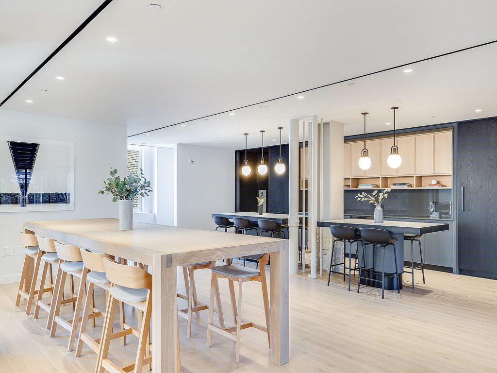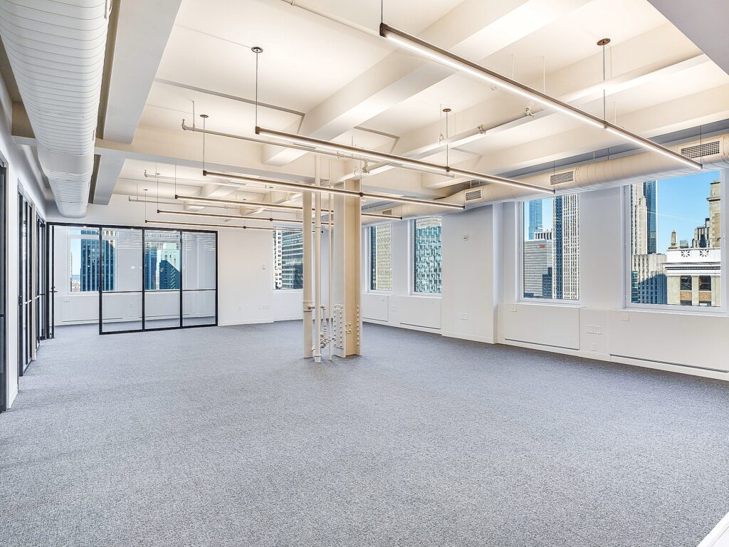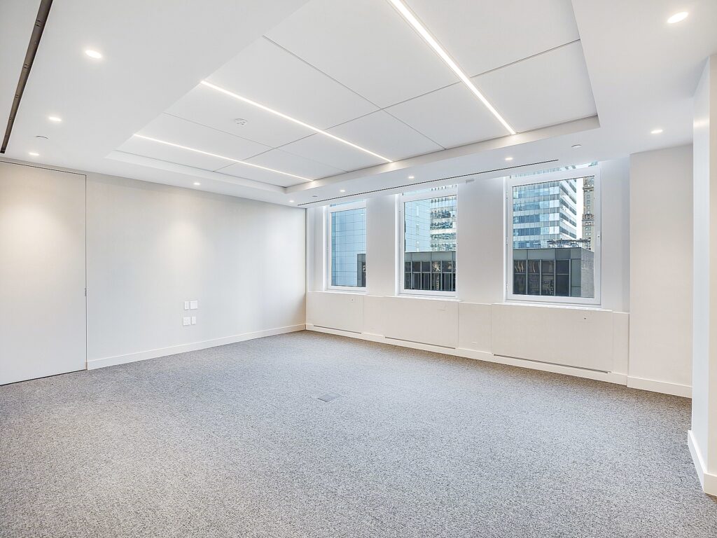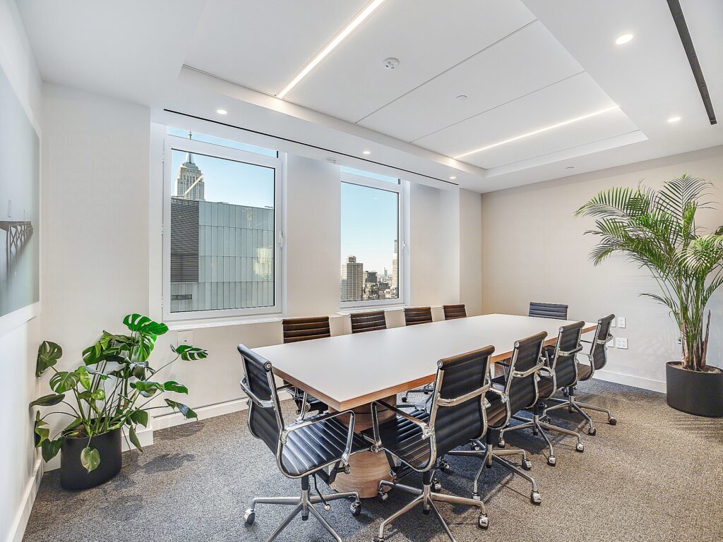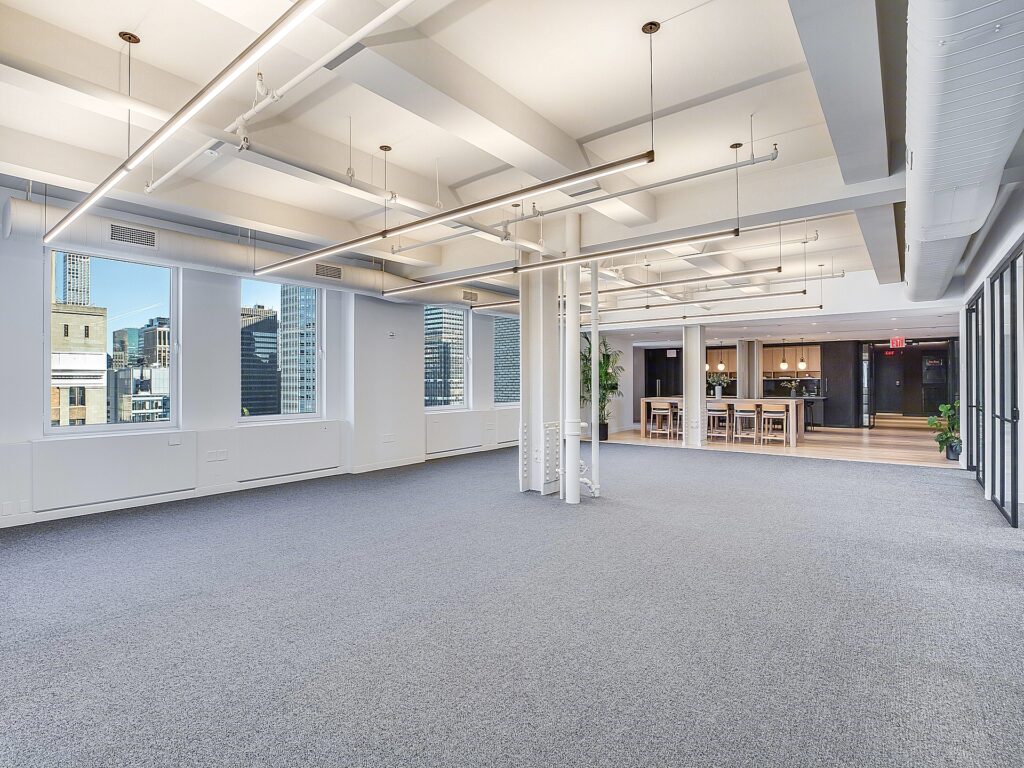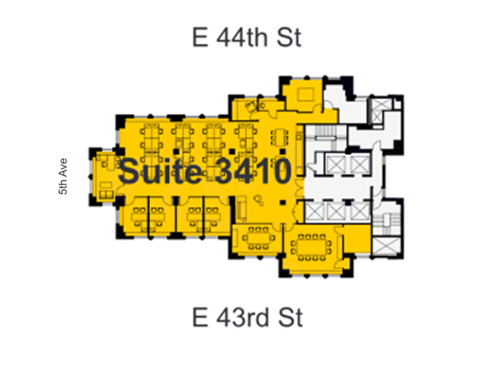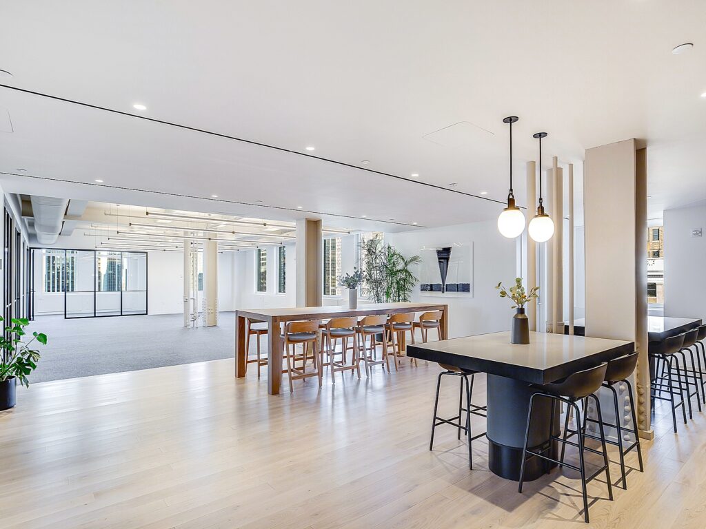 The ceiling heights, exposed structural elements, and modern lighting design contribute to a contemporary office aesthetic, while the combination of soft seating, café-style breakout areas, and structured work zones creates a layered workplace environment. Windows wrap multiple sides of the floor, bringing consistent daylight deep into the plan and reinforcing the open, airy feel of the space. The result is a highly functional layout where 29 workstation seats, 6 private offices, and 2 conference rooms are supported by a strong amenity core, making the suite well suited for firms seeking a turnkey Small Fifth Avenue Full Floor office with both presence and performance built directly into the floorplan.