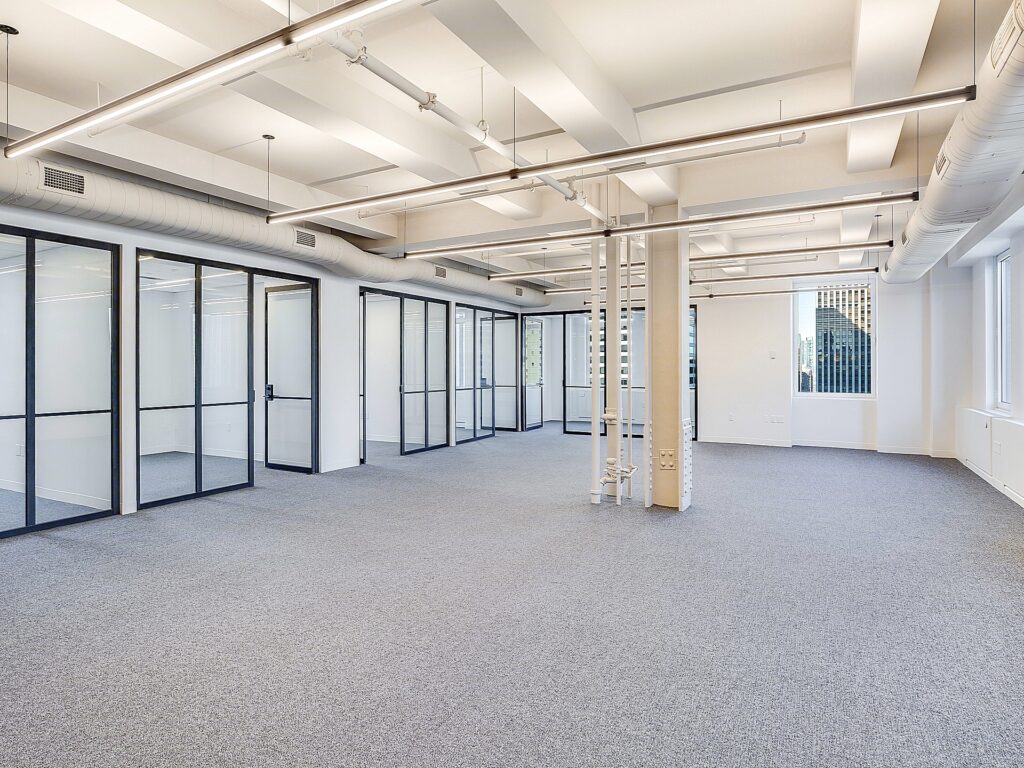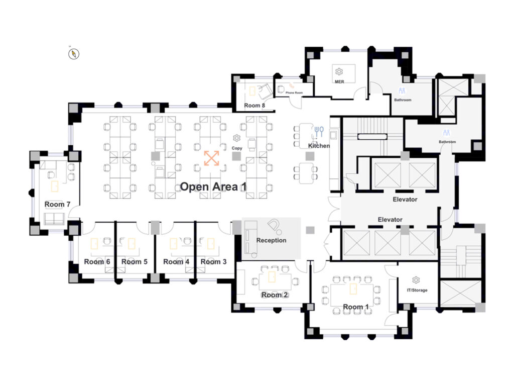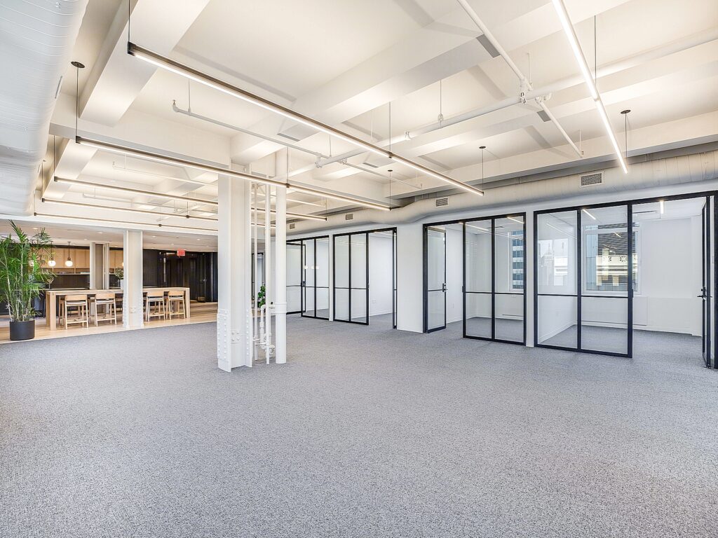 Beyond reception, the floor opens into a broad central work area where the 29 workstation seats are distributed across an open plan that benefits from generous spacing, clear sightlines, and a column grid that supports efficient team clustering without interrupting workflow. The open area transitions seamlessly toward the glass-fronted perimeter rooms, where 6 private offices line the windowed exterior walls. Each of these offices is fully enclosed and appropriately scaled for executive use, senior staff, or dedicated focus rooms, and their placement along the perimeter ensures consistent daylight penetration and exterior views across multiple exposures.
