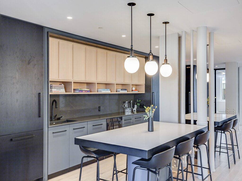 Small Fifth Avenue Full Floor style presence within the tower floor at 521 Fifth Avenue delivers a polished, turnkey installation built around 29 workstation seats, 6 private offices, and 2 conference rooms, all organized within a layout that balances open collaboration with a strong perimeter office component. Entry into the suite leads through a defined reception area that is anchored by a clean front desk and an adjacent hospitality-driven kitchen and café-style seating zone, where a large island, bar seating, and communal tables establish an immediate sense of arrival and create a natural hub for staff interaction, informal meetings, and daily use.
