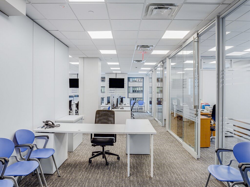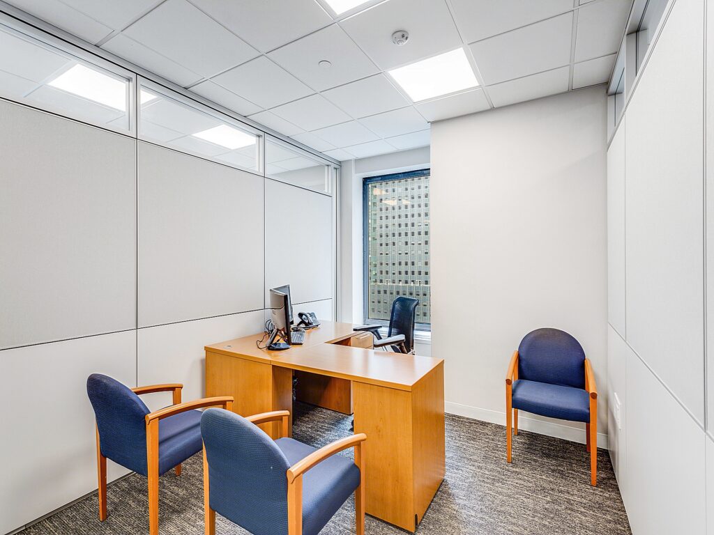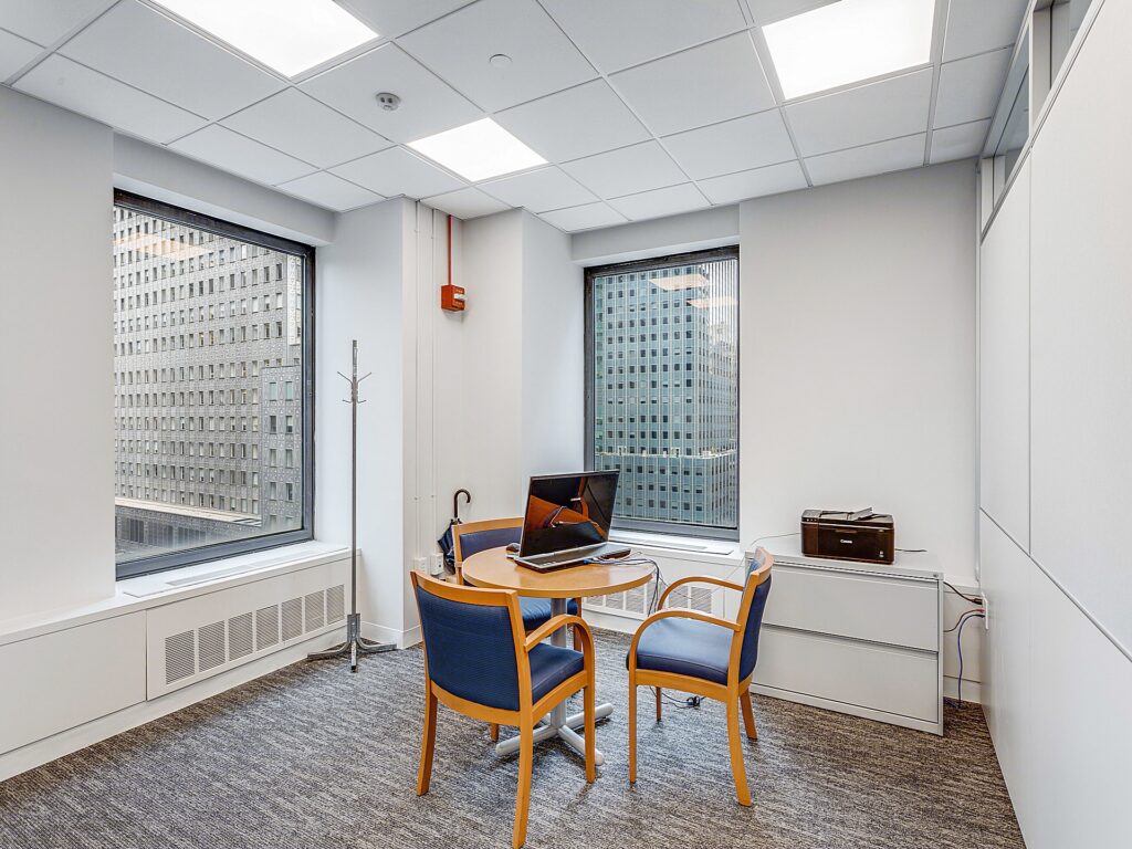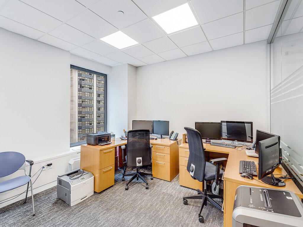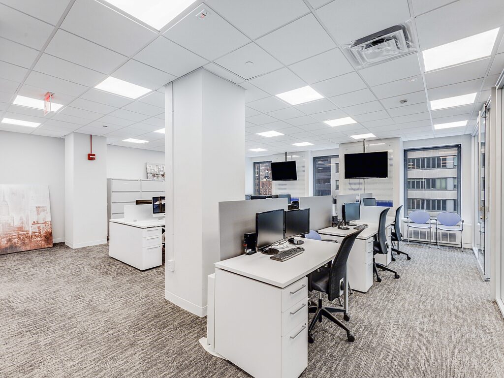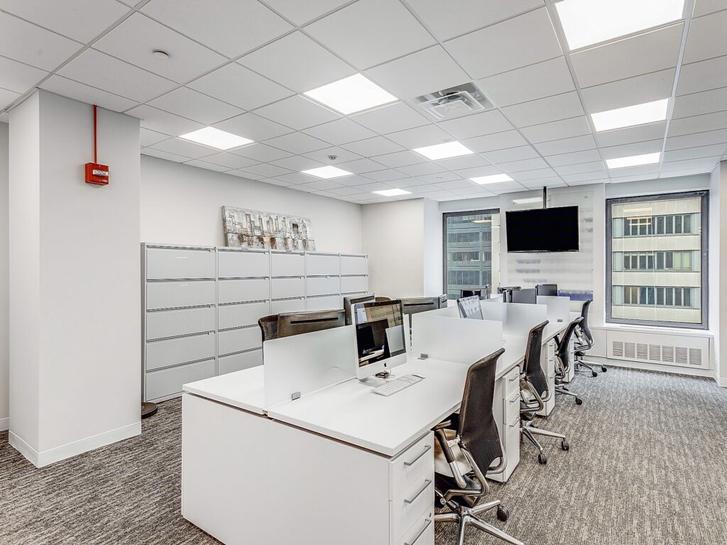 This Small Third Avenue Workspace benefits from exposure along the perimeter, bringing consistent daylight into both the open workstation area and enclosed rooms. While this is not a full-floor installation, the compact and clearly defined layout creates a strong sense of identity and usability within its footprint. The combination of 8 workstations, 3 private offices, 1 conference room, and a formal reception with front desk presence delivers a well-balanced environment tailored for firms that prioritize both client experience and day-to-day functionality in a Grand Central-adjacent location.